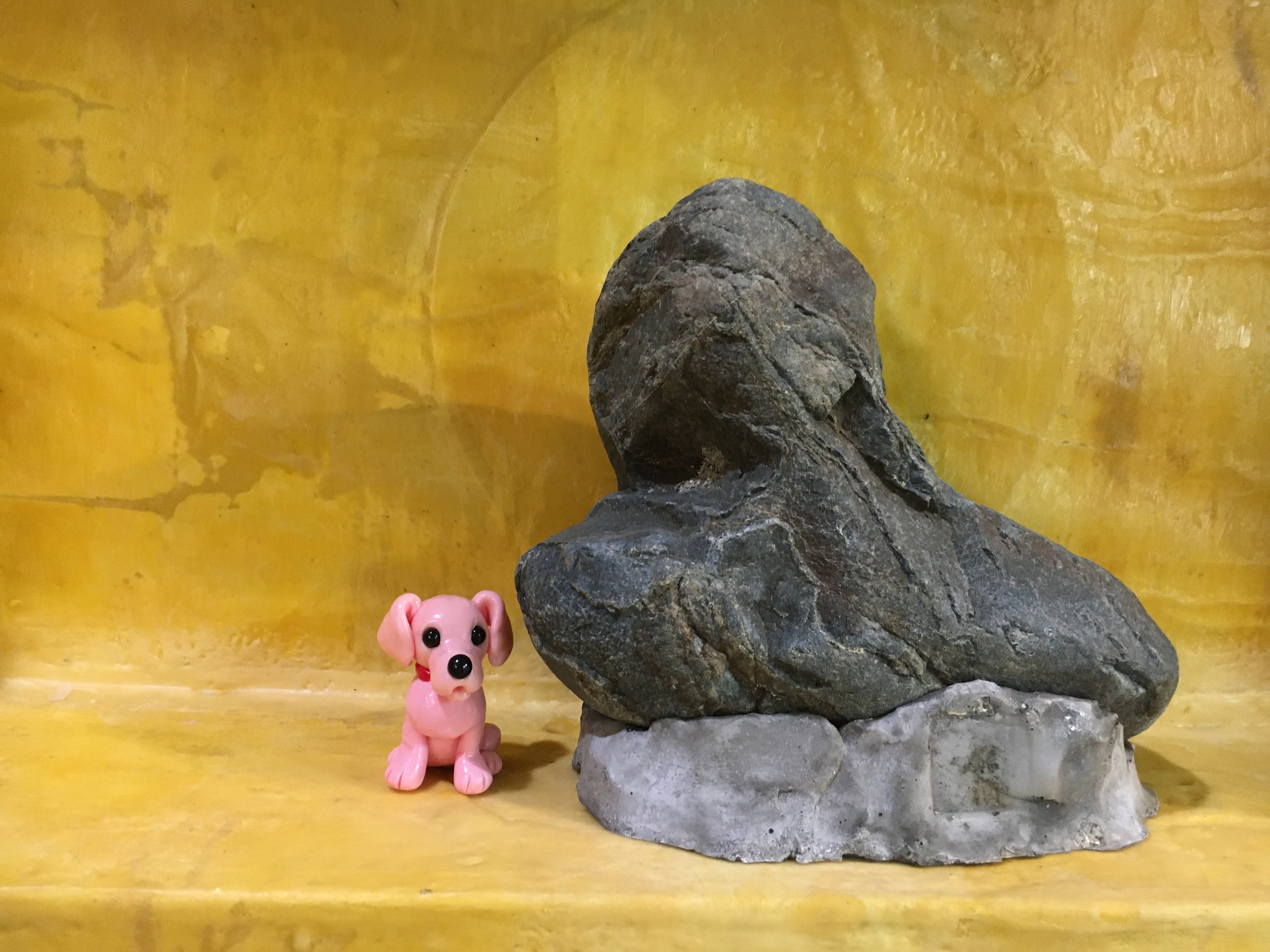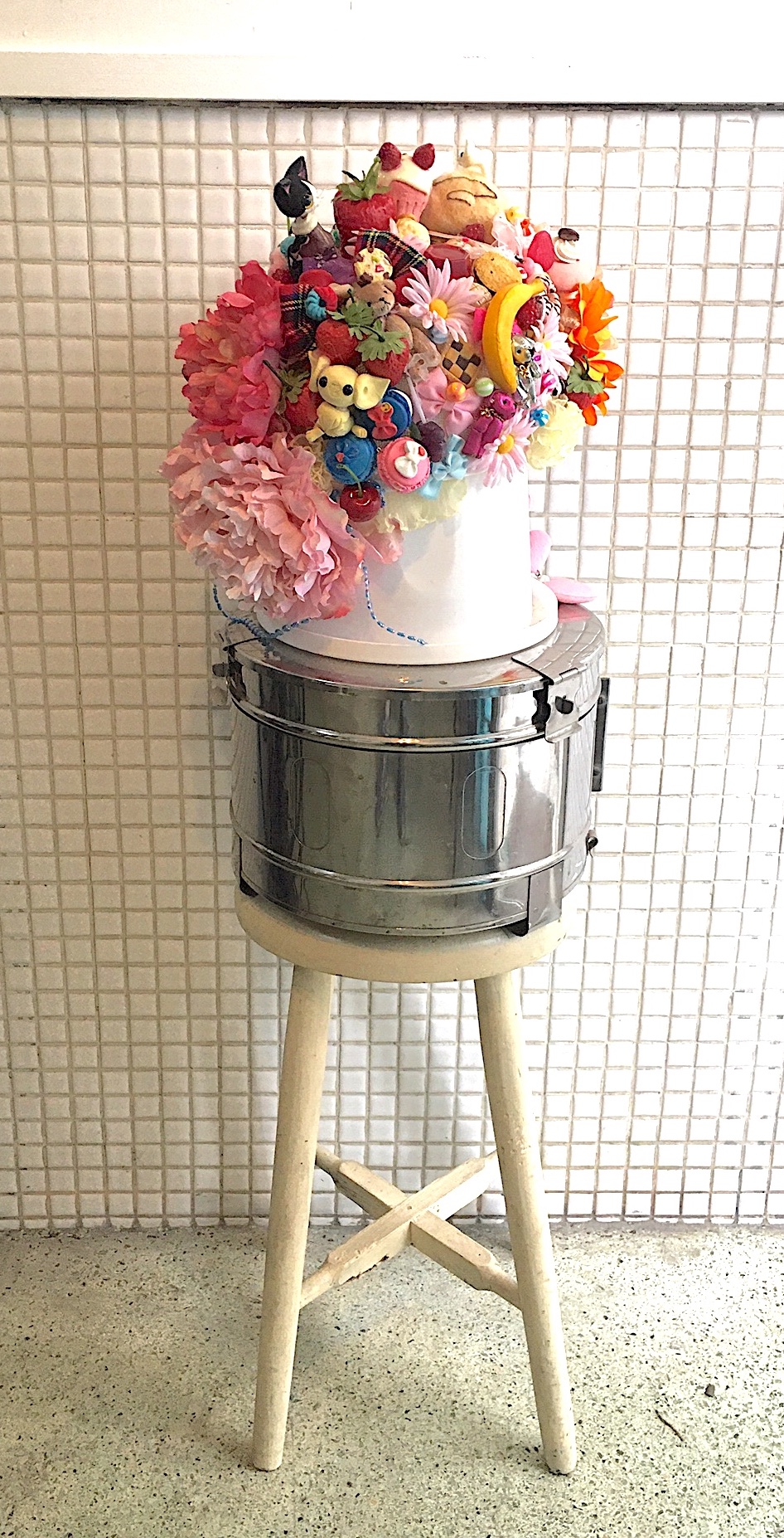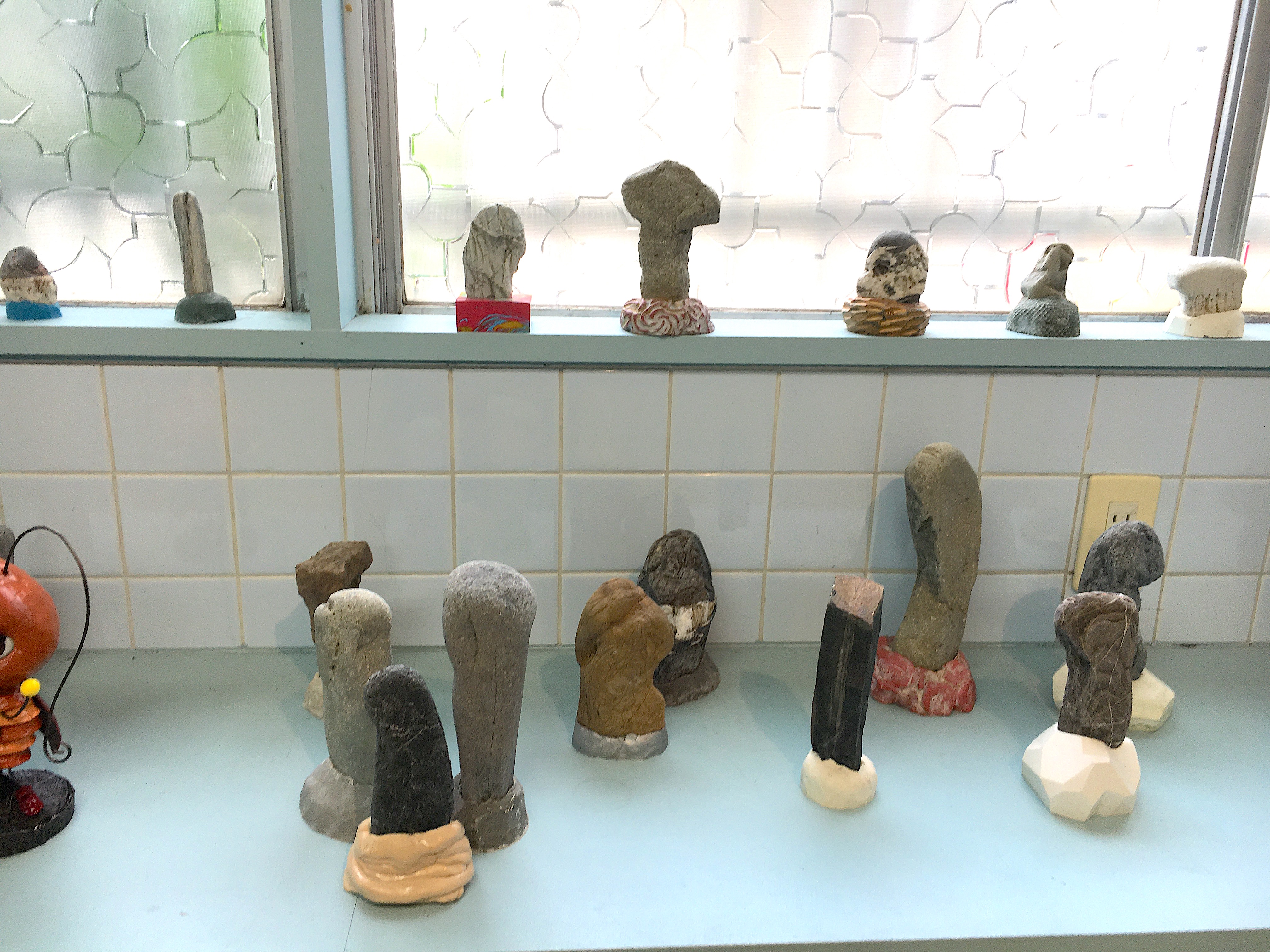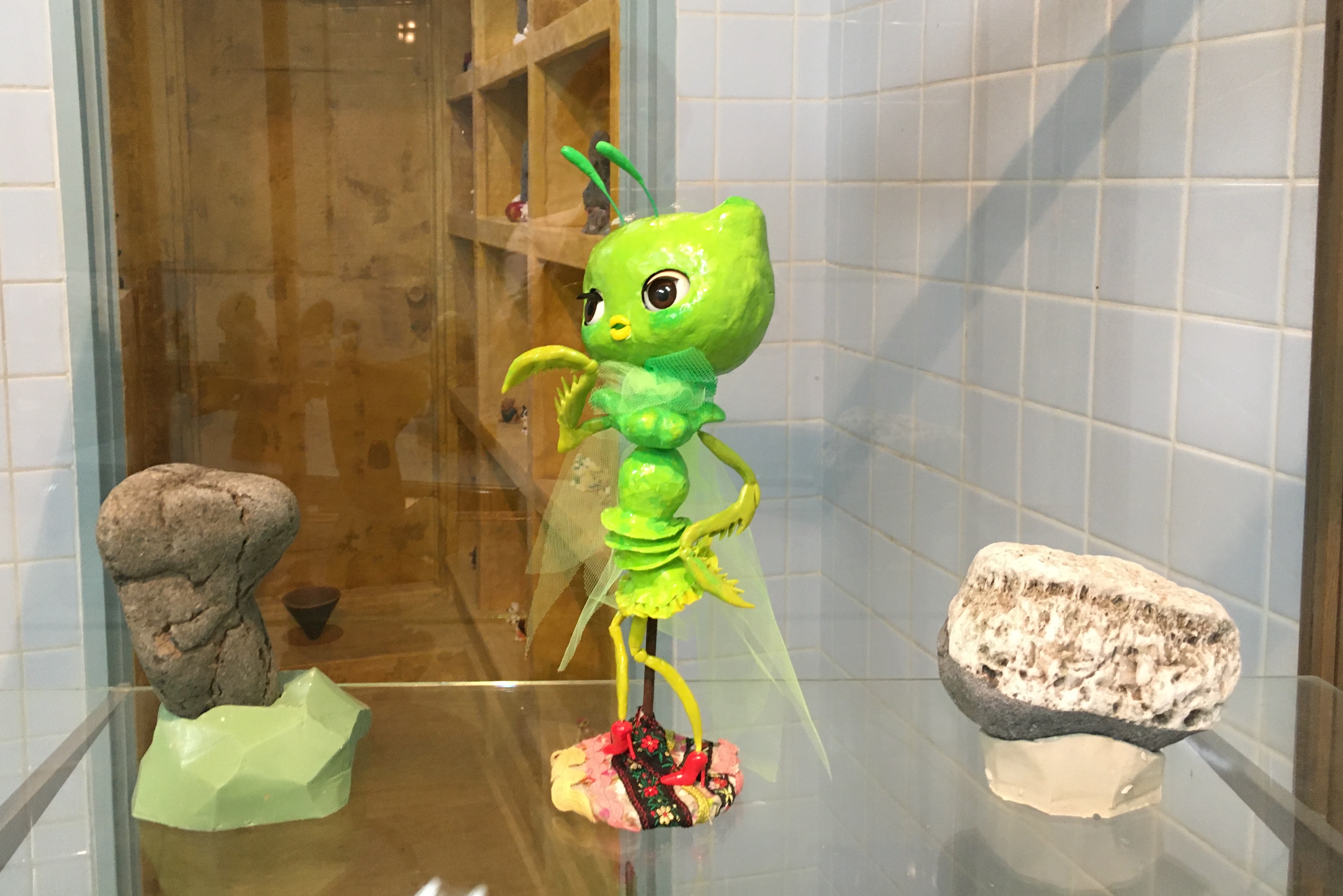 モチーフに過剰な要素を加えて「かわいい」という感性を刺激すること、それは古来より工芸等で用いられてきた日本の伝統的手法であり、「たおやめぶり」な女性文化力に基づくものと言える。これら「昆虫人形」は実家の小鳥屋で夏に売っていたカブトムシやクワガタをめぐる幼少期の記憶をもとにしたもので、愛らしい動物をより愛らしく表現する「アニマルデコ」とはやや趣を変え、コロナ禍の影響もあるのか、かわいらしい表層の奥に生々しい生と死の気配が漂うものとなっている。まさに「現代的」でありながら、「本質的」でもあるのだ。まるで導祖神のような久保田の「根石」もまた歴史的に連綿と続く日本の自然崇拝のありようや共同体意識を探る営みのようにも捉えられるが、鈴山の「昆虫人形」との「出会い」をとおし、相互の本質的要素が共鳴することで、その男性性にひそむ「性」の複雑さや多様性が明らかにされていく(当然のことながら「勃起」の現象もまた男性固有のものではない)。まさにOperation Tableのミッションである「異種の出会いの衝撃」を具現化した展示であり、「爆発姐」とは鈴山自身の爆発(表現)であると同時に、そのオブジェが起爆装置として作用し、「根石」から様々な思考が引き出されていくことの謂でもあるのだろう。
