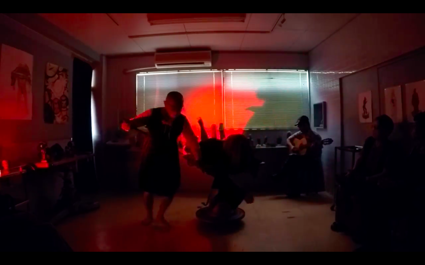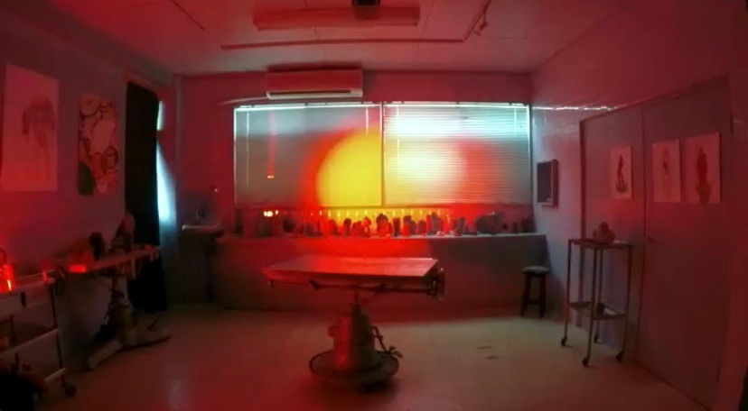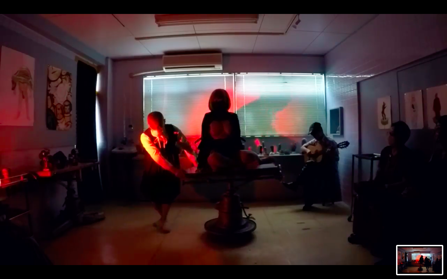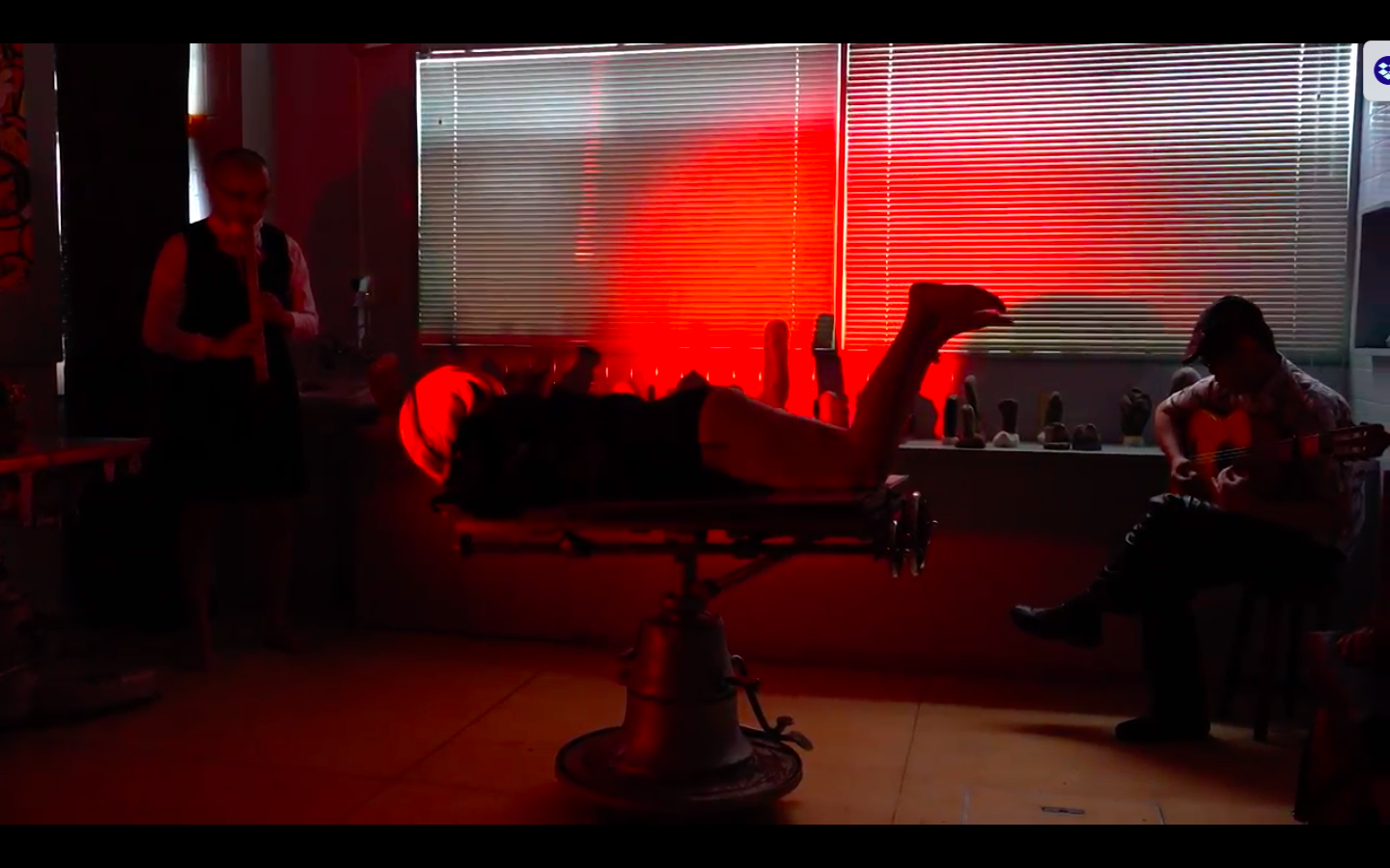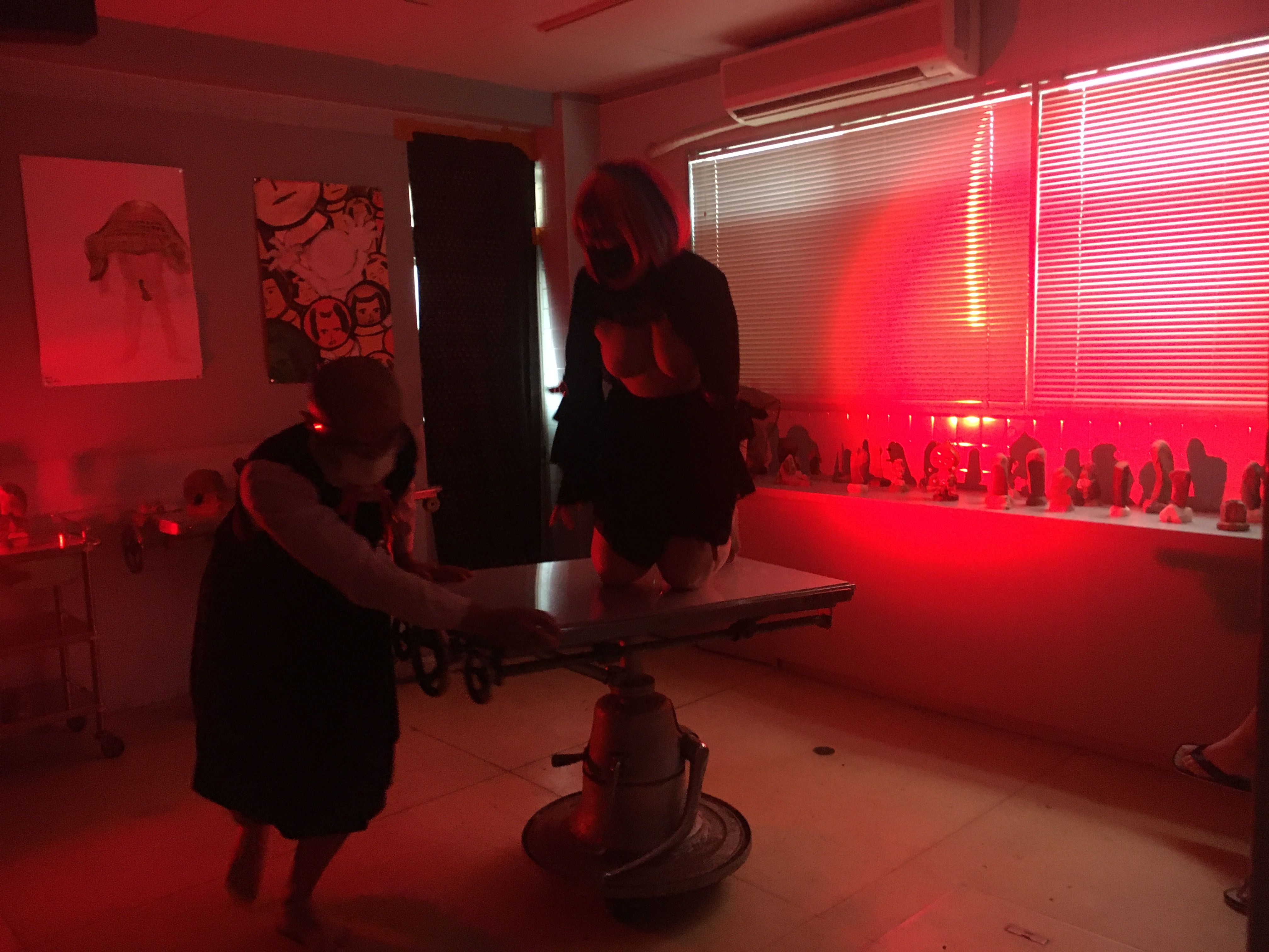 根石と昆虫化身オブジェが並ぶギャラリーが怪しい赤い光に照らされた小劇場に変貌した3日間、根石院こと久保田弘成(手術台廻し)、爆薬姐こと鈴山キナコ(歌・舞踏)、服部こうじ(ギター)による「彼女の既婚者によって着衣にされた花嫁、さえも (旅がらす)」が連日上演されました。これまで車や漁船を廻す大掛かりなパフォーマンスを実現してきたオトコクボタが、ここOperation Tableでは半裸の美女が横たわる手術台を廻し、あるいは根石のように不動直立、ギターを奏でるリズムが激しくなって来ると打楽器のようにギターの表面を敲いてリズムをさらに高揚させる服部、服部のギターが三味線調の演歌からフラメンコ、さらにブルースへと調子を変えていくに連れキナコの動きも変容します。久保田が回転させる手術台の上に横たわったまま歌い続けるキナコの歌声が、ときどきDJが回転数変えたかのように変調するので、アレ?演出か?とおもっていましたら、なんと手術台の回転が早すぎて目がまわり吐きそう!だったとか。各回20分の短いパフォーマンスでしたが、ギター1本で多彩な音を奏出する鬼才・服部こうじと、回転機械おまかせの根石院・久保田に、桁外れの起爆力を演出する鈴山キナコ、3名の熱演のほどは見事なものでした。この記録動画(撮影・編集;福田康紀)は鈴山キナコ、プロデュースにより近日有料配信となる予定です。