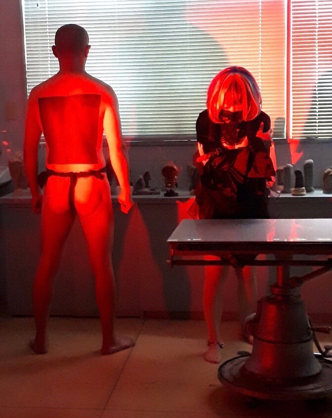 会期中に開催されたライブパフォーマンスのタイトル「彼女の既婚者によって着衣にされた花嫁、さえも (旅がらす)」は、むろんデュシャンの《彼女の独身者たちによって裸にされた花嫁、さえも (大ガラス) 》(1915〜23年)からの引用である。服部こうじのギターにあわせ、手術台の上や周囲で歌い、踊る鈴山と、そこに絡んだり、傍で屹立する久保田。展示のコンセプトをそのままパフォーマンスへと落とし込んだものであった。