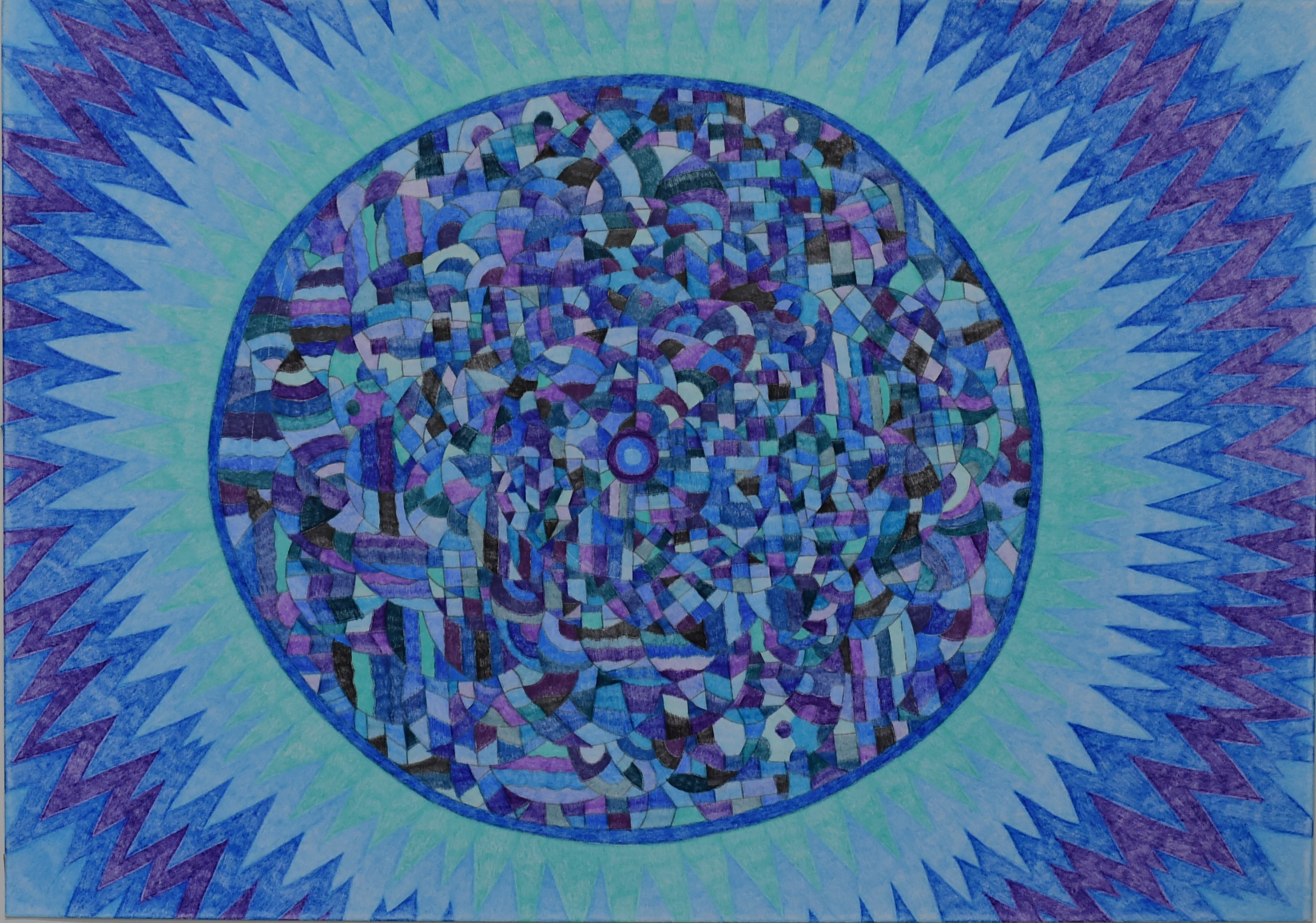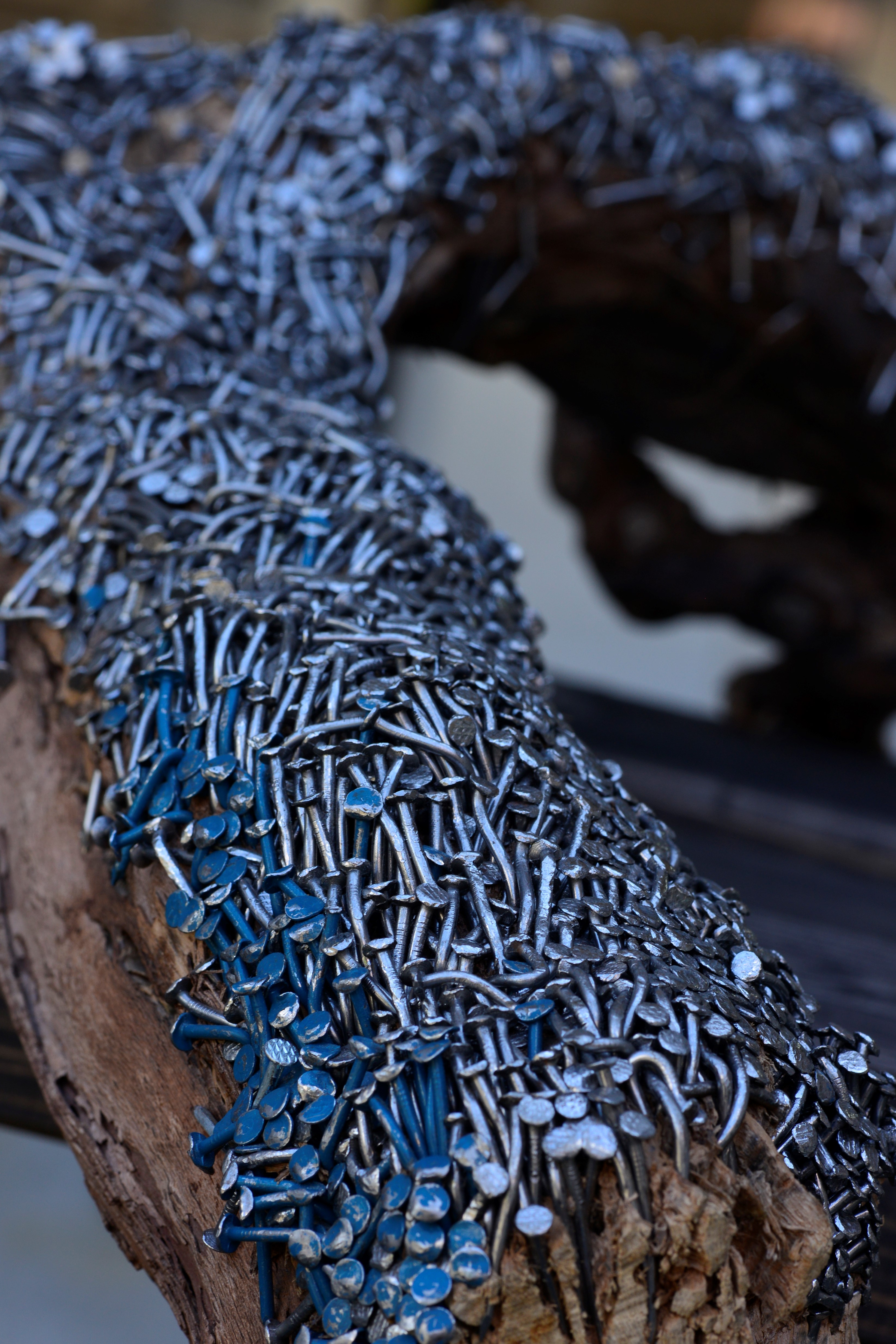 反対側の壁には最年少の荒川琢磨のとても愉快な作品が並び、展示室には太い木の枝に地が見えなくなるほど釘を打ち込んだ松下高徳の作品や、細かな点や線から潜水艦や天体の美しいイメージを描き出す松本寛庸の作品などが並ぶ。