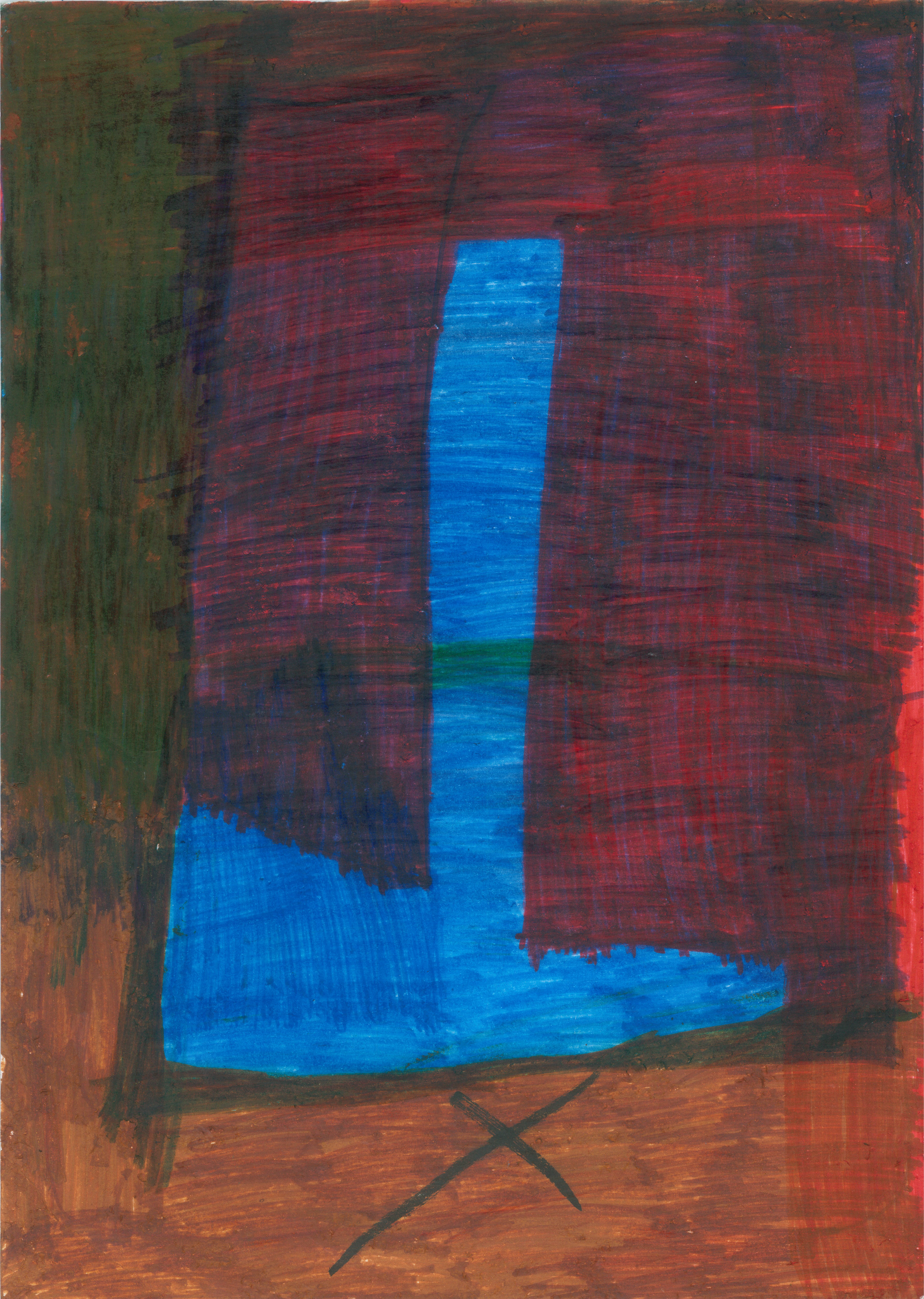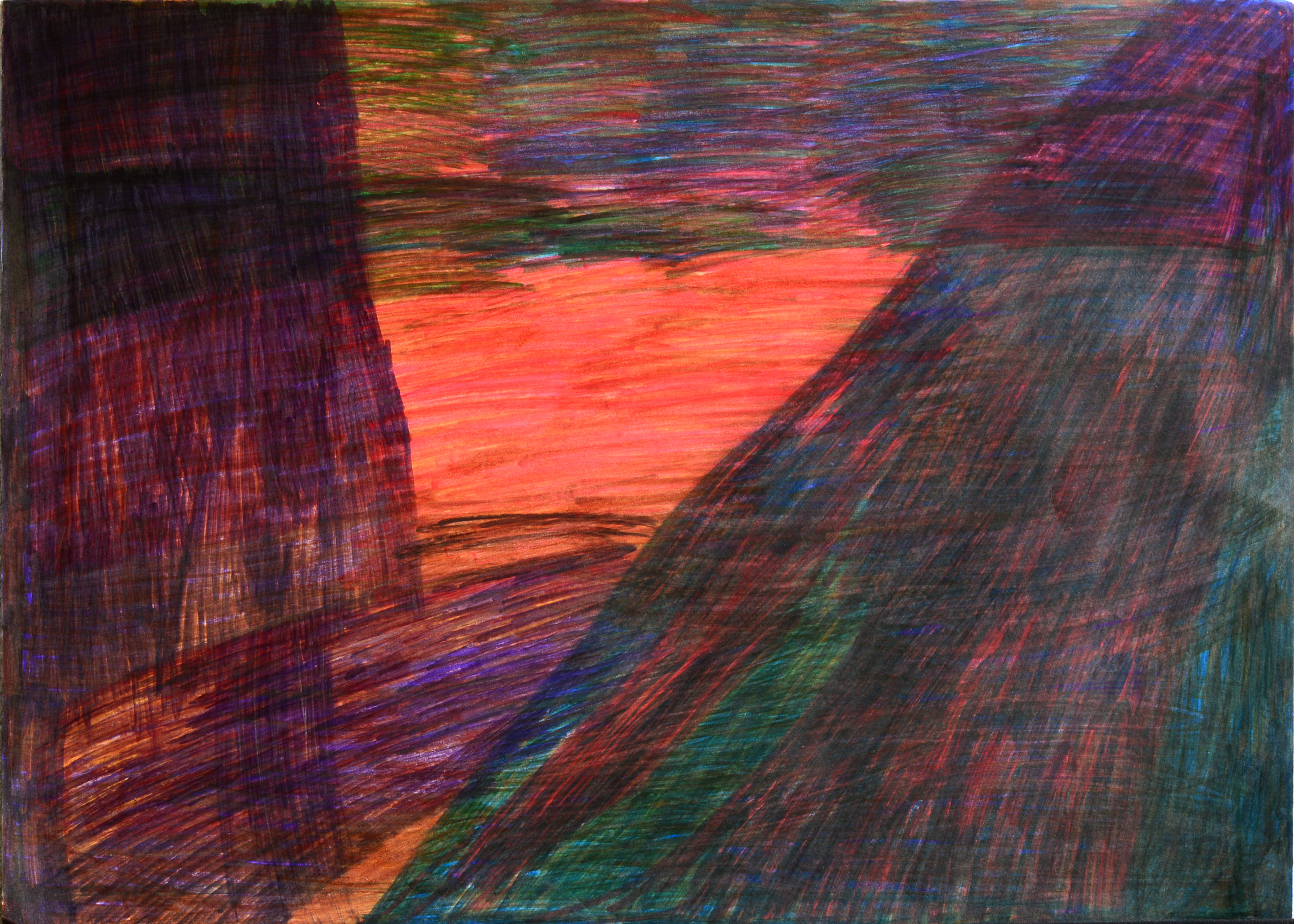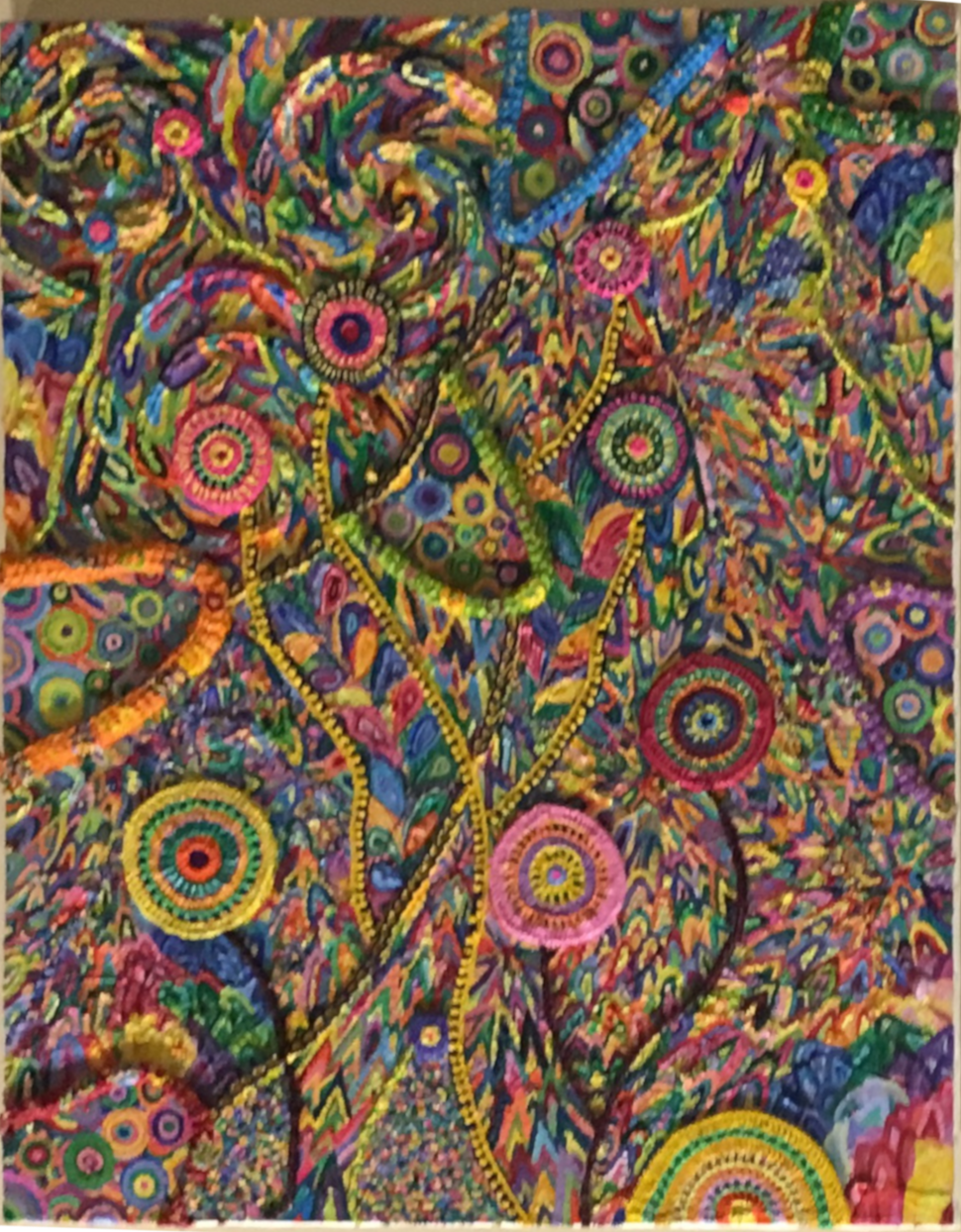 入口で待ち受けるのは曲梶智恵美の《誕生》。大きな画面は、びっしりと描かれた色とりどりの逆さまのU字によって下から上へと明るくなっていく。その画面を埋めるように赤や黄や紺色の編まれた毛糸が重ねられている。毛糸は下地のU字と呼応するように、まるで噴き出すマグマのようにリズミカルに配されている。下地のグラデーションと毛糸の重なりが加わり重層的な画面が生み出されている。このたった一枚だけでもエネルギーを吸い取られるほどの密度である。