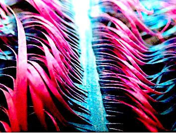 こうした作品のなかでもとりわけ目を引いたのがガラスケースの中に入った小さな紙片。はじめは糸の束か羽毛かと思った。数ミリにも満たない細さで何十本も切りこみを入れられ、切られた部分がくるくるとらせんを描き柔らかい毛の束のようなになっている。息をのむほど繊細でただ単純に美しい。これは藤岡祐機の作品だ。藤岡自身に「作品」としてこの形態を創り出そうという意図はおそらく無く、むしろハサミで切る行為そのものが重要なのだろう。その行為は日々の営みであり、言葉を使わない彼ならではの表現行為の痕跡だ。この繊細で美しい見た目の紙片に凝縮された彼の時間は私が生きてきた時間軸と同じでありながら、世界が全く異なるように知覚されているのではないかと思えた。