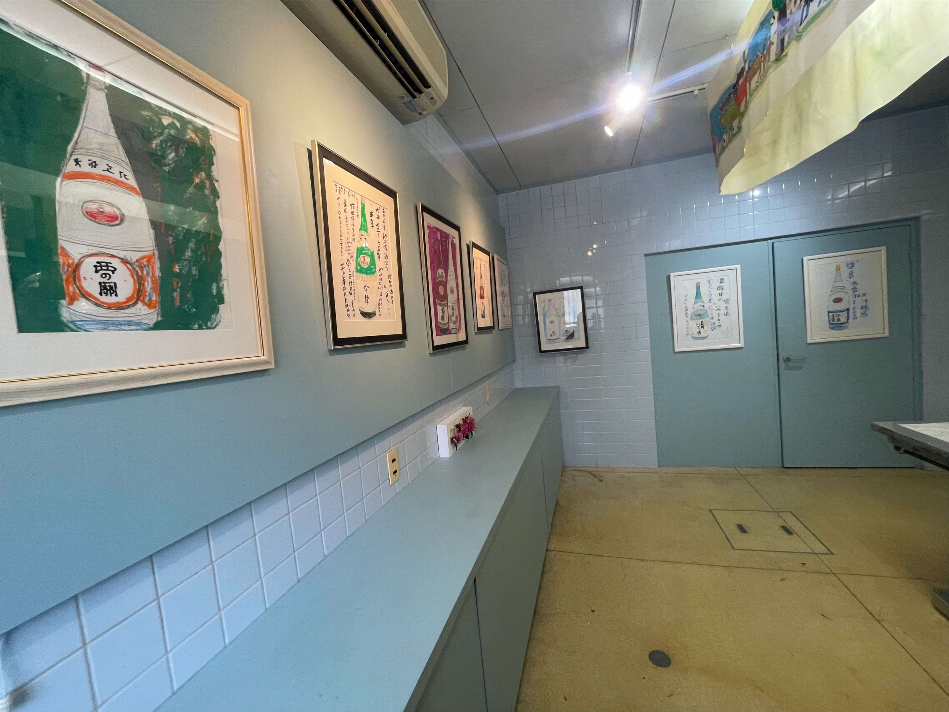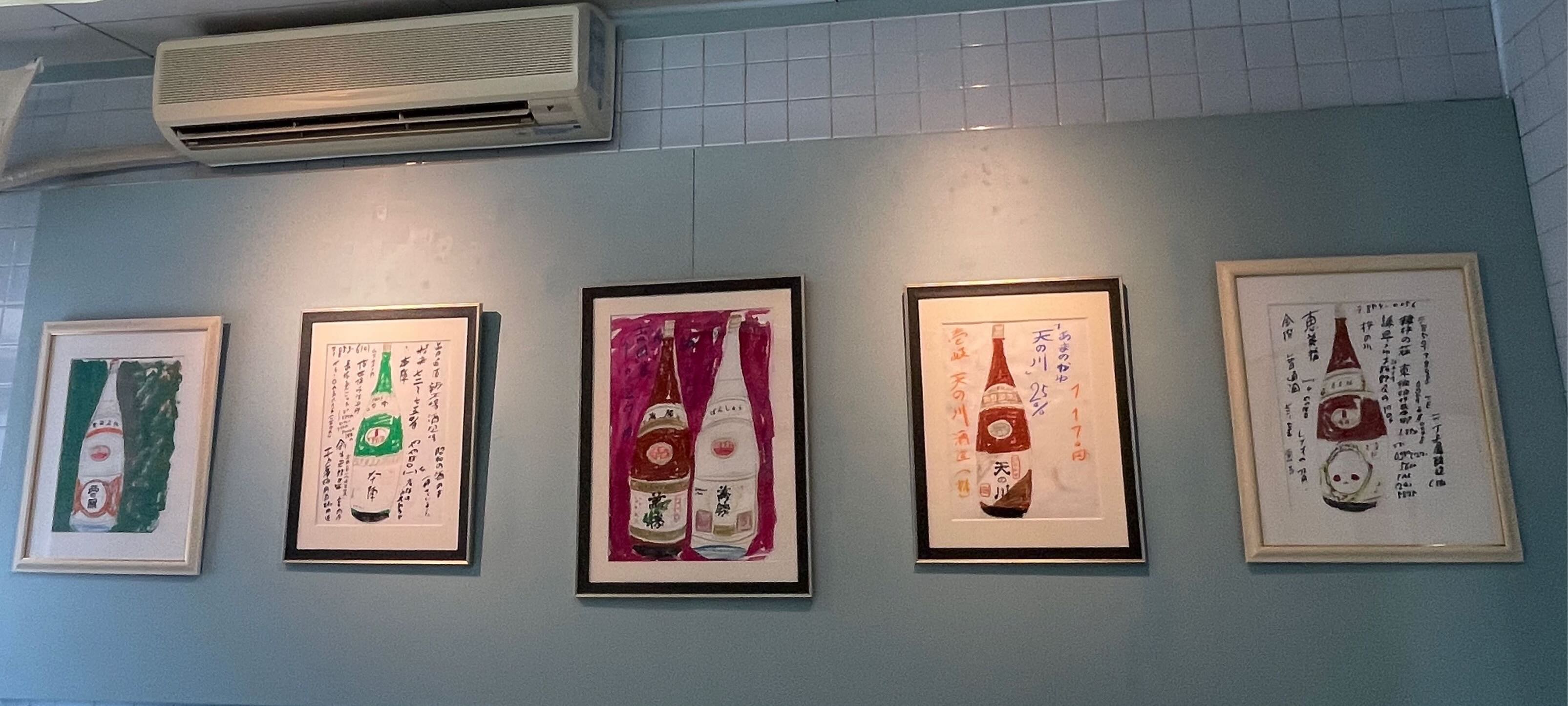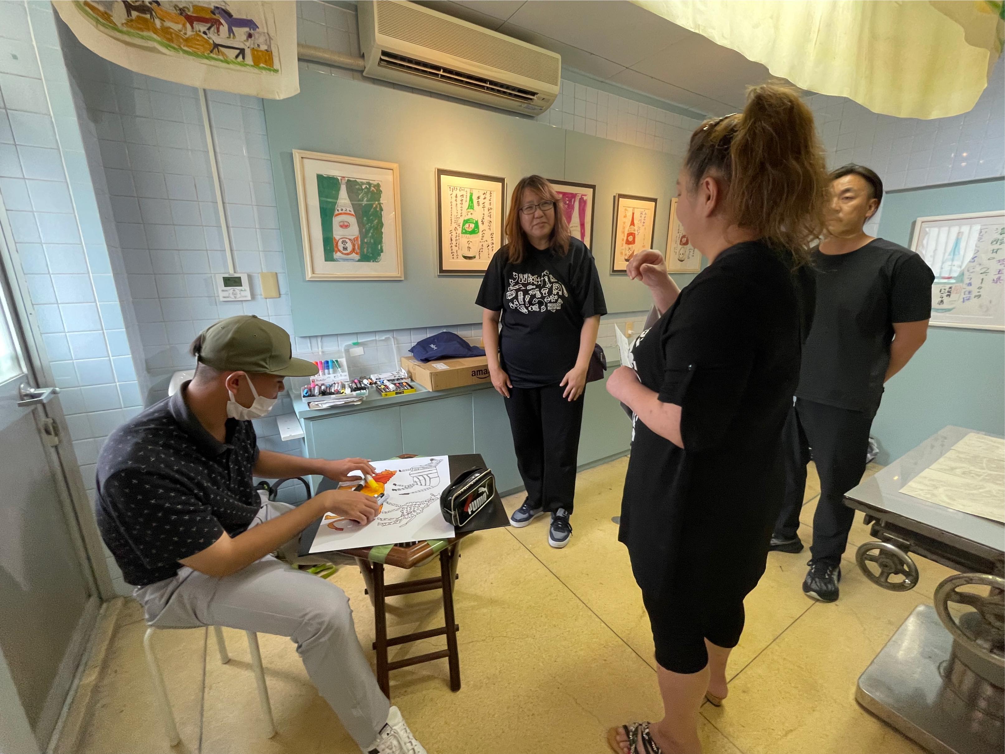 9月15日に予定はなかったのですが、犬塚弘さんがご友人らと長崎からいらっしゃいました。着くやいなや会場をひと目見渡した後、早速ノートとカラーペンを取り出し、何やら描き始めたとおもったら、オドロキ‼️ Operation Tableから車で15分ほど近くに溝上酒造があって「天心」という北九州ブランドの日本酒を出しておられますが、その「天心」の酒瓶がいきなり犬塚さんの手先から紙の上に現れたのです❢ さっそく会場に展示しました。