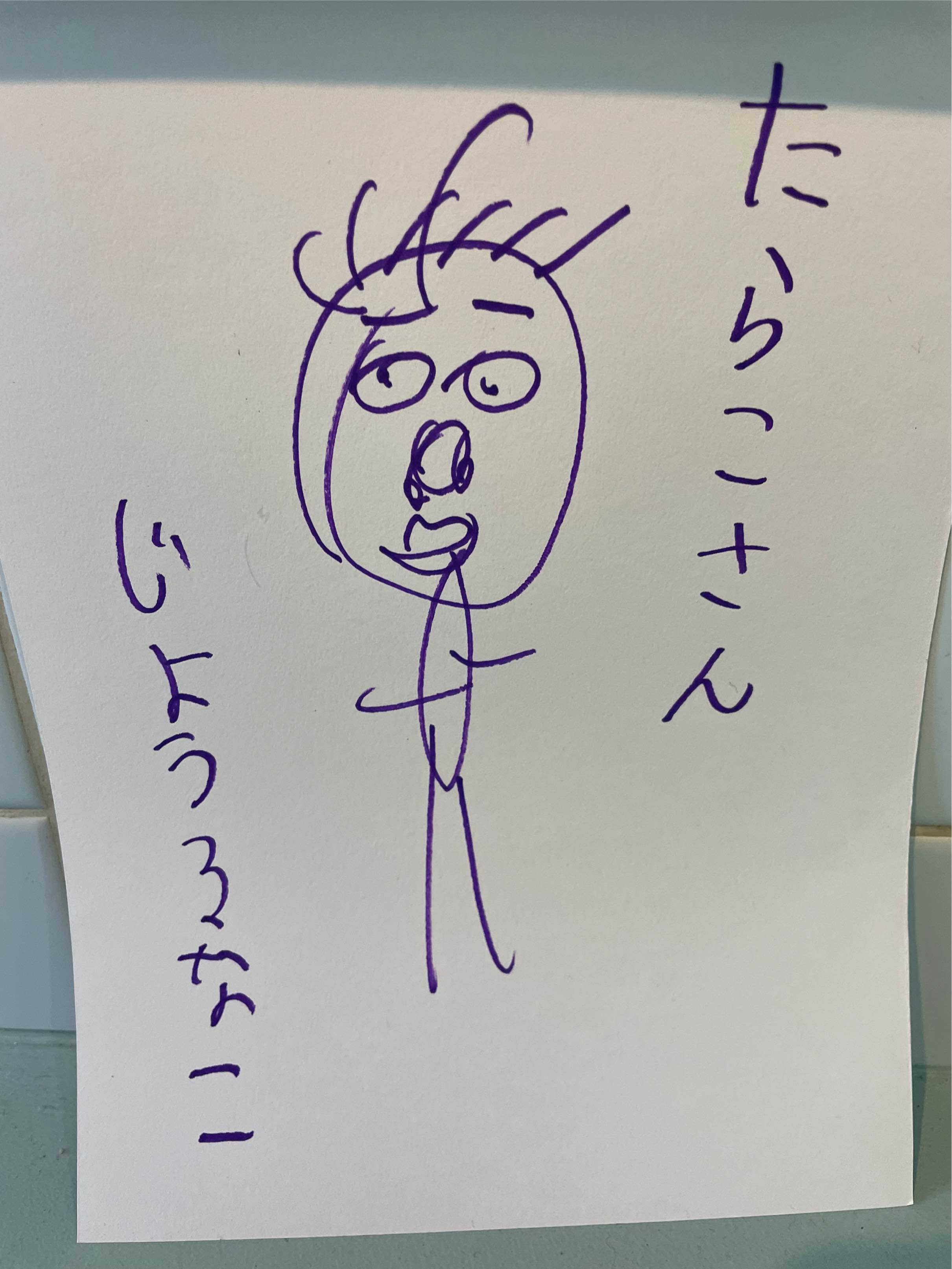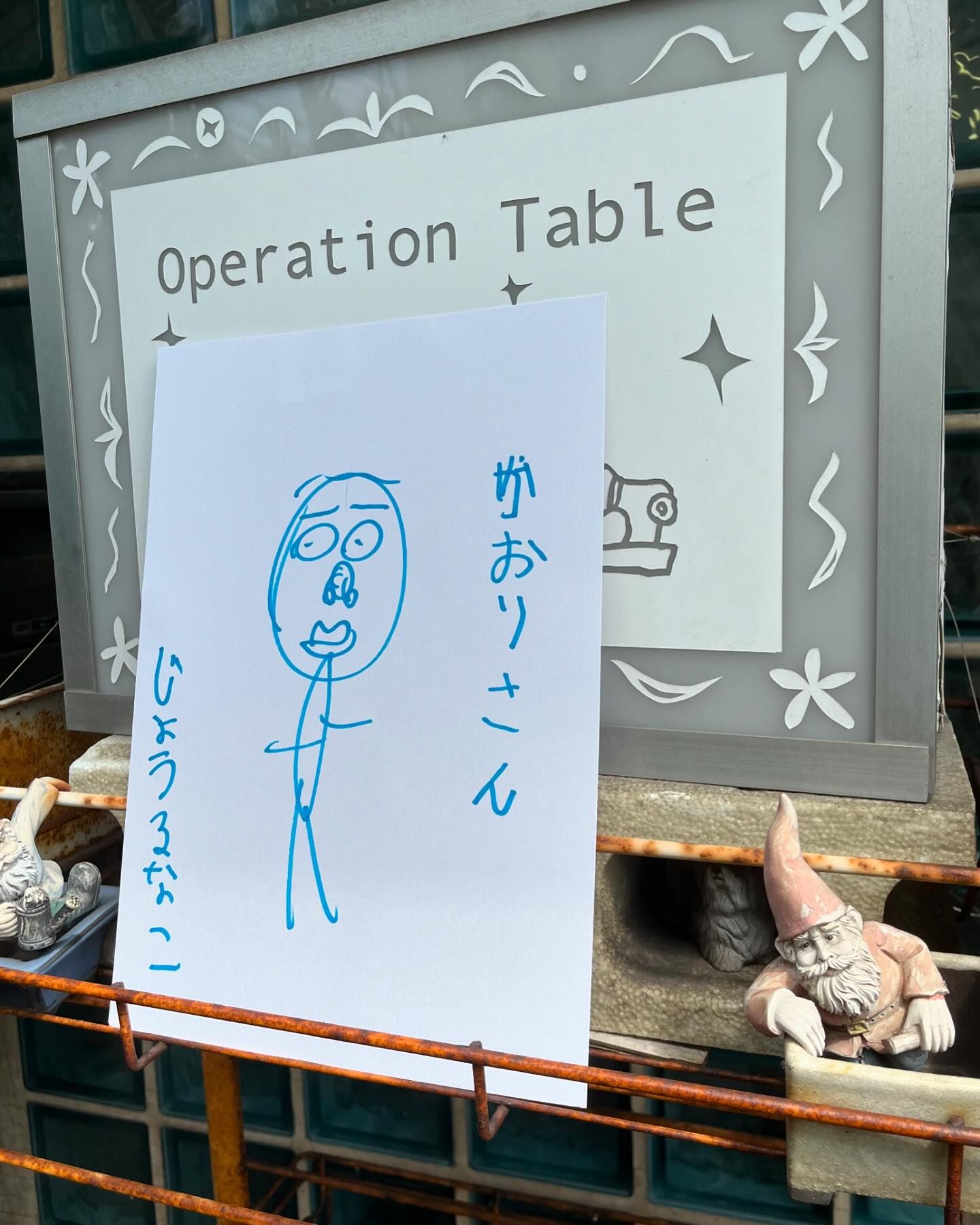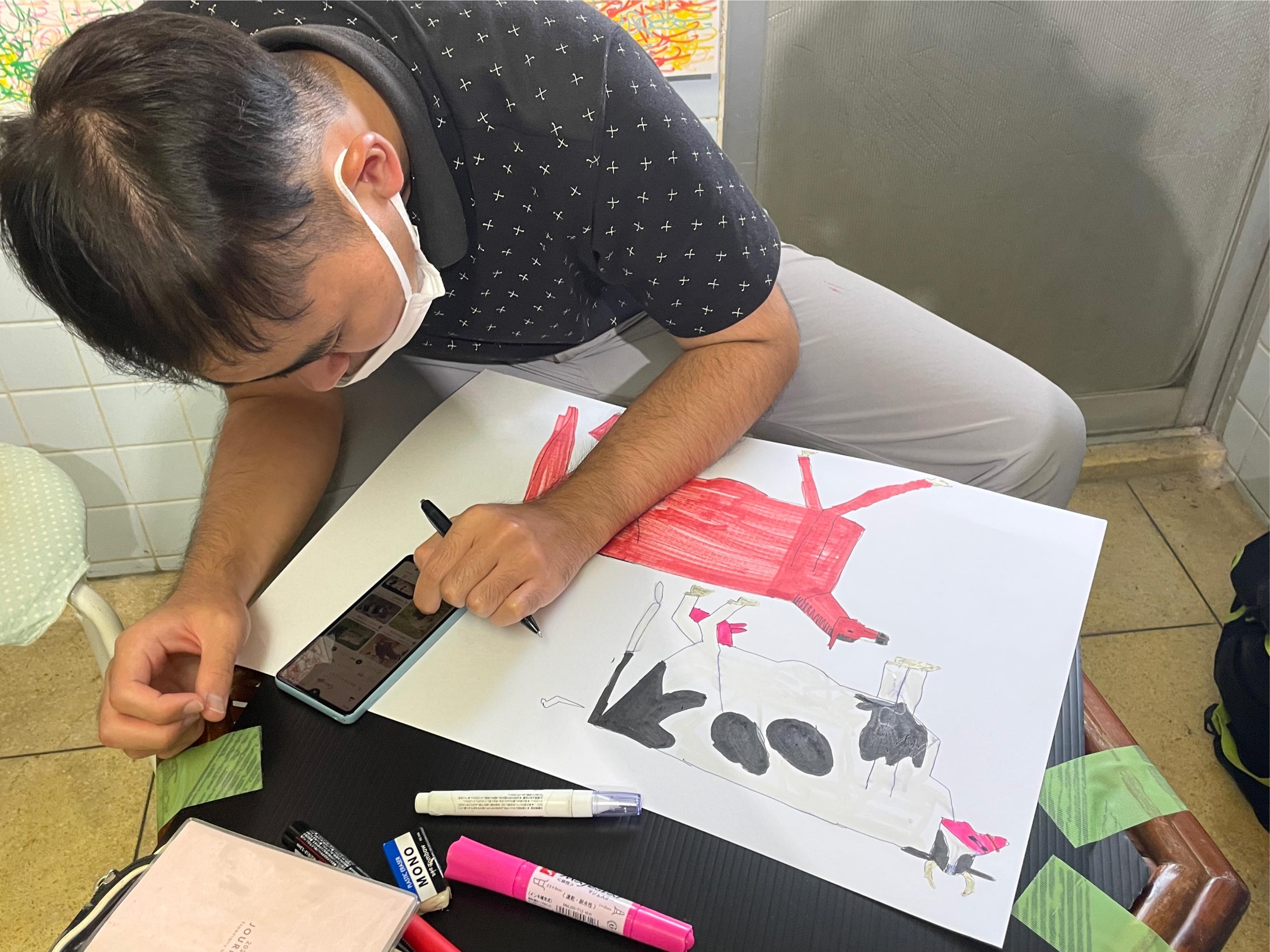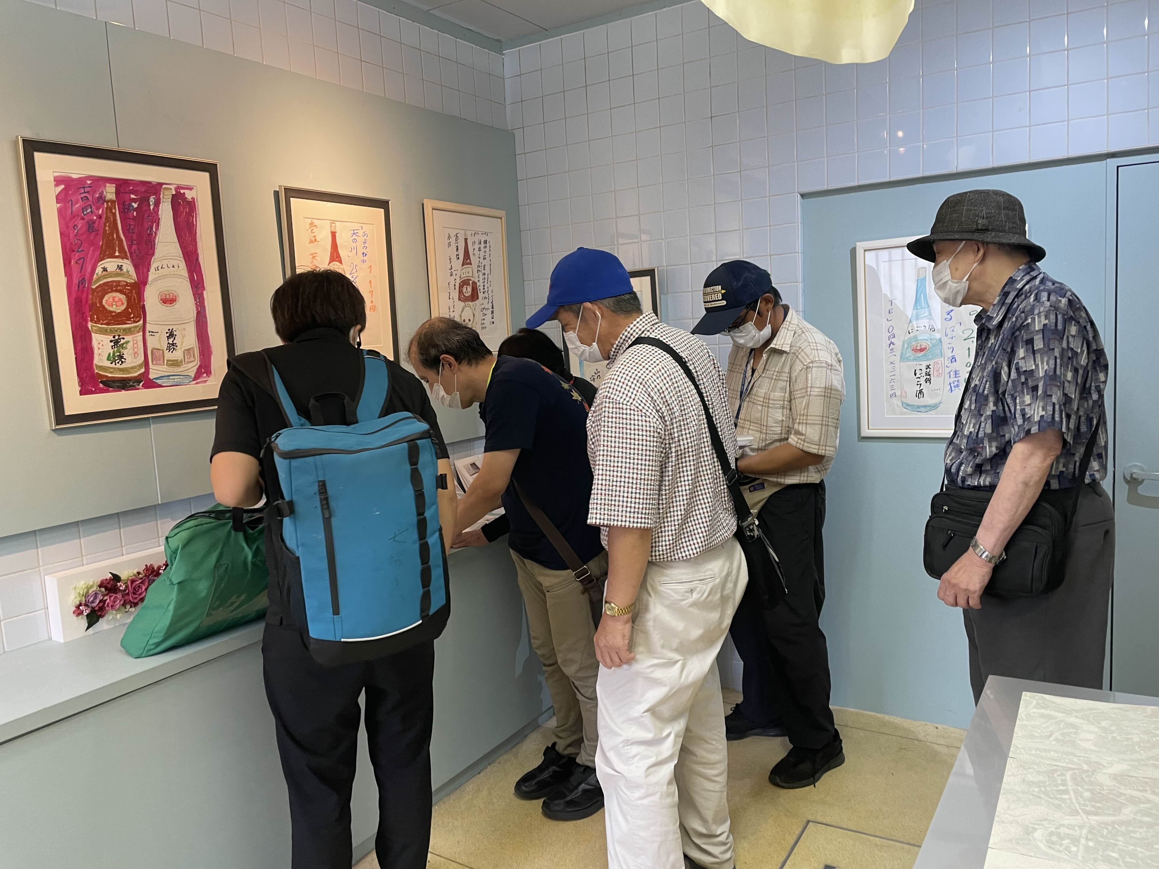 9月15日に予定はなかったのですが、犬塚弘さんがご友人らと長崎からいらっしゃいました。着くやいなや会場をひと目見渡した後、早速ノートとカラーペンを取り出し、何やら描き始めたとおもったら、オドロキ‼️ Operation Tableから車で15分ほど近くに溝上酒造があって「天心」という北九州ブランドの日本酒を出しておられますが、その「天心」の酒瓶がいきなり犬塚さんの手先から紙の上に現れたのです❢ さっそく会場に展示しました。