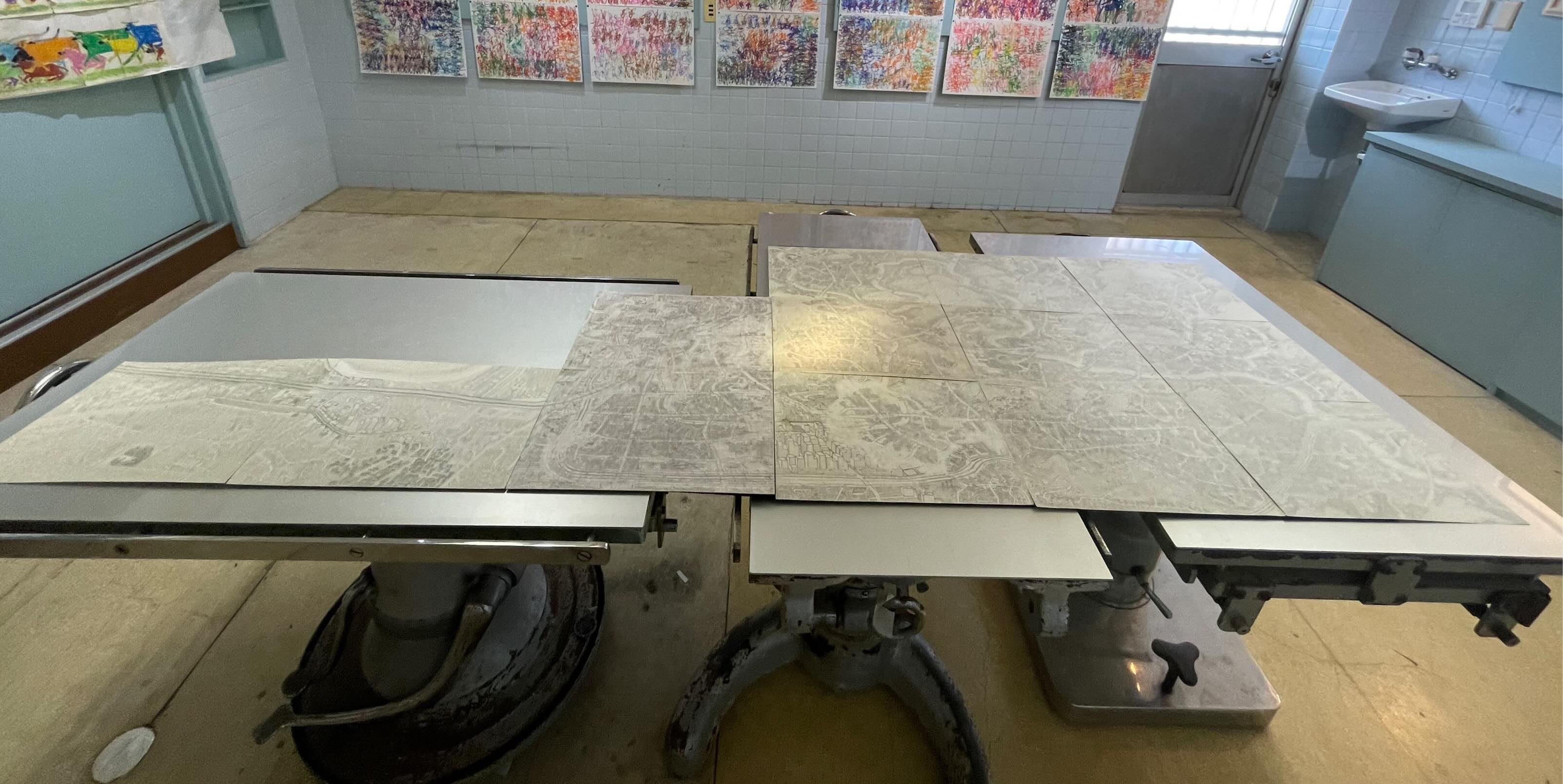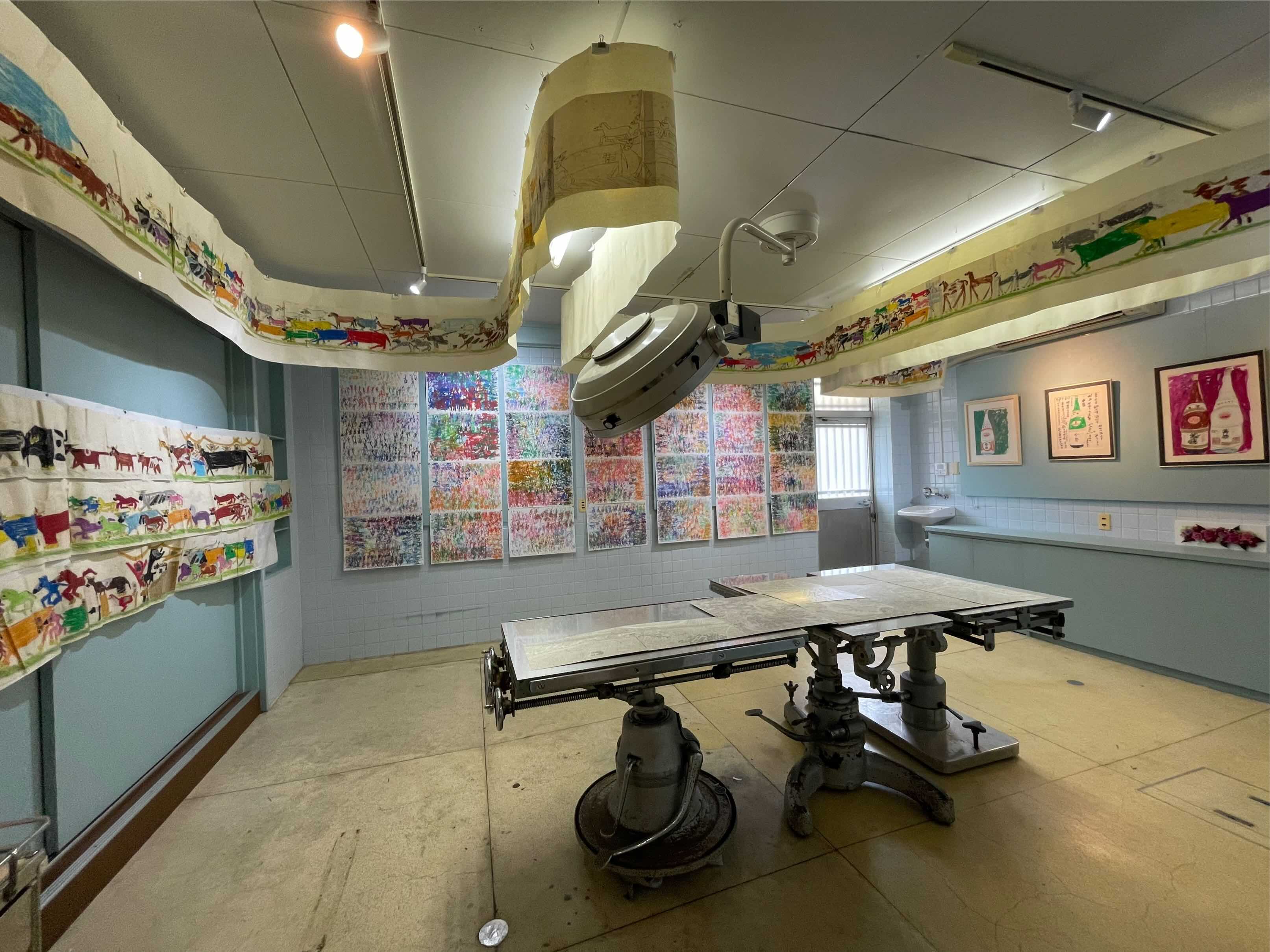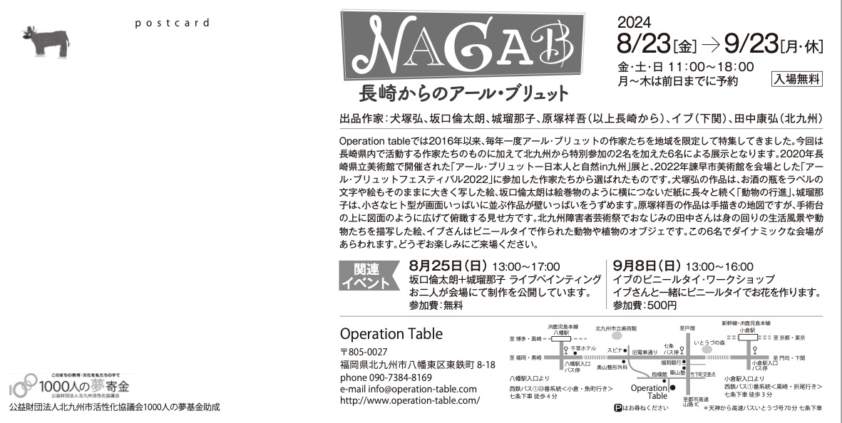 Operation tableでは2016年以来、毎年一度アール・ブリュットの作家たちを地域を限定して特集してきました。今回は長崎県内で活動する作家たちのものに加えて北九州から特別参加の2名を加えた6名による展示となります。2020年長崎県立美術館で開催された「アール・ブリュットー日本人と自然in九州」展と、2022年諫早市美術館を会場とした「アール・ブリュットフェスティバル2022」に参加した作家たちから選ばれたものです。犬塚弘の作品は、お酒の瓶をラベルの文字や絵もそのままに大きく写した絵、坂口倫太朗は絵巻物のように横につないだ紙に長々と続く「動物の行進」、城瑠那子は、小さなヒト型が画面いっぱいに並ぶ作品が壁をうずめます。原塚祥吾の作品は手描きの地図ですが、手術台の上に図面のように広げて、空から地上を見下ろすような俯瞰図として展示されます。北九州市障害者芸術祭でおなじみの田中さんは身の回りの生活風景や動物たちを描写した絵、イブさんはビニールタイで作られた動物や植物のオブジェです。この6名でダイナミックな会場があらわれます。どうぞお楽しみにご来場ください。