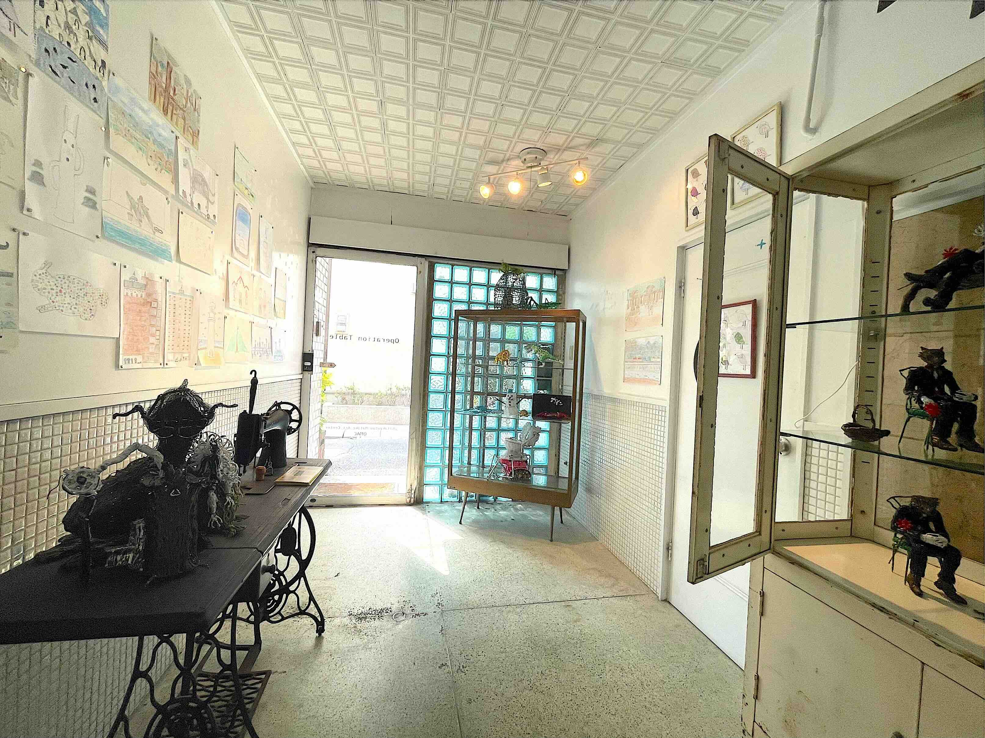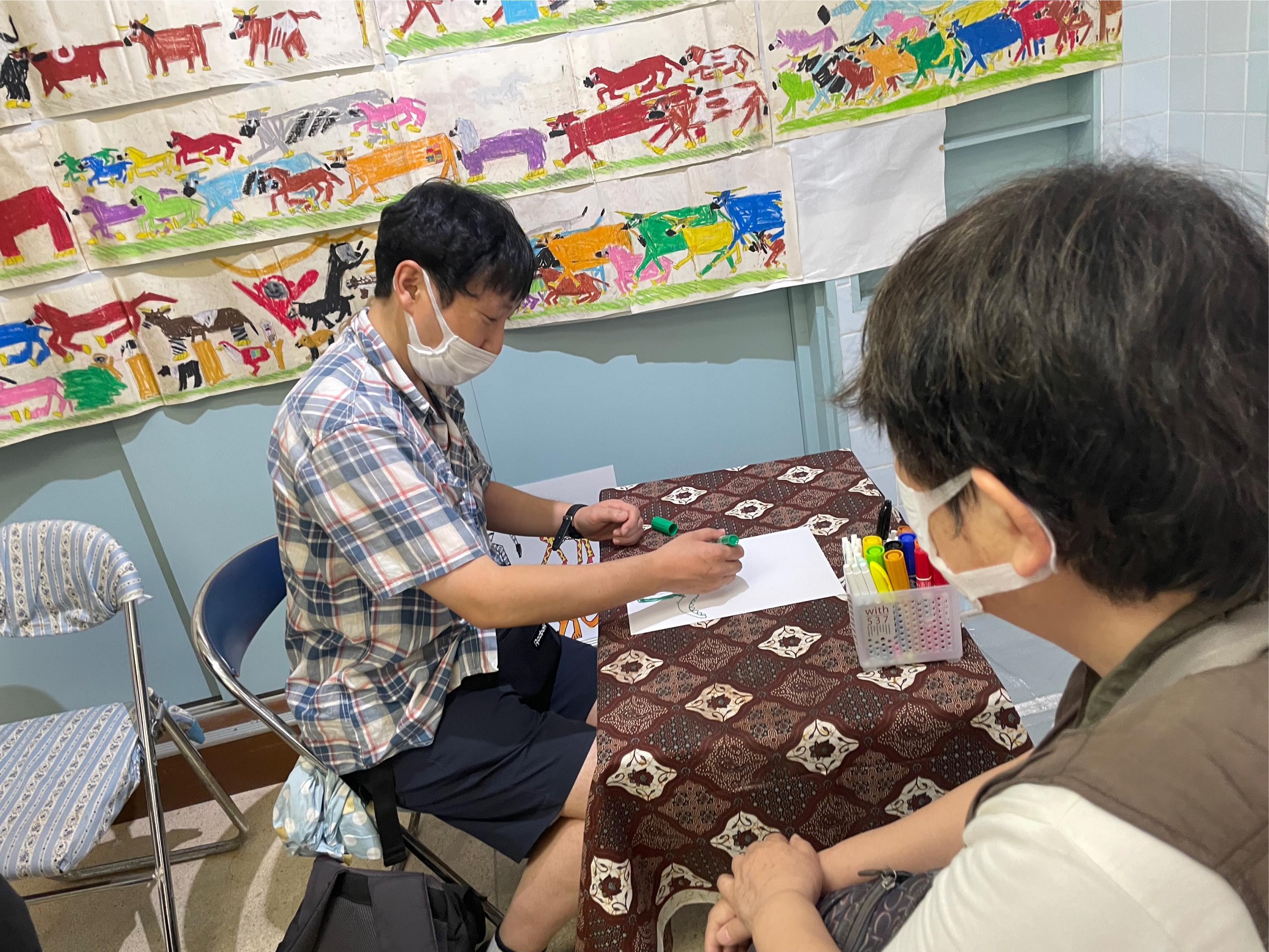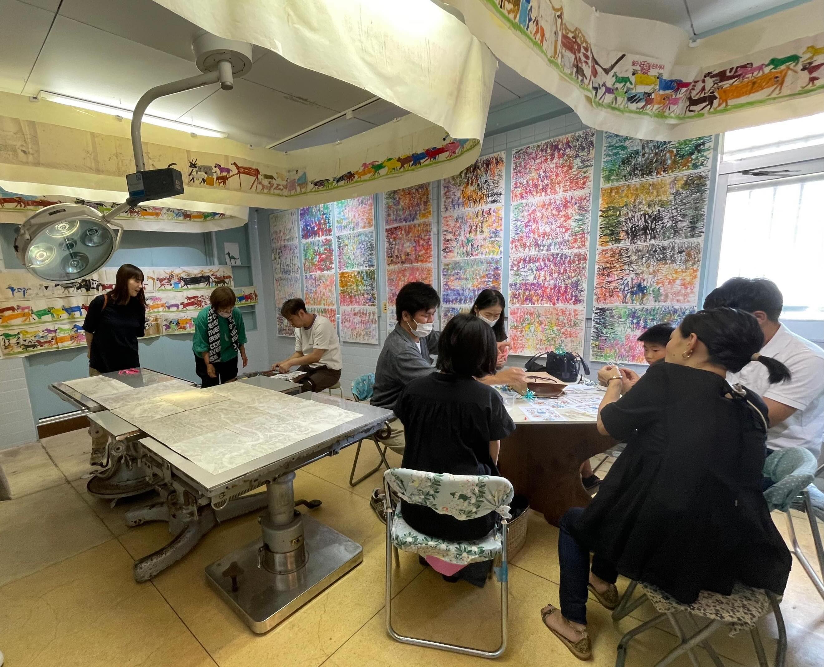 Operation tableでは2016年以来、毎年一度アール・ブリュットの作家たちを地域を限定して特集してきました。今回は長崎県内で活動する作家たちのものに加えて北九州から特別参加の2名を加えた6名による展示となります。2020年長崎県立美術館で開催された「アール・ブリュットー日本人と自然in九州」展と、2022年諫早市美術館を会場とした「アール・ブリュットフェスティバル2022」に参加した作家たちから選ばれたものです。犬塚弘の作品は、お酒の瓶をラベルの文字や絵もそのままに大きく写した絵、坂口倫太朗は絵巻物のように横につないだ紙に長々と続く「動物の行進」、城瑠那子は、小さなヒト型が画面いっぱいに並ぶ作品が壁をうずめます。原塚祥吾の作品は手描きの地図ですが、手術台の上に図面のように広げて、空から地上を見下ろすような俯瞰図として展示されます。北九州市障害者芸術祭でおなじみの田中さんは身の回りの生活風景や動物たちを描写した絵、イブさんはビニールタイで作られた動物や植物のオブジェです。この6名でダイナミックな会場があらわれます。どうぞお楽しみにご来場ください。