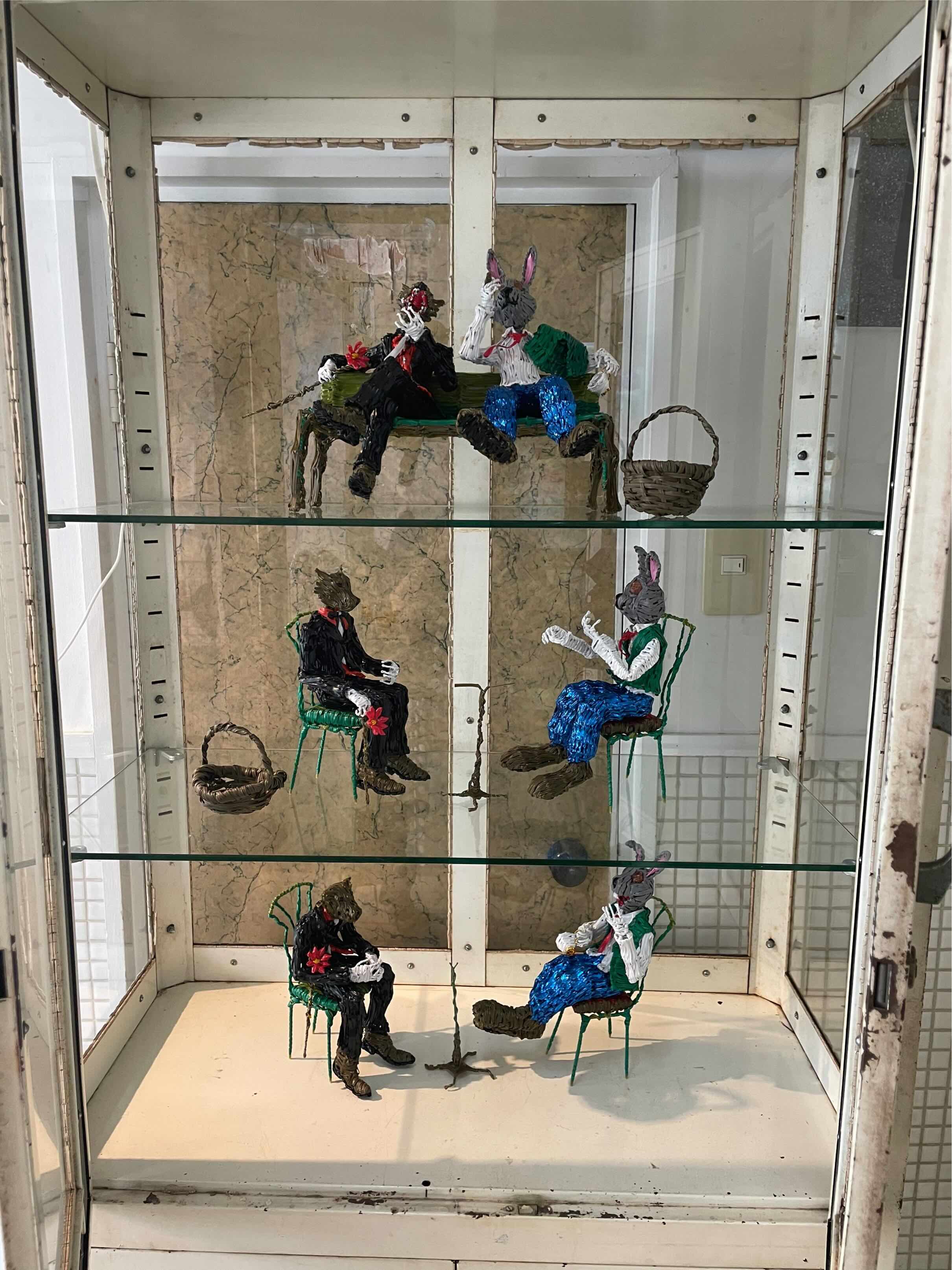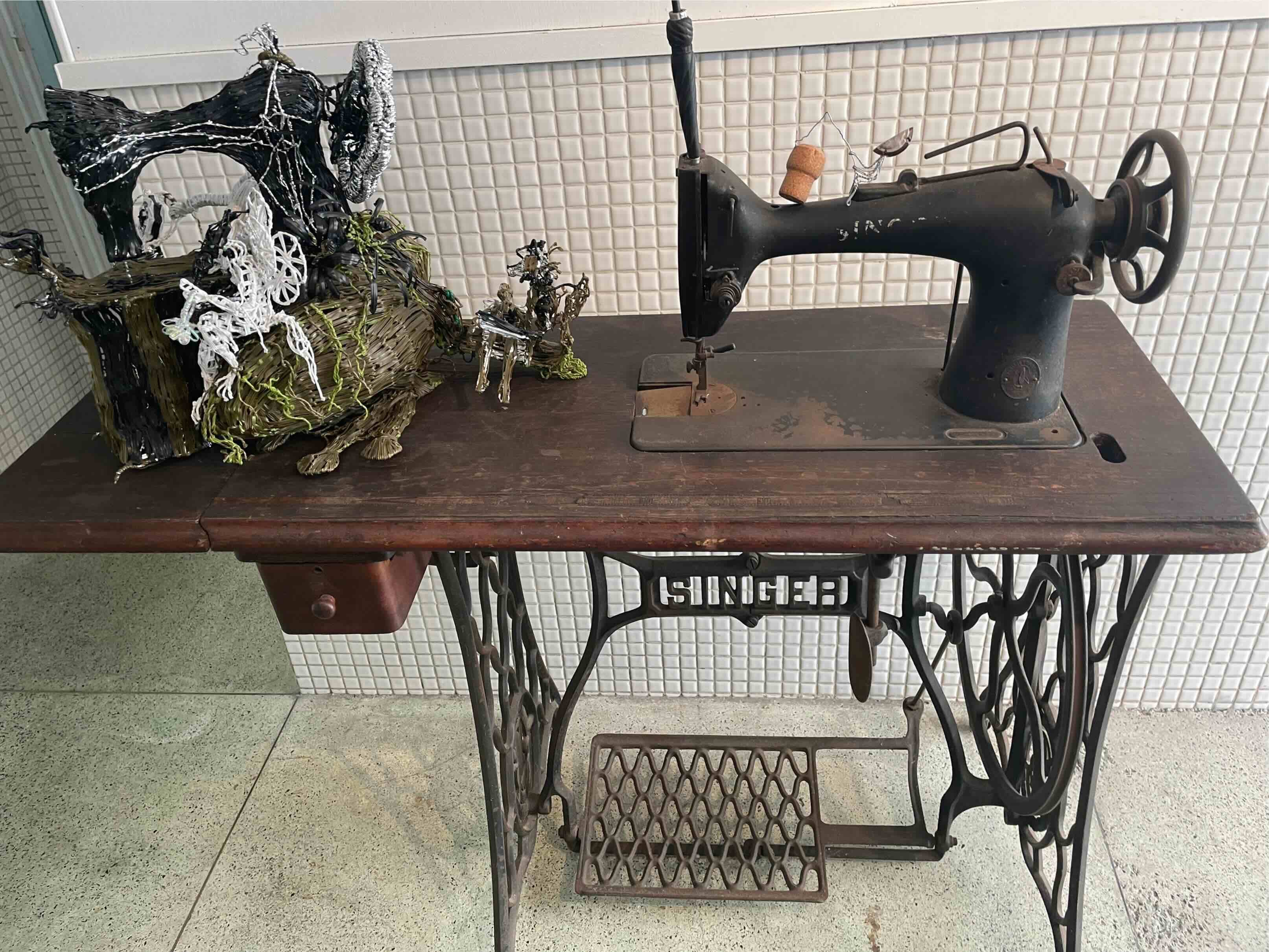 左から[オペレーション・テーブルのミシン台上のイブ作品][田中康弘の作品]