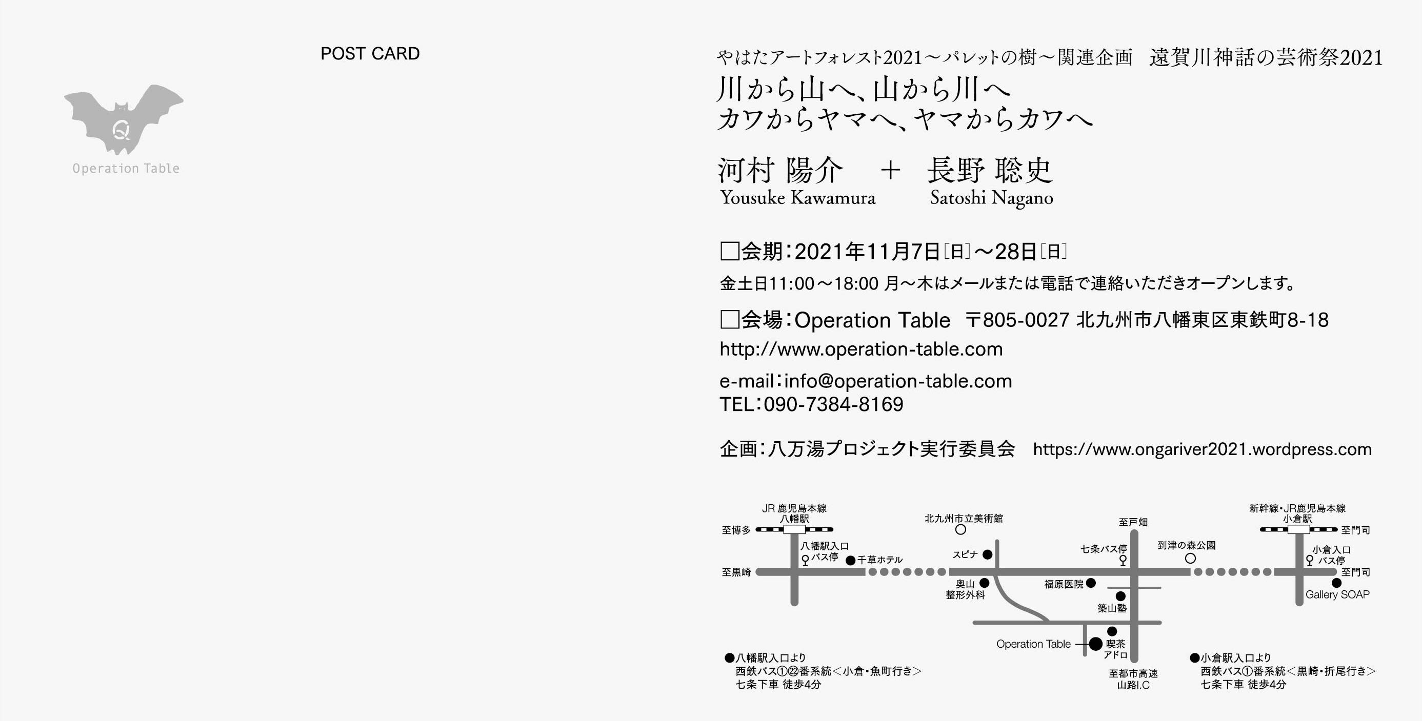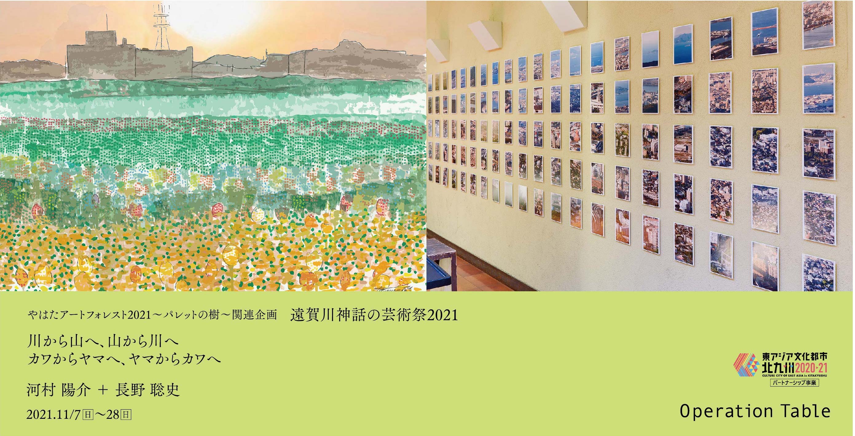 福岡県嘉麻市馬見山から響灘へと流れる遠賀川は、かつては筑豊炭田を貫流する石炭輸送路として、また大陸文化の交流地点としてその役割を果たしてきた。「遠賀川神話の芸術祭2021」に関連して、この遠賀川が流れる筑豊地区を拠点に活躍する、河村陽介さん、長野聡史さんの二人展がoperation tableで開催された。筆者は、かつて二年ほど嘉麻市立織田廣喜美術館に勤務した縁で、二人とはアートプロジェクトやワークショップを共にする機会があり折に触れ作品にも接してきた。「川から山へ、山から川へ カワからヤマへ、ヤマからカワへ」。カワ(遠賀川)からヤマ(炭鉱)へと続く、そんな情景を想像しながら会場を訪ねた。