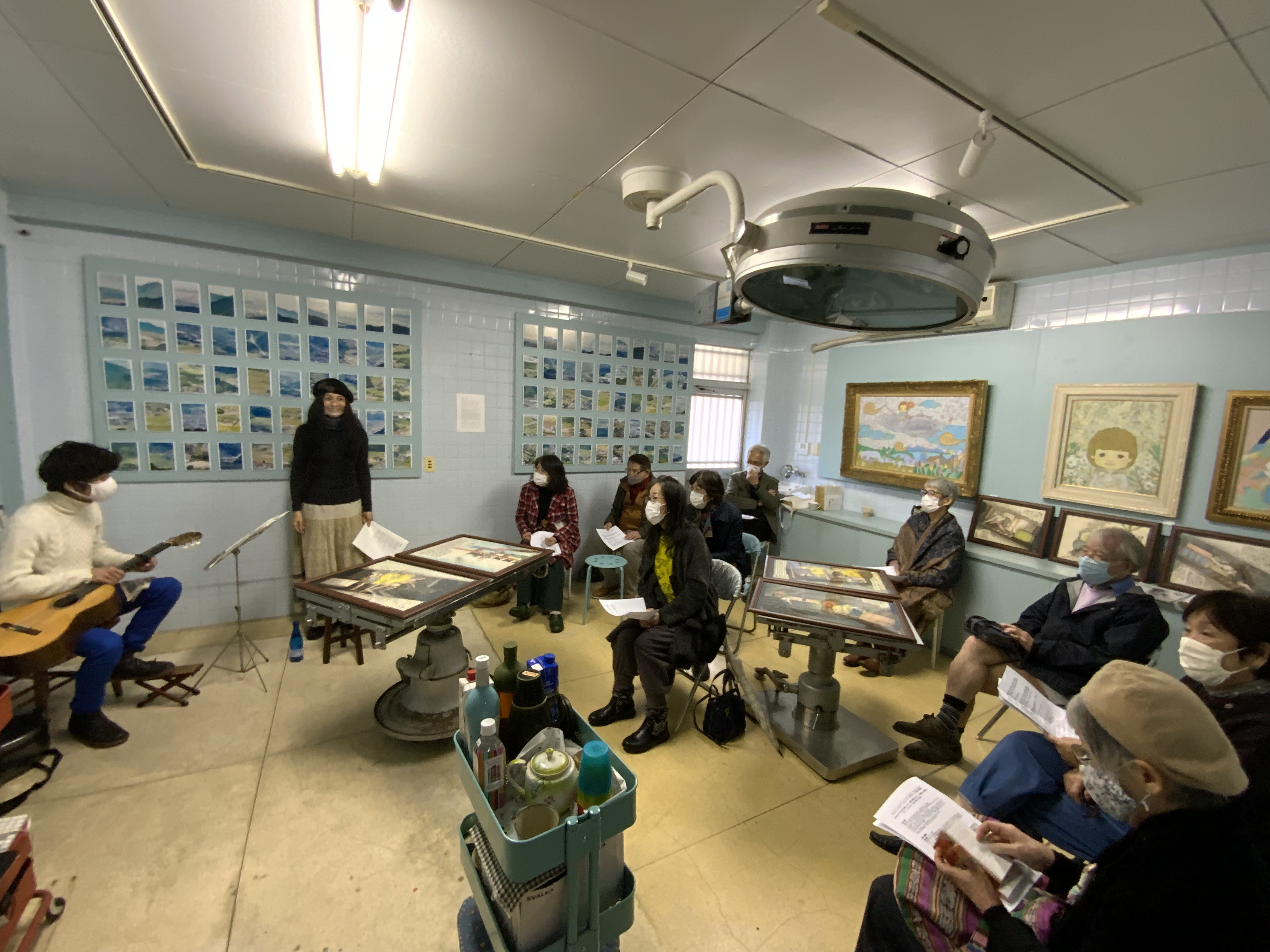 末森樹さんのギター演奏と朱実さんの歌と朗読によるライブ。山福朱実さんのご尊父、山福康政さんは上野英信の「筑豊文庫」との縁も深く、生前の山本作兵衛さんとも親交がありました。その山福家所蔵の貴重品のひとつ、筑豊文庫で収録、上野朱氏が発行した、山本作兵衛さんと炭坑婦の藤山スエさんが歌う、炭坑節のCDアルバム音源『作兵衛 絶唱』を聴きながら、朱実さんの思い出話もうかがいます。