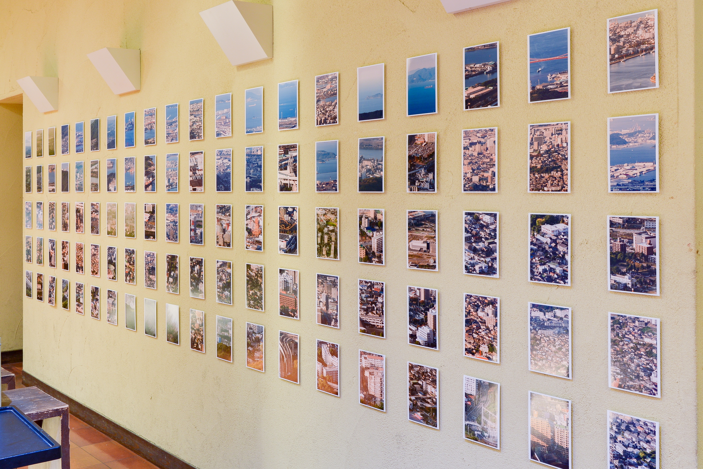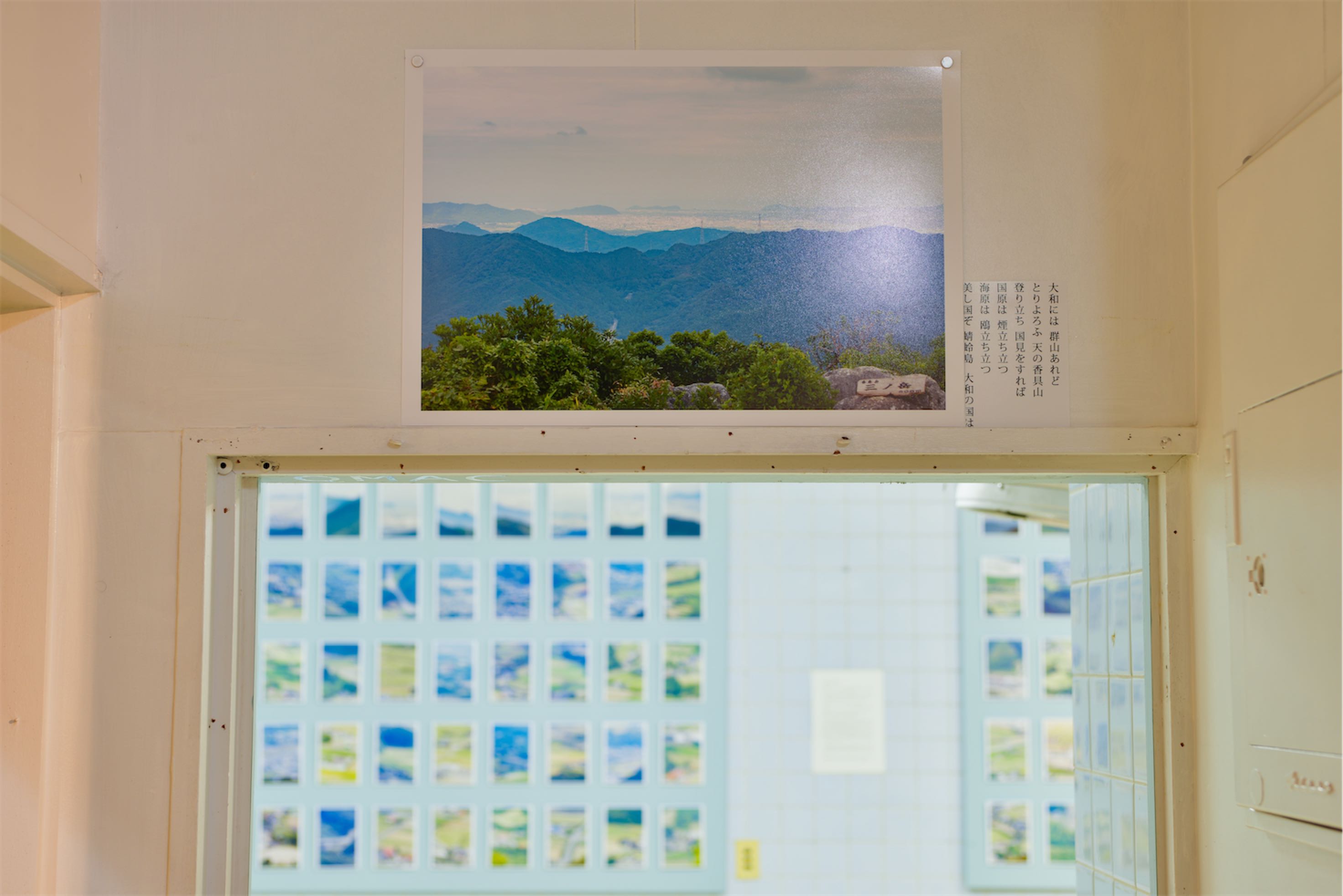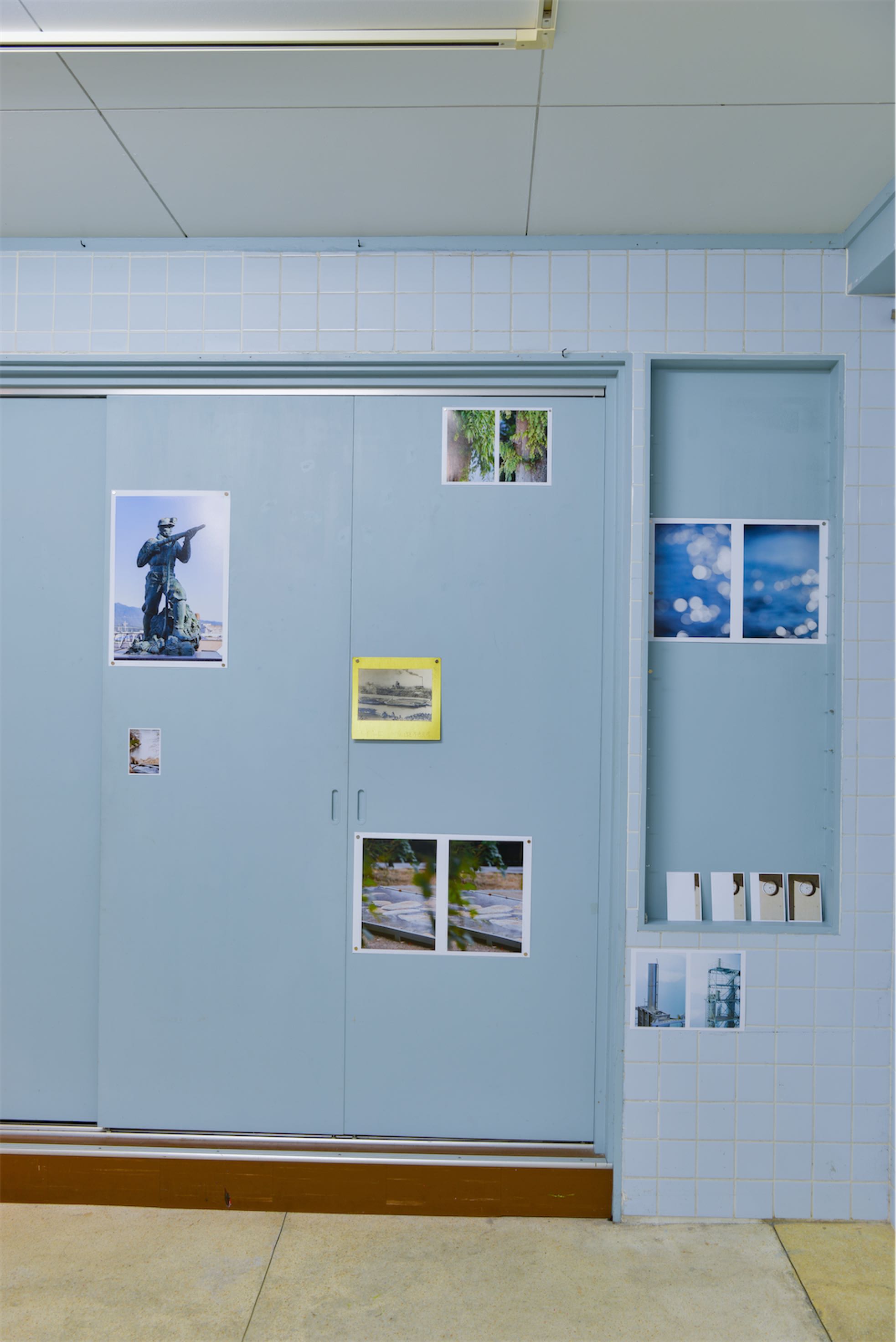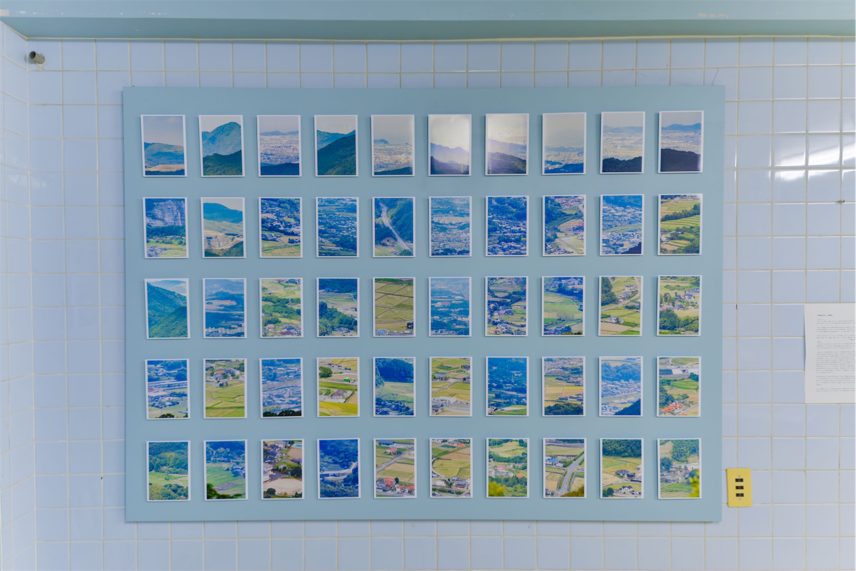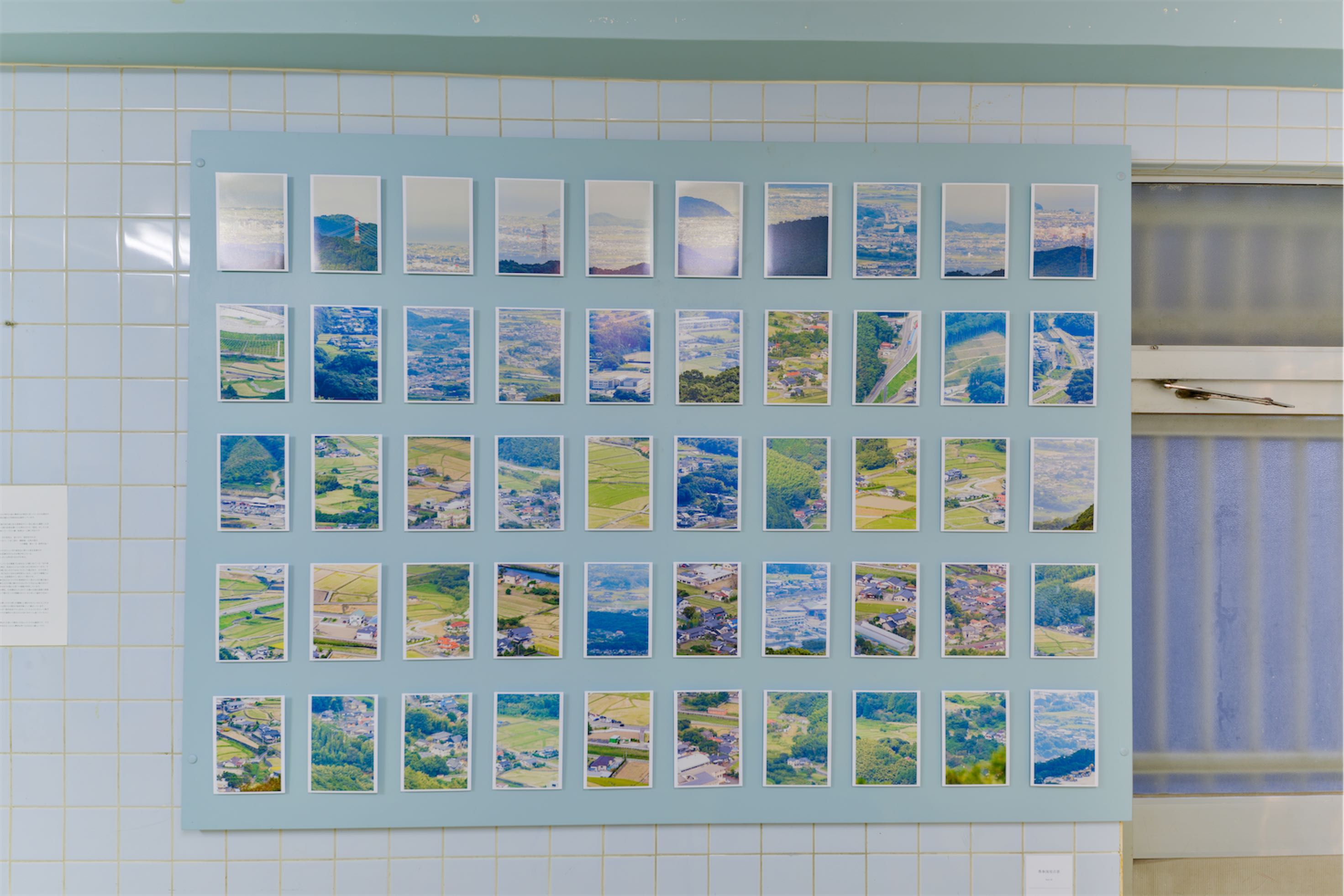 メイン会場入り口の頭上には、遠くの海と山々を見渡す風景写真と共に、舒明天皇の万葉集の歌が飾られている。目線を落とすと、《香春国見百景》(2021年)と題した、100枚に及ぶ写真群が壁面を埋め尽くしていた。「その土地の伝承を調べて山頂などから「国見」をしたと見立て現代の風景を切り取る「国見百景シリーズ」」のひとつである。本展に出品された作品もまた、舒明天皇の国見の歌や、様々な筑豊の伝承や歴史をベースに、福岡県の田川郡香春岳の三ノ岳山頂から「香春国見」として今の風景を捉えたものだという。風景写真としては珍しく縦構図による構成である点が、風景の「切り取り」であることを強調し、周辺景色への想像も働かせる。歌にある「天の香具山」は奈良県天香久山とされているのだが、香春岳の三ノ岳だという説もあるのだという。諸説あるこの三ノ岳頂上から、香春町の田園風景や、コンビニエンスストア、民家、そこに住む住民たちのありのままの姿を、長野さんは静かに淡々と写し取っている。そこには人里を見渡し国の平和を詠った情景を追体験するかのように、あたたかな眼差しを感じずにはいられなかった。