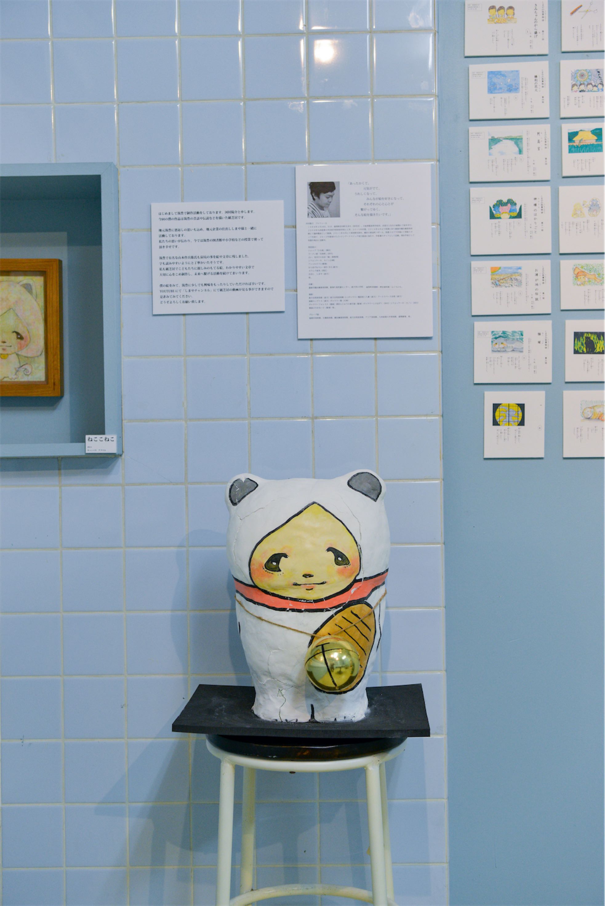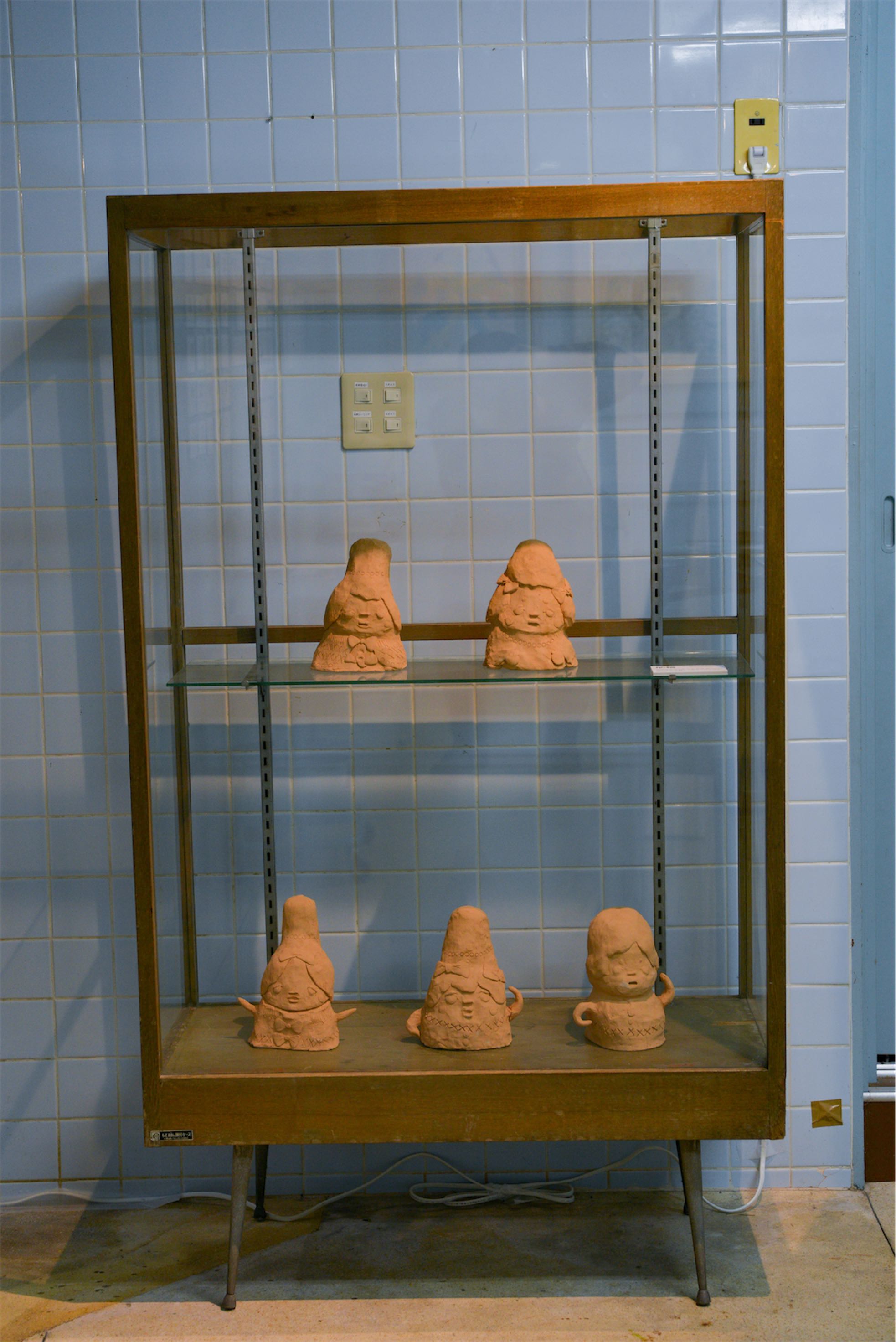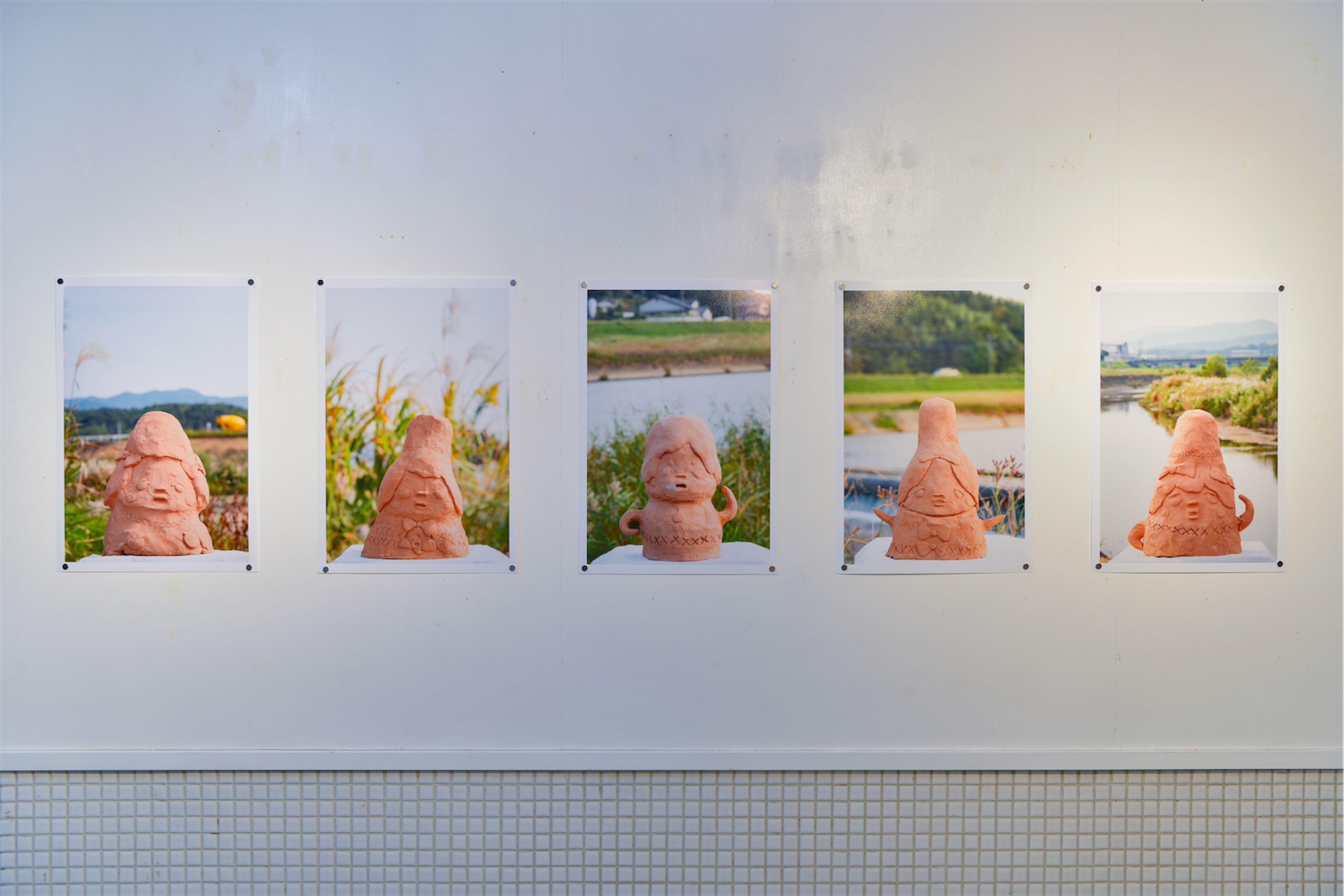 河村陽介さんの作品はあたたかい。「あったかくて、元気がでて、うれしくなって、みんなが絵を好きになって、それぞれの心と心とが繋がってゆく、そんな絵を描きたいです。」そう作家が語るように、多幸感に包まれた作品を前にすると思わず顔がほころび穏やかな気持ちにさせられる。会場メインの展示室には《きみはひかりだ》(2016年)、《lily》(2020年)、《しまやの筑豊物語》(2021年)など、アクリルと水性マーカーで描かれた絵画作品が並ぶ。独特の表情でまっすぐに見据える子どもたちと、点描による豊かな色彩が画面を渦巻き目を楽しませる。本展には平面作品の他に、田川郡福智町の上野焼宗家 渡窯 第十二代 渡仁氏に焼き上げを依頼したという埴輪が展示された。河村さんの作品は「Cake Kanon」(田川)、「アンコル ド パン」(飯塚)など筑豊の町にいくつも常設展示されている。そうしたことからも、筑豊を愛し、愛され、河村さんのアートを通じ人と地域とが繋がっているのだと感じさせられる。本展の出品作《しまや筑豊物語》もまた、河村さんの視点から筑豊を伝える作品のひとつだろう。本作は直方市の仕出し料理店「筑前やまや」との共同企画で生まれた紙芝居作品である。直方市出身の力士魁皇と勝利の花火を上げるおじいさんの物語「勝利の花火」や、宮若市の地名「犬鳴」に纏わる話など、筑豊地区の伝説や現代の物語などを紙芝居として12話を描き、YouTube「しまやチャンネル」で動画配信がされている。地域に寄り添う河村さんならではの魅力を感じさせられる内容であった。
