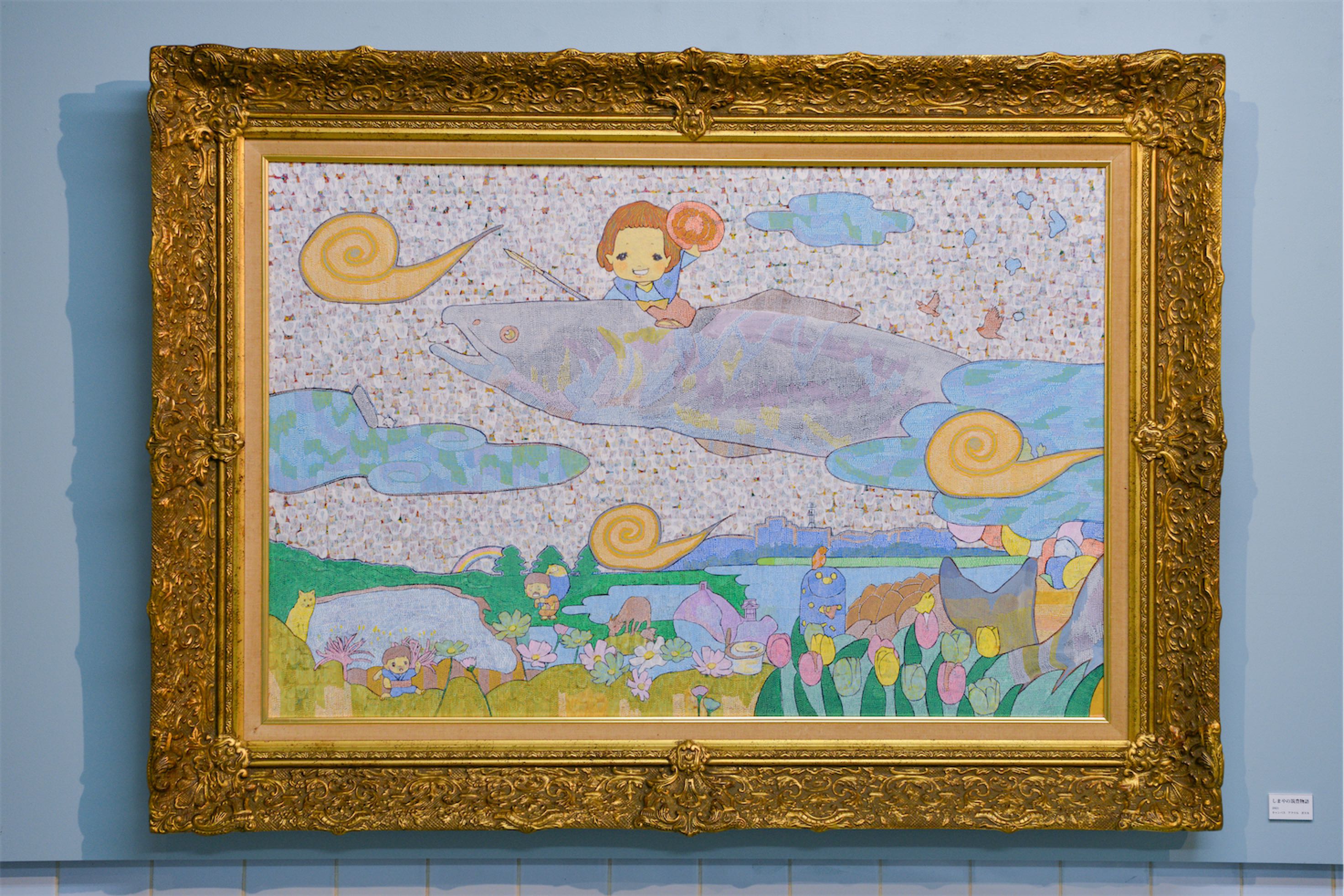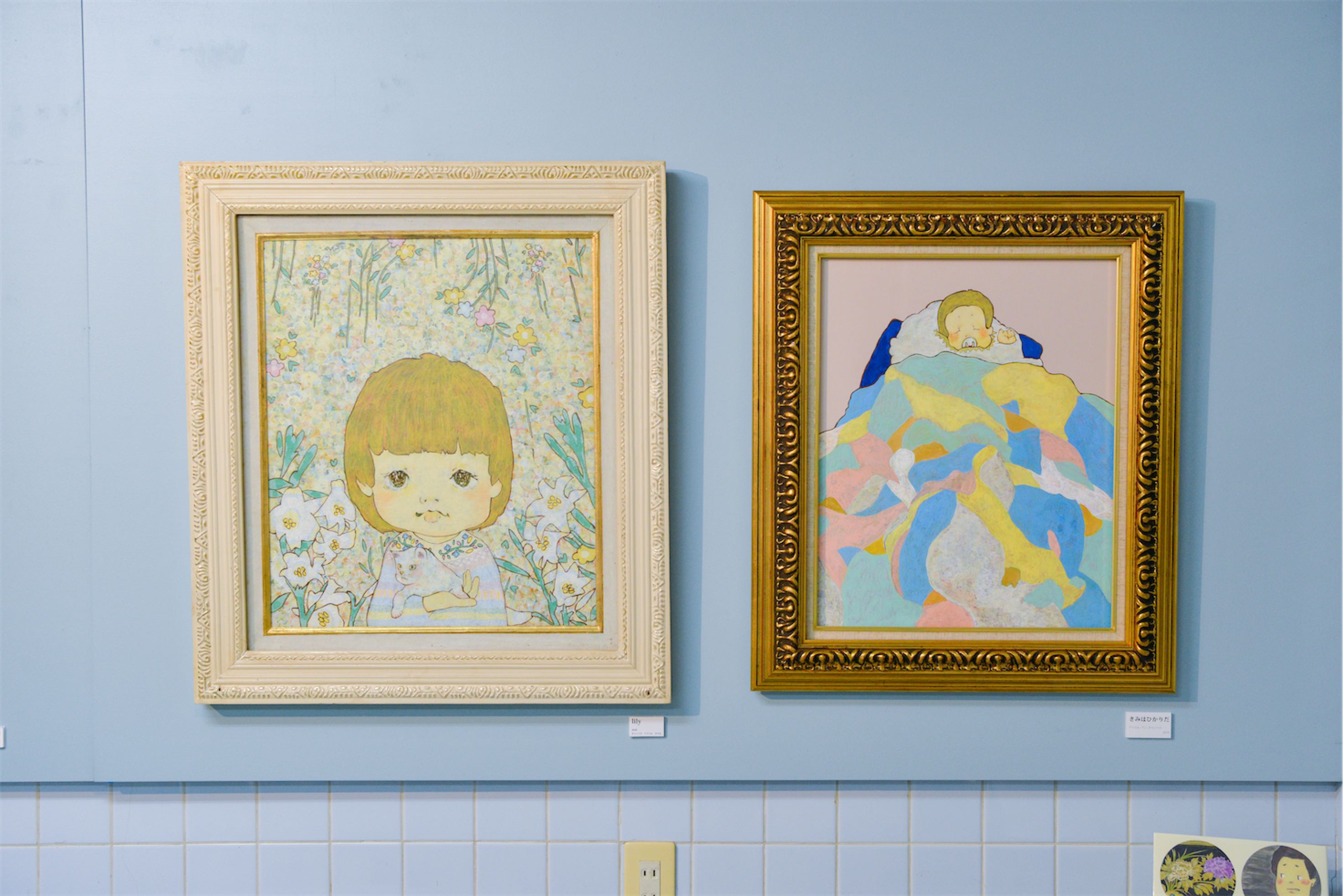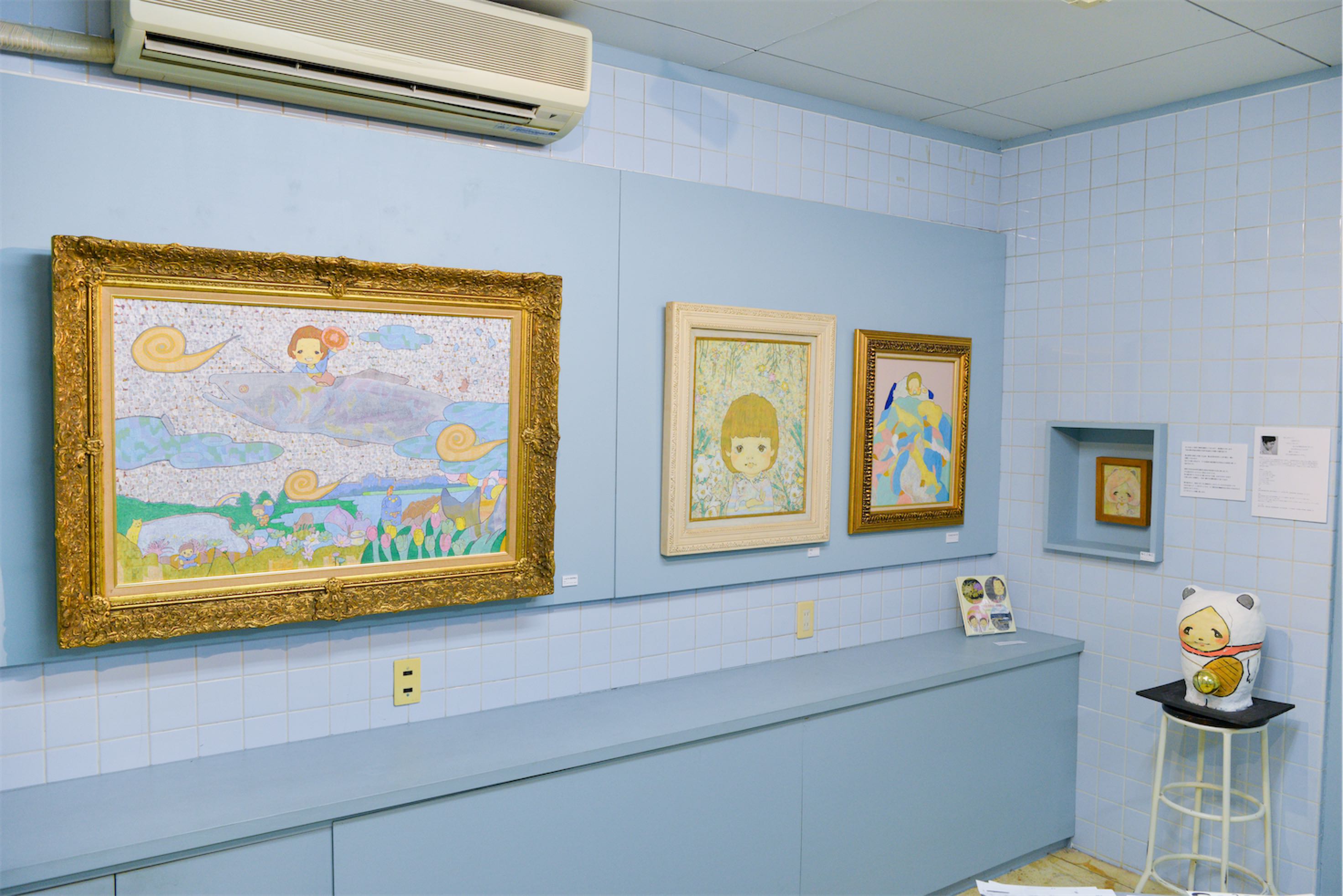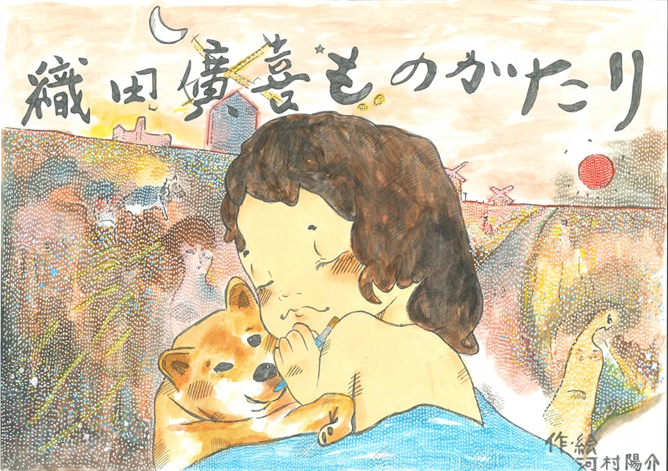 河村陽介さんの作品はあたたかい。「あったかくて、元気がでて、うれしくなって、みんなが絵を好きになって、それぞれの心と心とが繋がってゆく、そんな絵を描きたいです。」そう作家が語るように、多幸感に包まれた作品を前にすると思わず顔がほころび穏やかな気持ちにさせられる。会場メインの展示室には《きみはひかりだ》(2016年)、《lily》(2020年)、《しまやの筑豊物語》(2021年)など、アクリルと水性マーカーで描かれた絵画作品が並ぶ。独特の表情でまっすぐに見据える子どもたちと、点描による豊かな色彩が画面を渦巻き目を楽しませる。本展には平面作品の他に、田川郡福智町の上野焼宗家 渡窯 第十二代 渡仁氏に焼き上げを依頼したという埴輪が展示された。河村さんの作品は「Cake Kanon」(田川)、「アンコル ド パン」(飯塚)など筑豊の町にいくつも常設展示されている。そうしたことからも、筑豊を愛し、愛され、河村さんのアートを通じ人と地域とが繋がっているのだと感じさせられる。本展の出品作《しまや筑豊物語》もまた、河村さんの視点から筑豊を伝える作品のひとつだろう。本作は直方市の仕出し料理店「筑前やまや」との共同企画で生まれた紙芝居作品である。直方市出身の力士魁皇と勝利の花火を上げるおじいさんの物語「勝利の花火」や、宮若市の地名「犬鳴」に纏わる話など、筑豊地区の伝説や現代の物語などを紙芝居として12話を描き、YouTube「しまやチャンネル」で動画配信がされている。地域に寄り添う河村さんならではの魅力を感じさせられる内容であった。