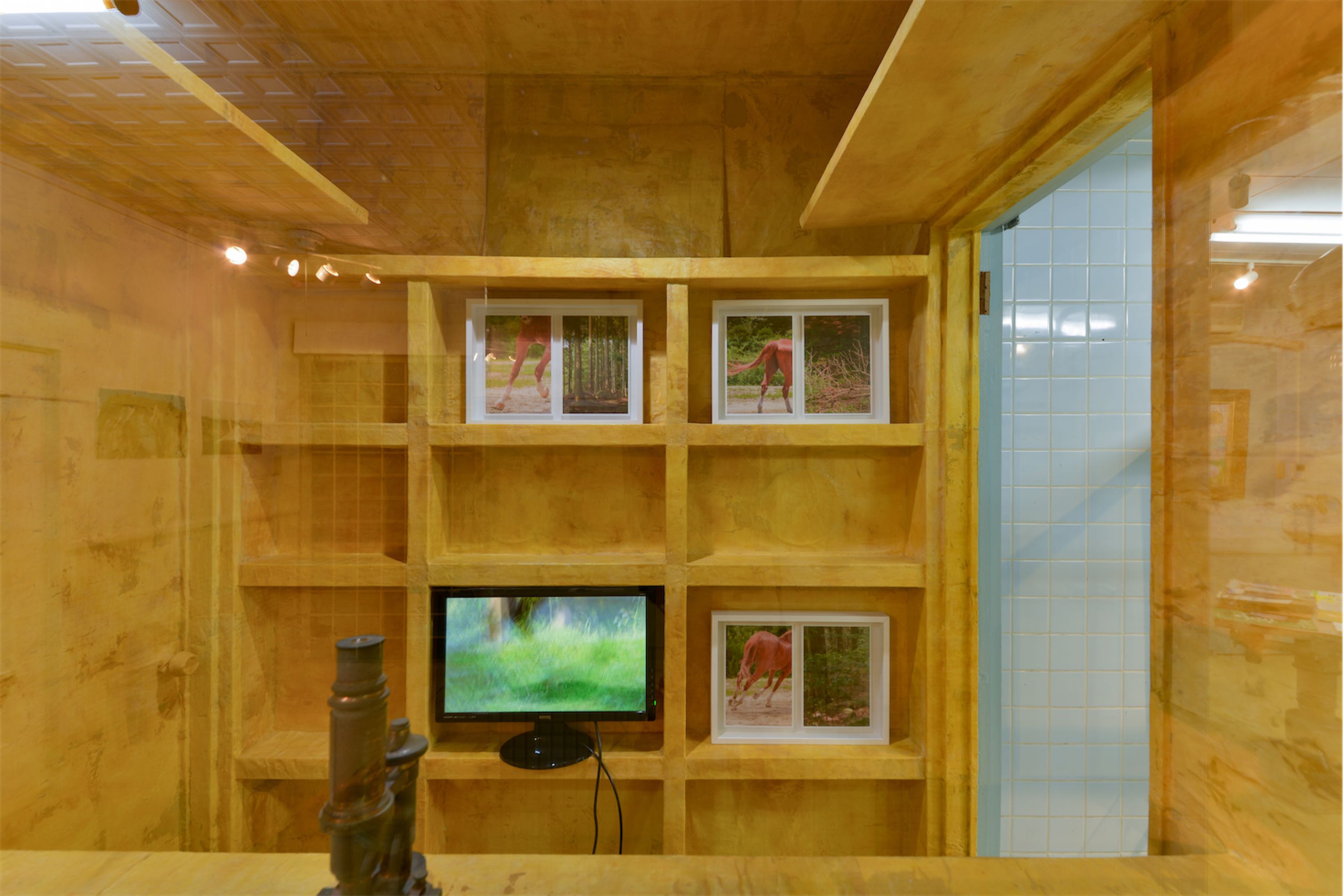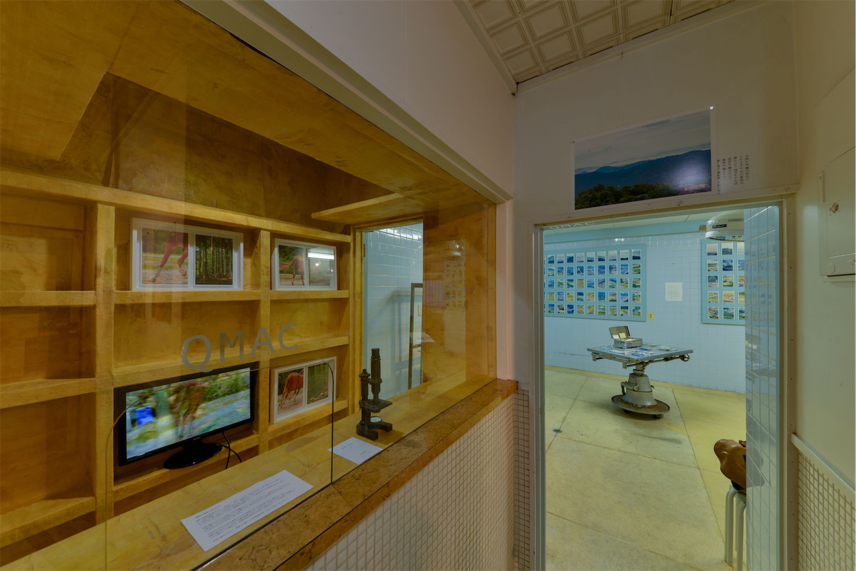長野聡史さんの作品は大きく二つのシリーズで構成されていた。会場に入って正面のフロアには、写真と映像による《馬見/足白》(2018年)が展示されている。遠賀川の源流点である「馬見」とその麓に位置する「足白」。馬見と足立の伝承を基にした本作は、「神武天皇が見たかもしれない光景の再現ではなく、伝承をもとにした未だ見ぬ新しい現代の筑豊のビジュアルの提示」だという。モニターからは、作家の記憶を覗き見るような揺れ動く視点のなか、森の中を駆け回る馬と、穏やかな山中の様子が重なり合うイメージが映しだされていた。映像の横には、神武天皇が見た光景を想起させる白い足の馬と、現在の馬見山の山中が対となって掲示されている。駆け出す馬の動と森の静、古くに伝わる馬見山と現代の馬見山、光と影、そうした対概念を反復させながら、新たなイメージを与えているように感じられた。