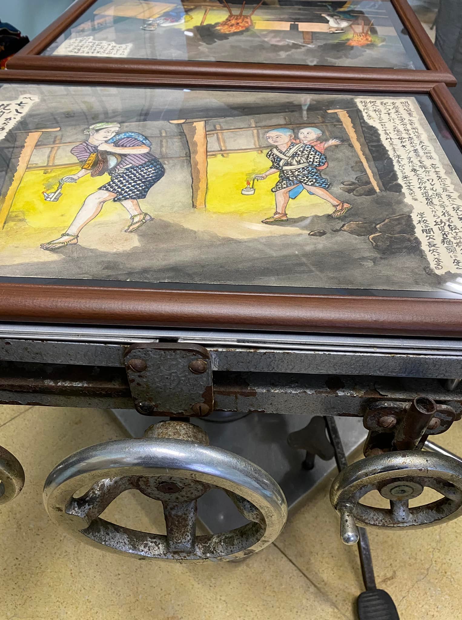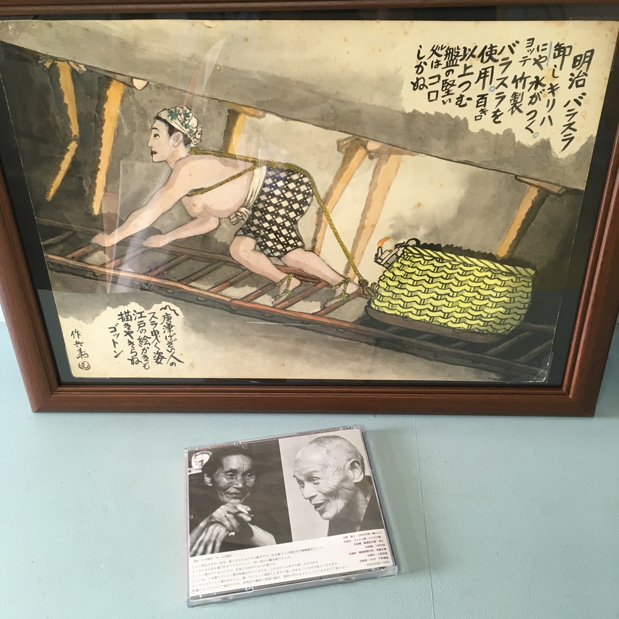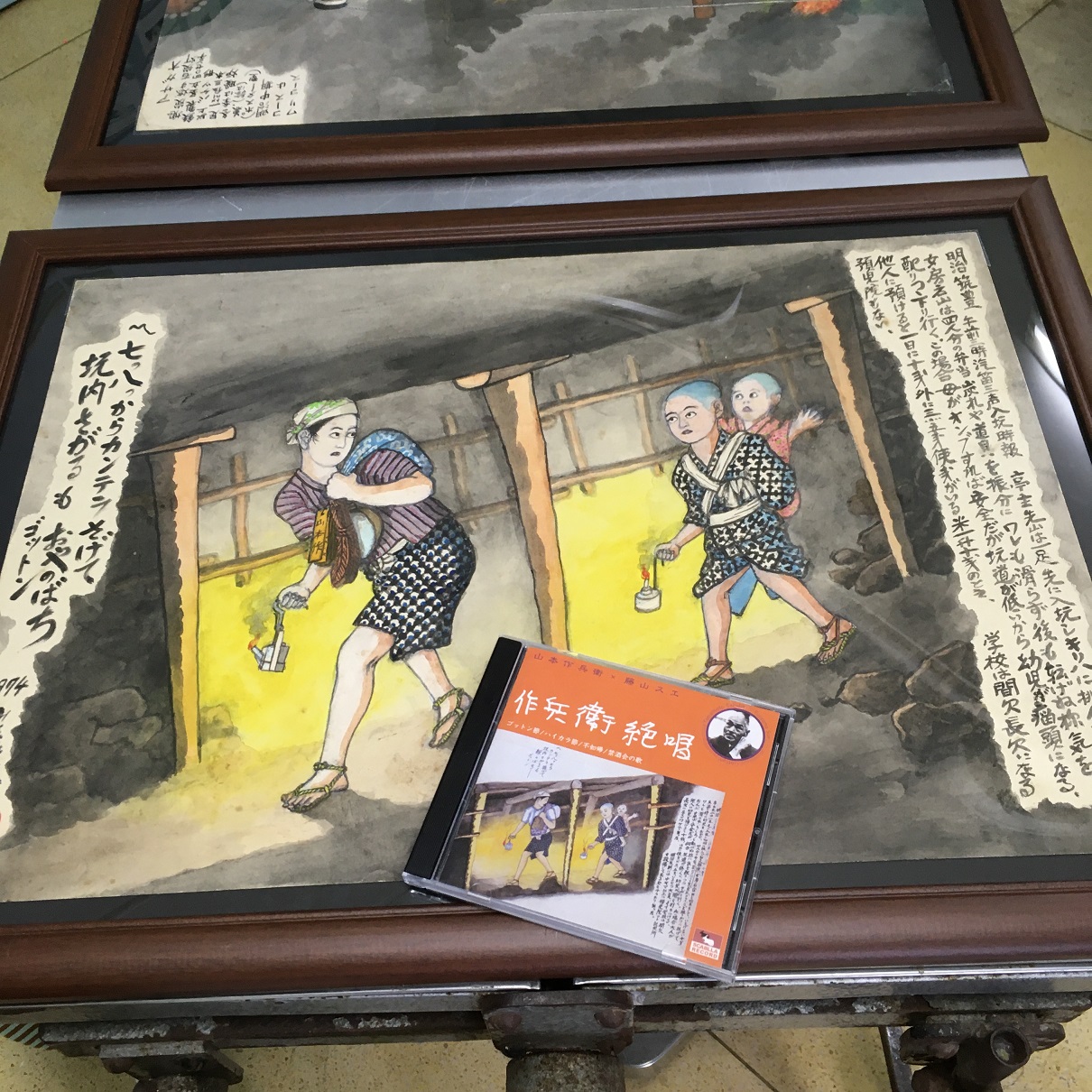 このライブの日に、一日だけの山本作兵衛炭鉱画原画が7点、サプライズ展示されました。筑豊文庫の上野朱さんは山福朱実さんの盟友で、この日のために参加者に見ていただこうと原画を持ってきてくださったのです。メールマガジンでのお知らせが直前だったので、上野さんの貴重な提案も前日となり、多くの方にご案内できず申し訳ありませんでした。上野さんは、作兵衛さんの歌うゴットン節を1968年に録音して、約40年後にCD『作兵衛絶唱』(題字は上野英信)として発行されました。現在では入手しがたい貴重なものです。