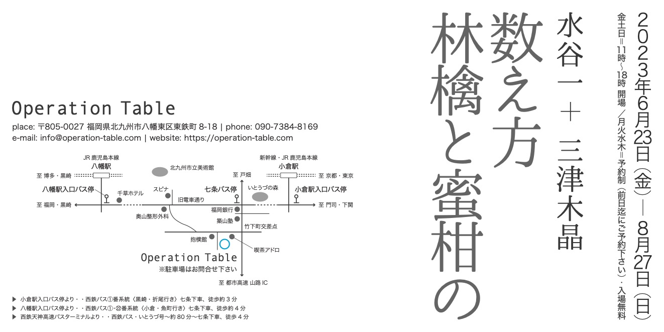 「林檎と蜜柑の数え方」の展覧会のために、私たちの対話は2022年の年の暮れから始まった。その頃は展覧会のタイトルはまだ決まってなく、展覧会のテーマ、マタケマキコさんと水谷一さんと三津木晶という人物、operation table の会場、その5つの「ある」から始まった。その内、私は水谷一という人物をメッセンジャーの対話でしかその人物像を創造することができず、どんな作家と一緒に展覧会をしていくのかと言葉のやりとりを軸にしながら、期待と不安をもっていた。「ない」という事は「ある」という事からカタチづくるしかないのかしら。
