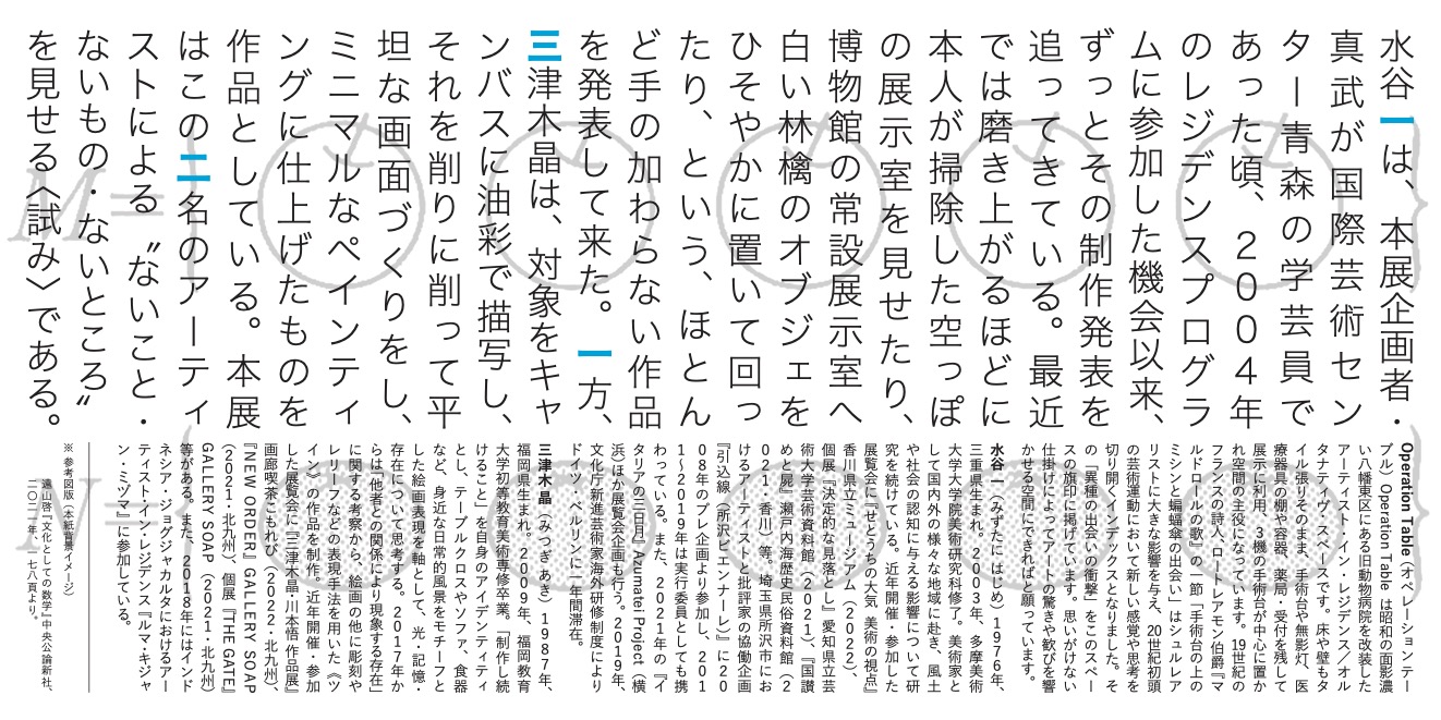 水谷一は本展企画者・真武が国際芸術センター青森の学芸員であった頃、2004年のレジデンスプログラムに参加した機会以来、ずっとその制作発表を追ってきている美術家である。最近では磨き上がるほどに本人が掃除した空っぽの展示室を見せたり、博物館の常設に密やかに白い林檎のオブジェを置いて回ったり、という、ほとんど手の加わらない作品を発表してきた。一方、三津木晶は、対象をキャンバスに油彩で描写し、それを削りに削って平坦な画面づくりをし、ミニマルなペインティングに仕上げたものを作品としている。本展はこの2名のアーティストによる「ないこと・ないもの・ないところ」を見せる〈試み〉である。