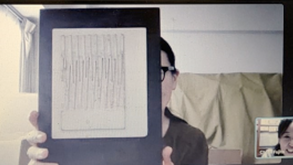 オンラインインタビュー時の写メ画像、三津木が持っているのが門のレリーフ作品