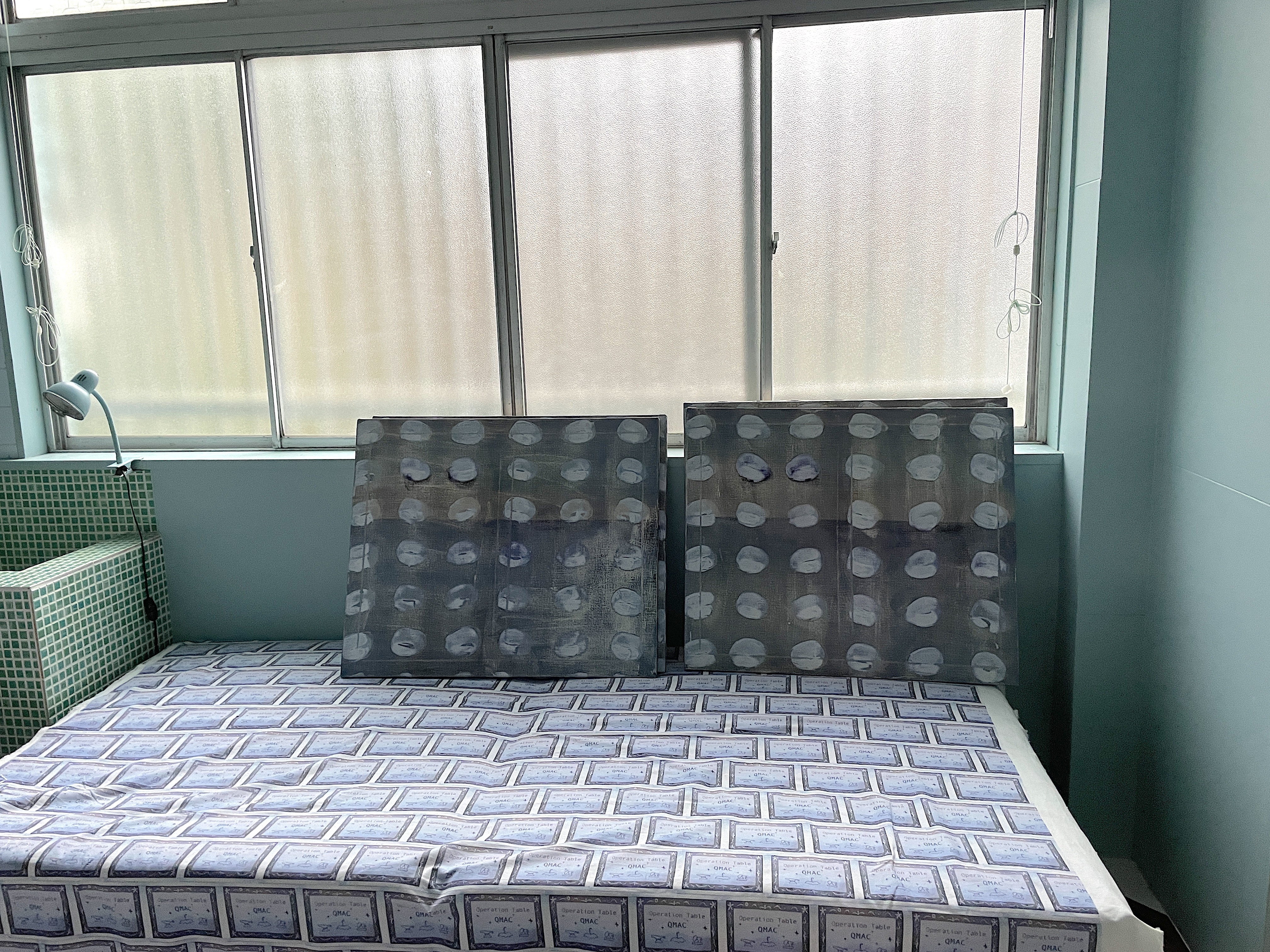 20~21 三津木の真二つに割れた湯呑を描いた「一つ(二つ)」のキャンバス4枚は壁面には掛けられてなく、最初、部屋の入口に重ねて置かれていたが、ベッドの上に2列に並べ替えられた。