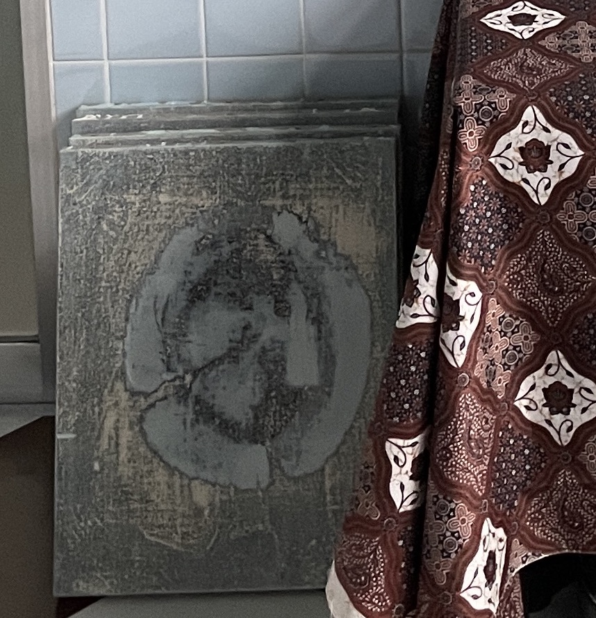 そうです。その150号が4点を展示した前期と、後期は門のレリーフが130点でした。あ、レリーフはいま、私の身体の周りにあります、これです。