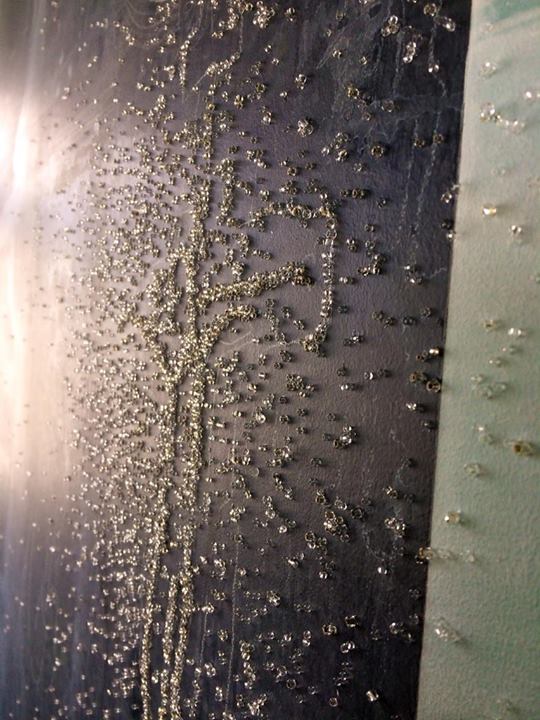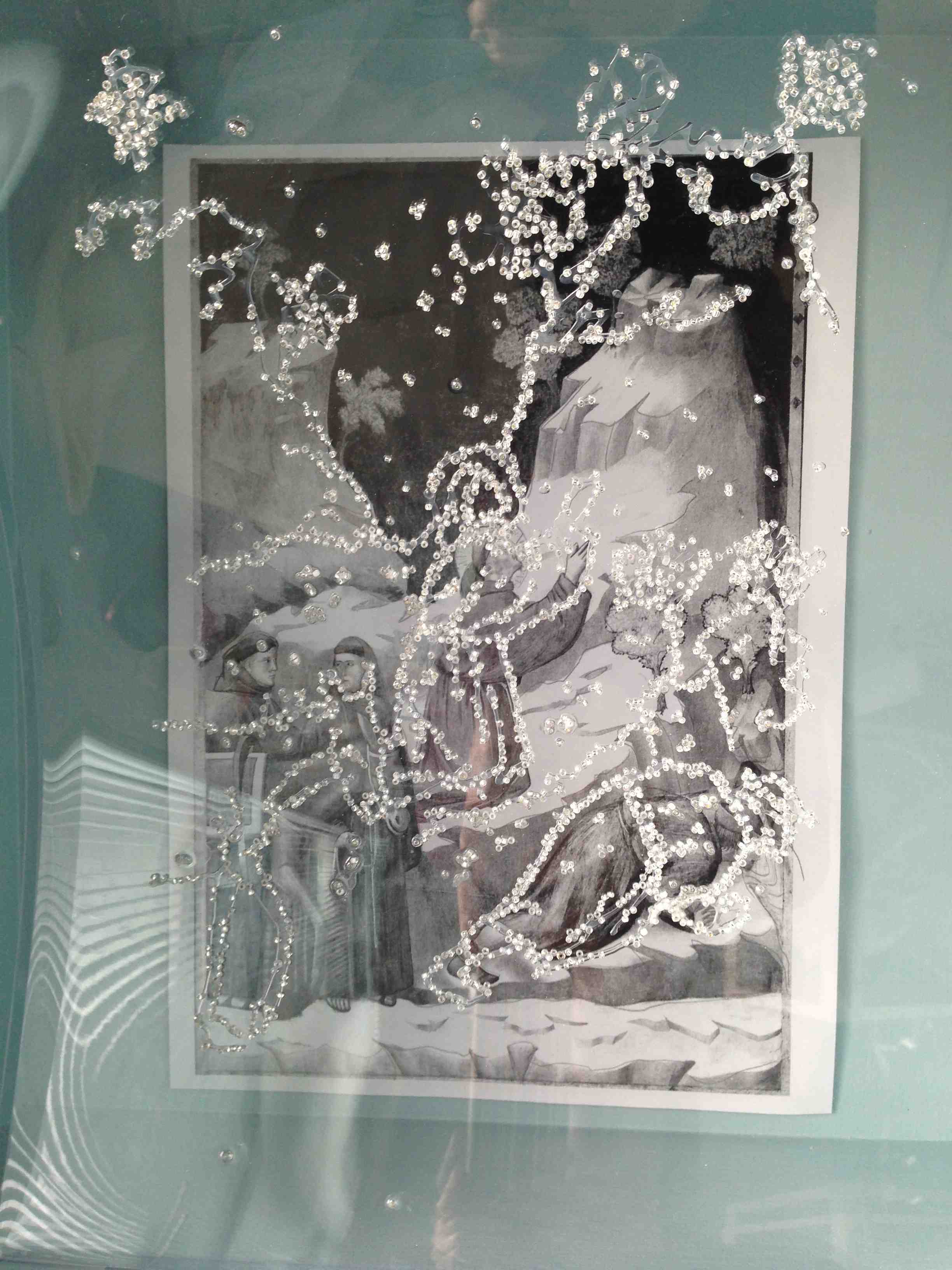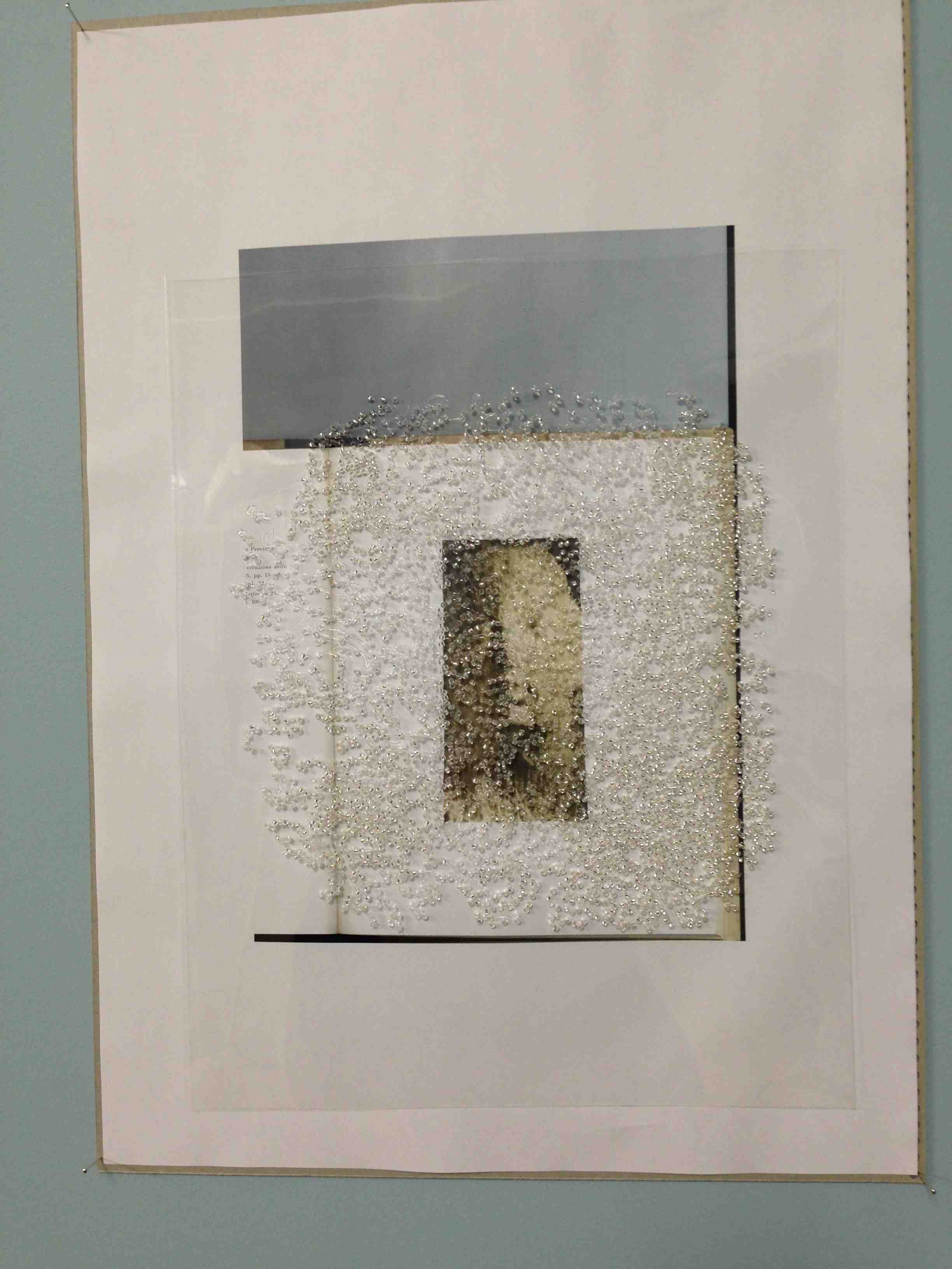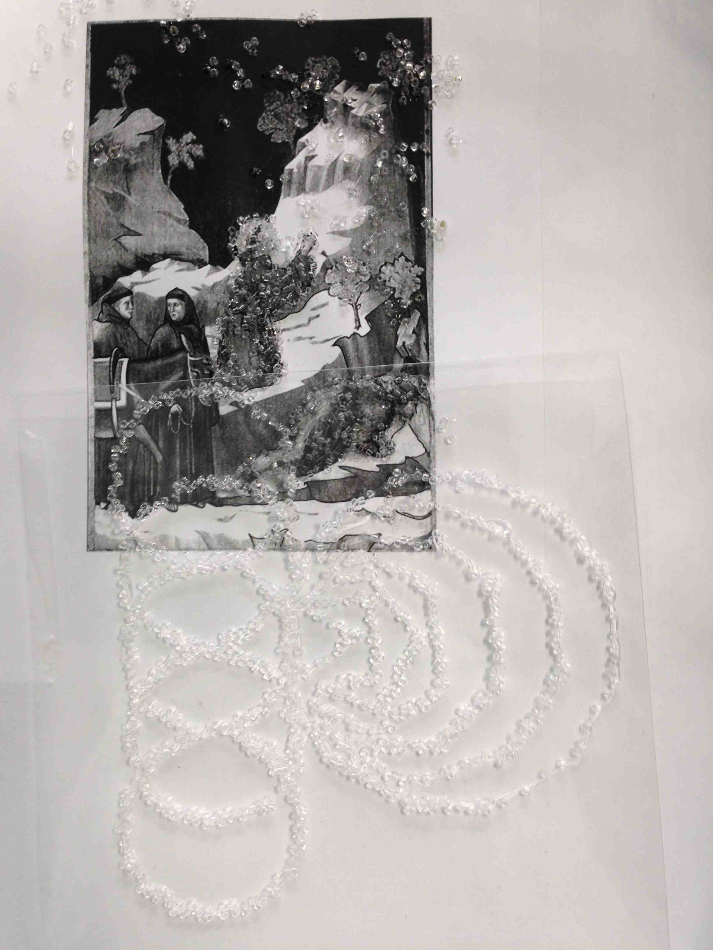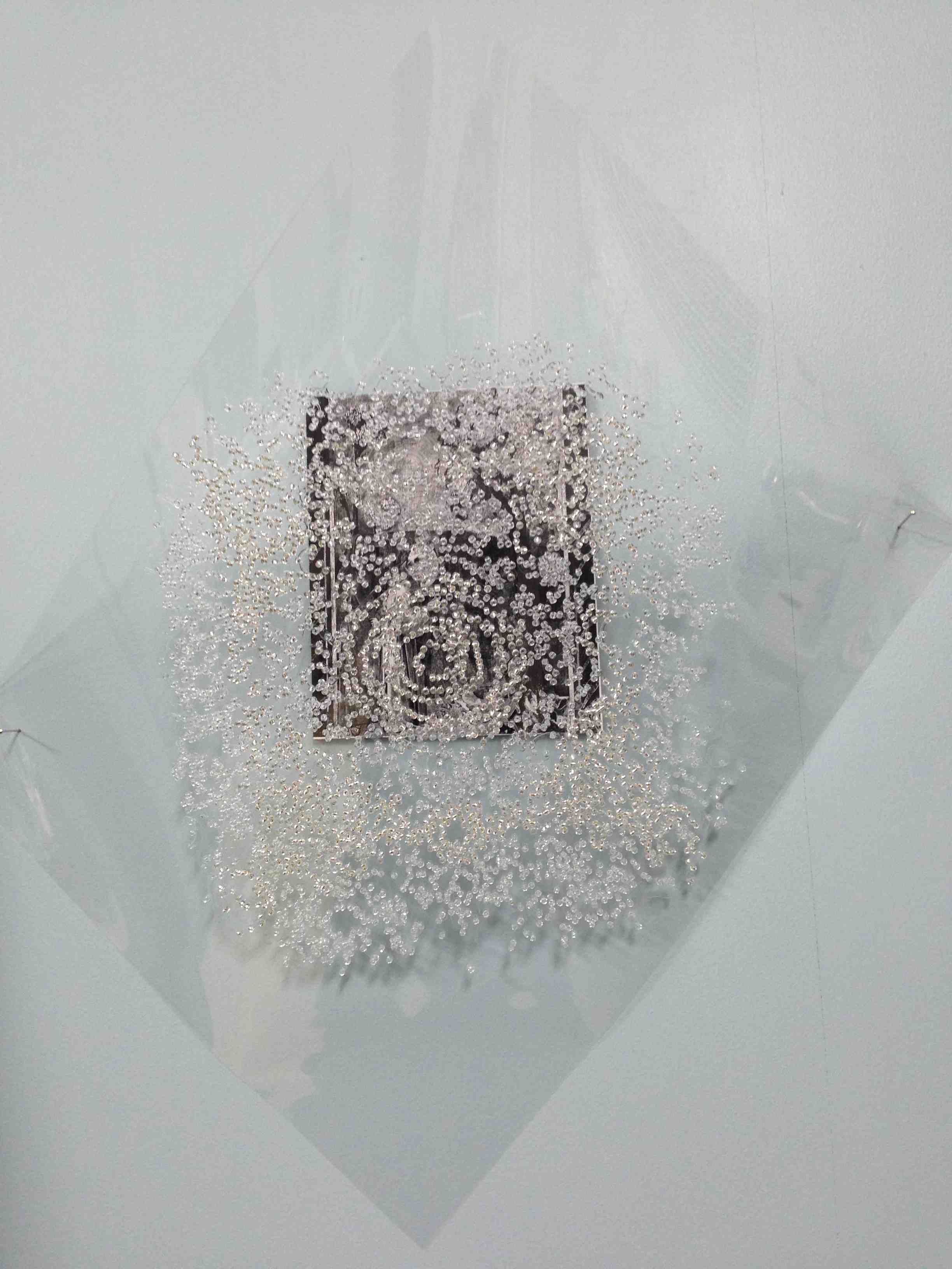 「愛のレッスン」展で、私はピンク・グリッドの上にビーズで天使のシルエットをかたどった小品を購入した。額装後、高知まで送付された作品には、これはメッセージを伝える巻物を携えた、ベルニーニの天使像であると書かれた彼女の手紙が添えられていた。