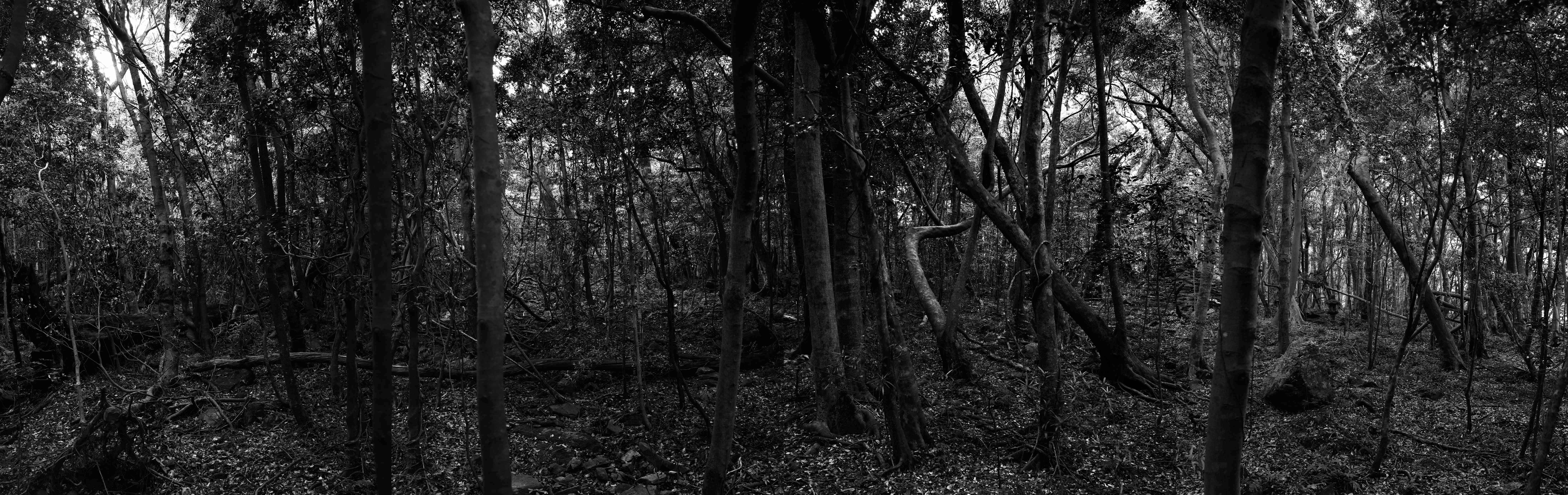 山本糾は、「考える水」「暗い水」「落下する水」という、奥深い山中の滝や山頂の湖沼、渦巻く海面など、水の情景や様態を捉えたシリーズで知られてきました。水はときには工場の煙突から勢いよく上る煙となった水蒸気であったり、空になった薬品壜の内壁に張つく水滴であったりもします。ここ数年は毎回参加している「対馬アート・ファンタジア」のため対馬を訪れ、霊気漂う神社の森を撮ったり、北端にある自衛隊の通信基地の島「海栗島」を対岸から捉えた作品を発表しています。