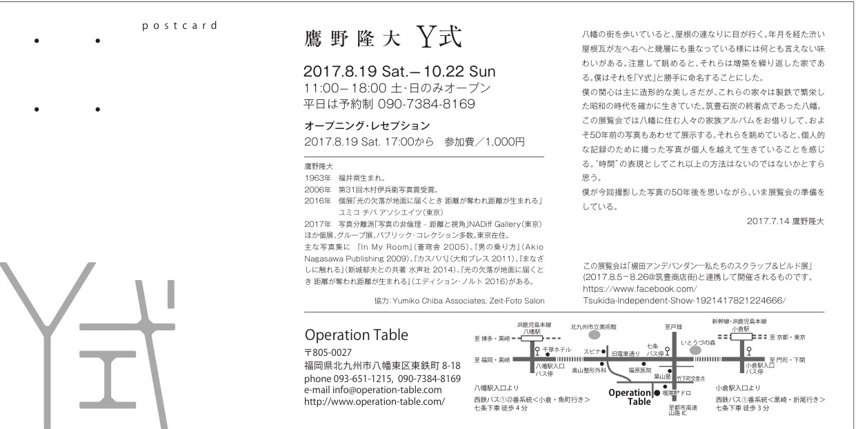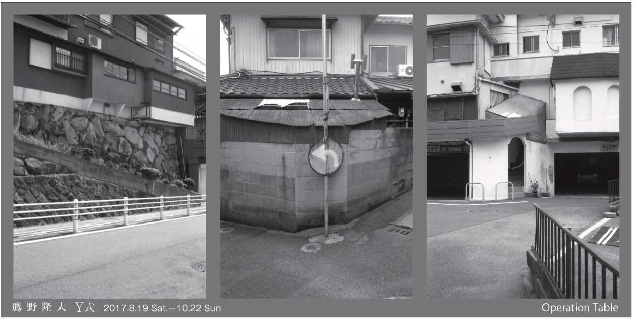 今回、鷹野氏は展覧会場である Operation Table の立地する八幡地区の風景、とりわけ家屋の外観にレンズを向けた。私の住居は Operation Table から1キロと離れておらず鷹野氏が今回撮影した地域は私の生活圏内でもあり、よく見慣れたはずの景色である。が! そこには何とも見慣れない景色が写っていて大いに驚いた。「ああ、あの場所ね」ではなく、「これ、あの場所だけど、こんなんだっけ?」なのである。全くもって写真が真を写していない。いや、待て、逆に、私が真だと思っていたものは全く真ではなかったということだ。真には色々な形がありうる。こうした既視感のリセット作業は心地良いものだ。