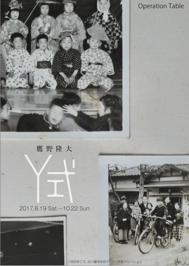 鷹野氏の撮影した風景写真は主に家屋のハイブリッド感あふれる造形要素に注目しているのだが、それらの家屋の外観を生み出すもととなった八幡地区の歴史を感じさせる一つの要素として、地元の古い家族アルバムから借用してきた家族写真の一群が会場に並べてあった。昭和30年代のものが多いようだ。昭和40年代生まれの私にとってはそこでの生活感は見慣れたものではなく、その忘却の過程を共有していないので、身近ではない生活感を見ながら現在の身近な生活圏に繋げていくというスローな翻訳作業を要したが、その時代を共有した世代にとっては翻訳作業を介さずに直感的に得られるものがより多くあっただろう。