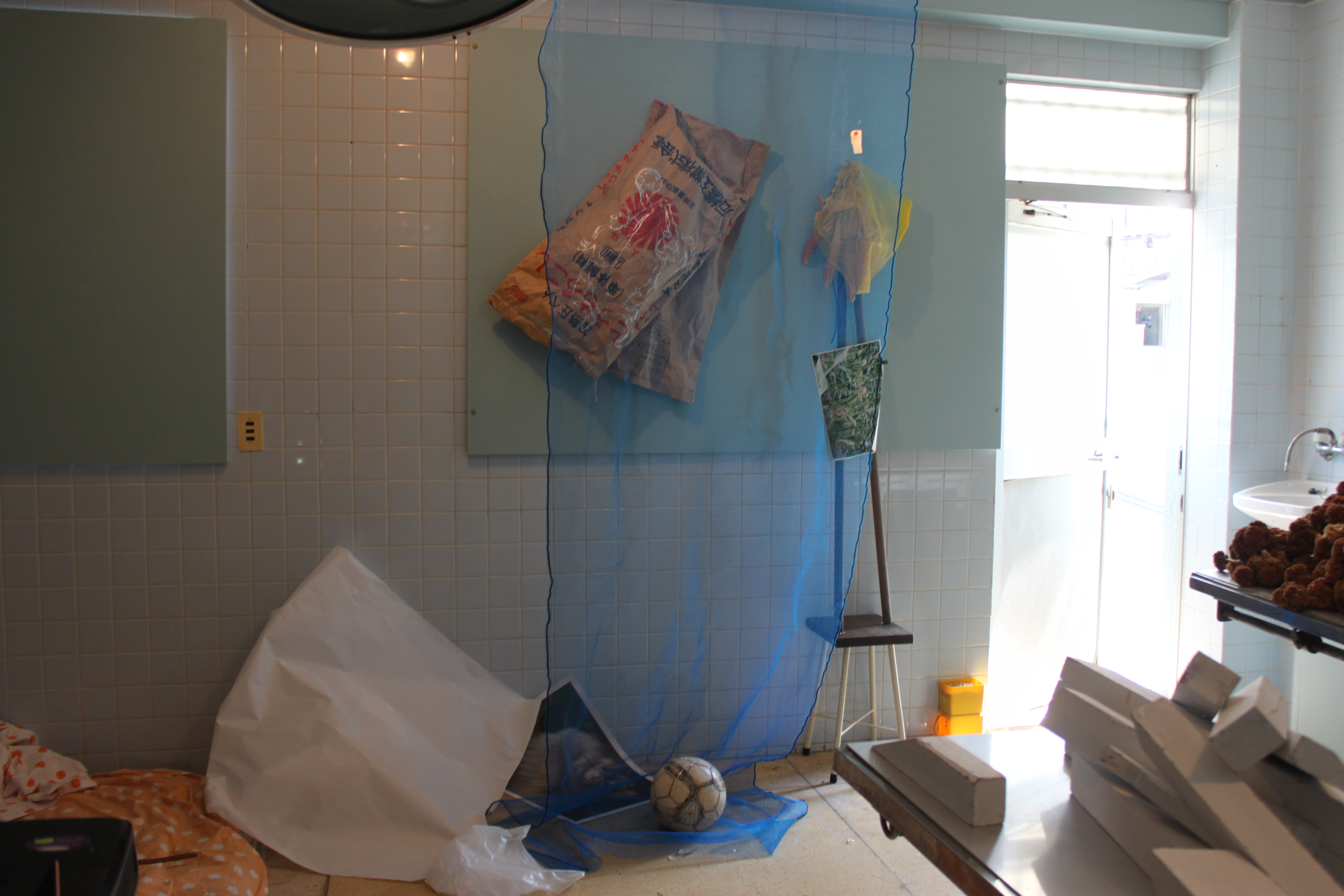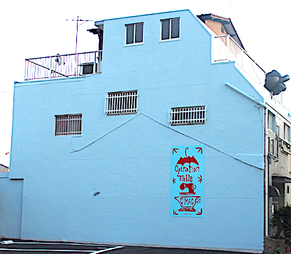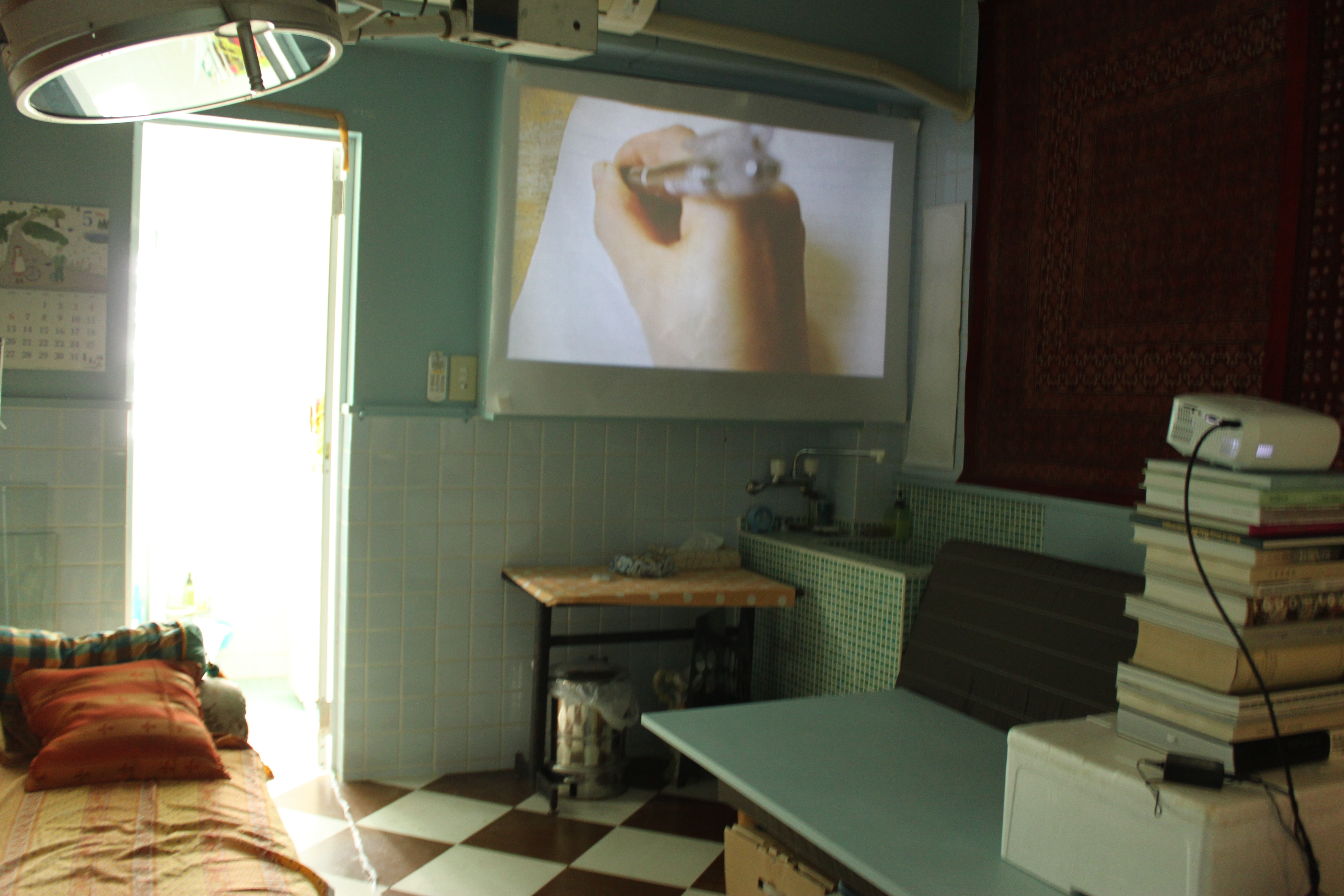 40分くらい続いただろうか。終わるころにはボールペンが16本床に散らばっていた。しばらく体の力が抜けそのまま椅子に座っていたが、気分転換にギャラリーの表に出た。室内よりは多少涼やかか。動物病院を一部改装したこのスペースは、オーナーの実家だ。どこからでも目に付きそうなグレーを帯びた空色の一軒家。展示室には手術台や手術用の照明器具がそのまま残り(ギャラリー名“Operation table”の由来でもある)、壁もタイル張りで、病院の処置室の雰囲気が今も漂う。この個性的な空間を、アーティストたちは見事に自分の表現世界へと取り込んでいくから毎回驚嘆する。