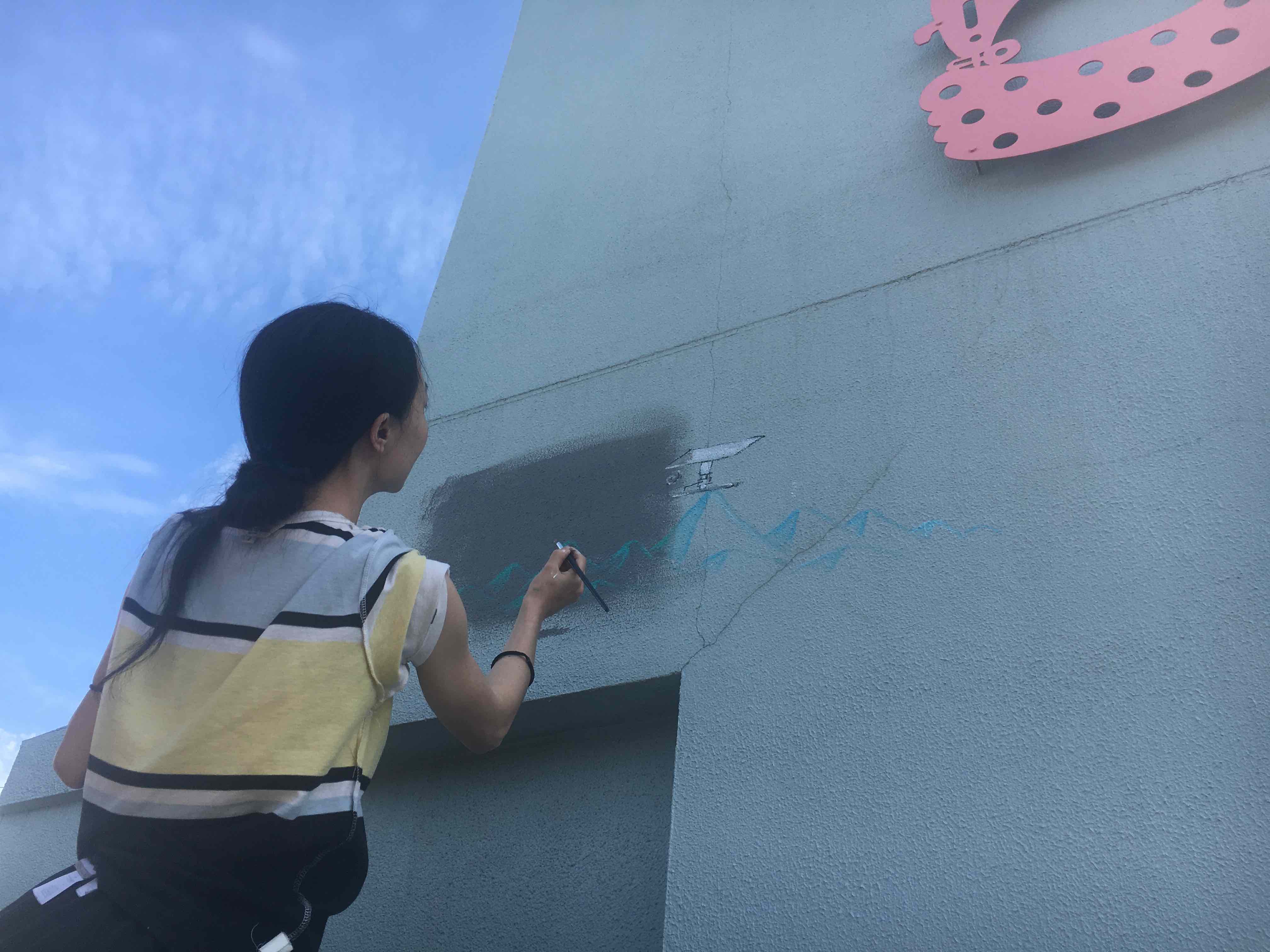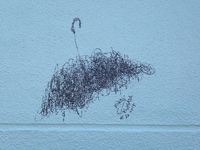 ゲストのパフォーマー、村田峰紀は、Operation Table/QMAC外壁にはじめて壁画、コウモリ傘のドローイングを残したアーティスト、今回は壁画改作パフォーマンスのために北九州にやってきます。
