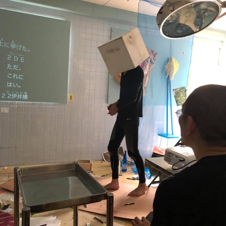 FK28zak(6)-bisのオープニングイベントは村田峰紀のパフォーマンスで幕を開けた。ううおおん、んんぐうういいう。木箱から荒い息遣いとともに、唸り声が漏れる。白い木箱を頭に装着し、黒いボールペンで合板に渾身の力を込めドローイングしていく。途中で芯が折れても、しばらくはそのままガリガリとボールペンの本体の先を押し付け、板の表面がけば立っていた。作品や展示台をぬうように、所せましとおかれた椅子に観客は座っている。集中して見ていると、こちらも息を吸うタイミングを失いそうになる。時折ドアから吹き抜ける風に少し心が落ち着いた。村田は小型マイクを装着していた。音声を文字に変換するアプリによって漏れる声は瞬時に言語化され、背後の壁に投影されていく。意味を孕まないはずの音声が、中には「そういう芸へぇへぇーいかわいい。」「音芸家ねぇ。」「もう。ねえ。はい。今の日本の運用兵がいい。」「コストを負担」などと変換され、意表を突かれる。言語と行為の間に、捉えがたい奇妙な関係性が生まれては消えていく。あふれる言葉は、人間の暴力性や痛々しいまでの情念が時おり透けて見える一途な行為の意味を逆に削ぎ落し、純化していくようだった。