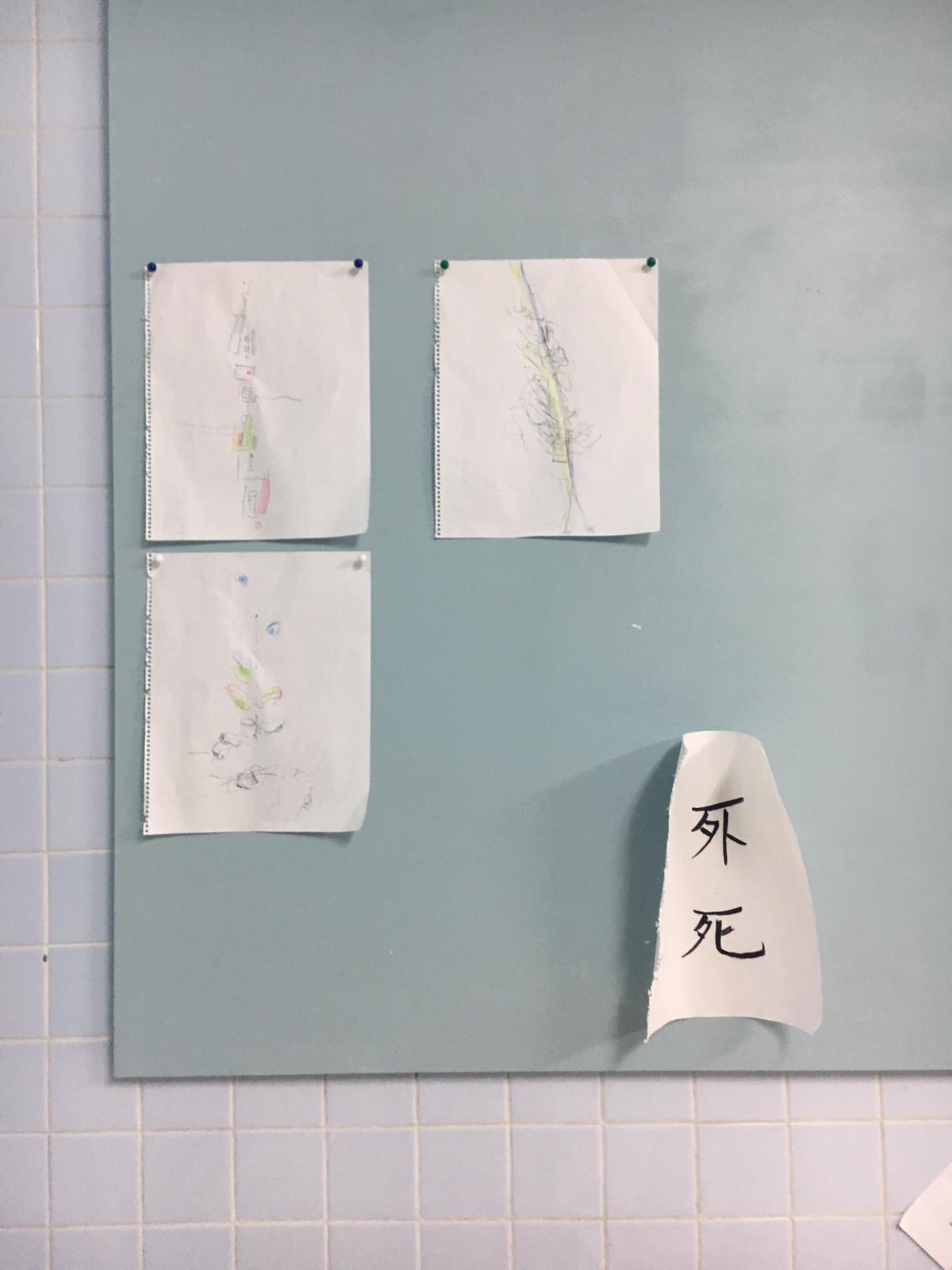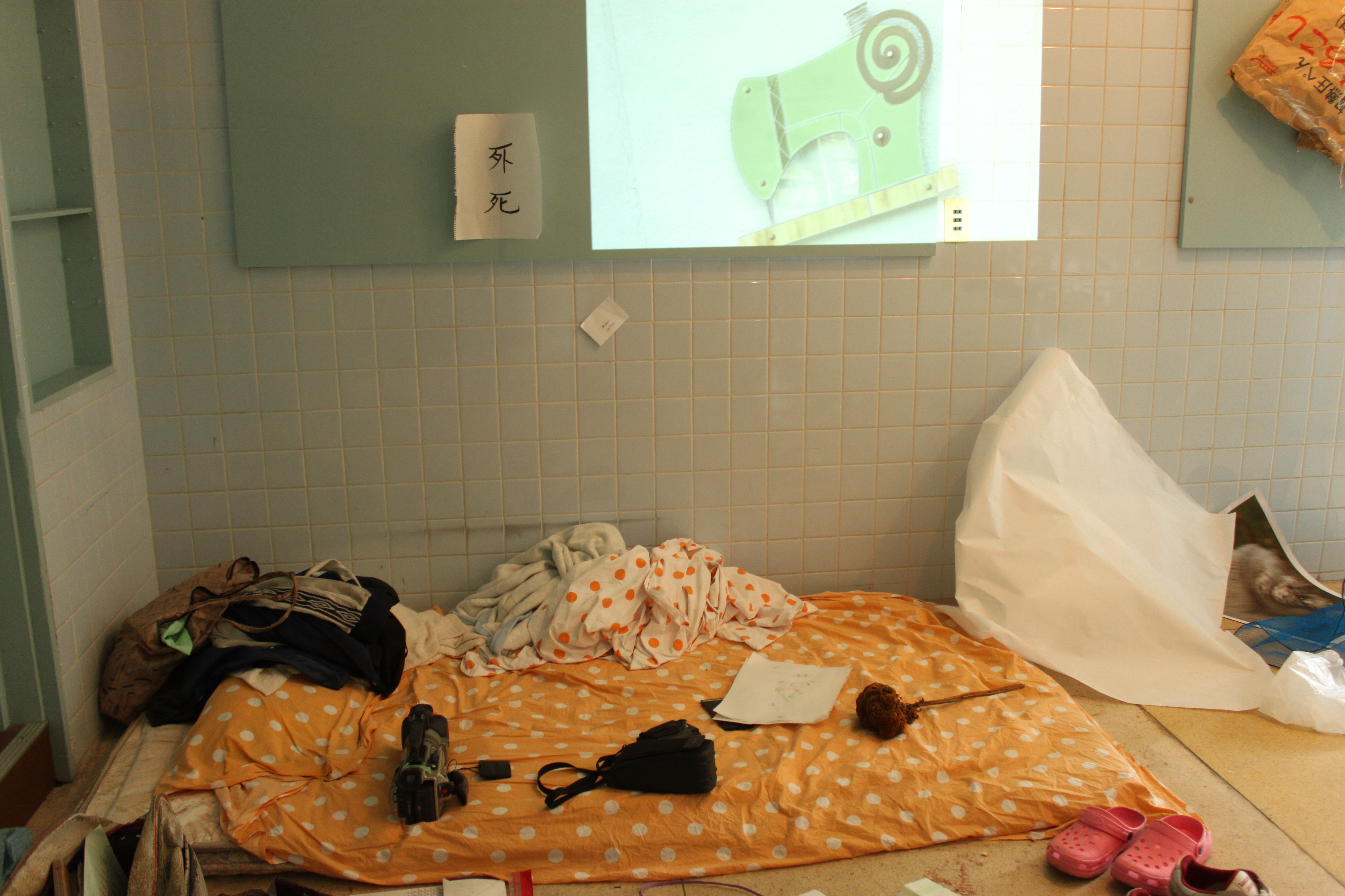 メインギャラリー正面には、大木裕之がOperation Table/QMACを訪れ滞在し、「アクション」した痕跡の寝床がそのまま置かれています。その壁面にはドローイングが貼られ、近辺や市街地を歩き回り撮影した映像作品「イ・キ・シ」(12分)を上映。