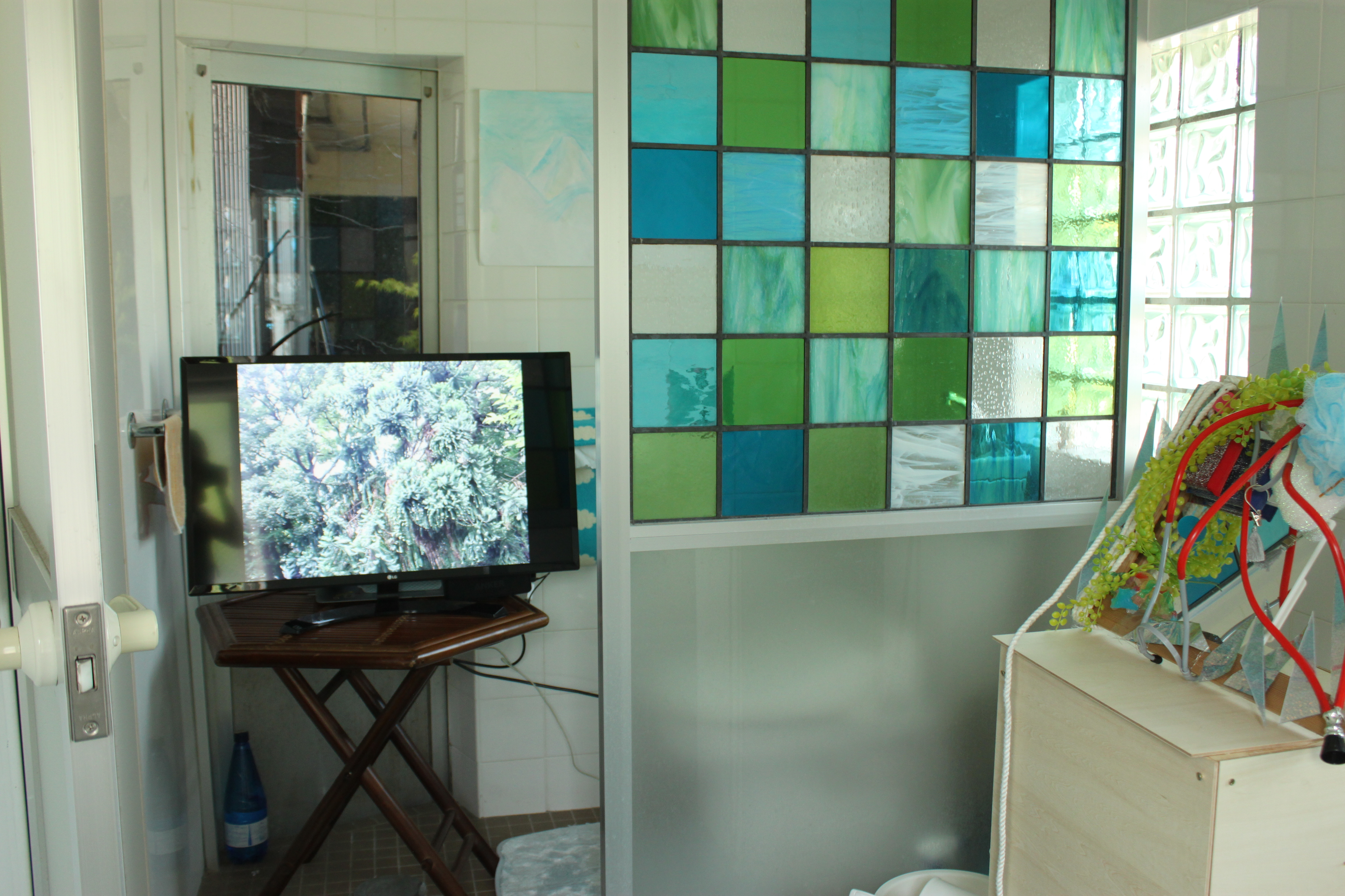 大木ゾーンの傍らにひっそり置かれた小さなキャンバスを中心にしたオブジェは、トモキヨの旧作、これに関連する「風景と風景画の間」映像とインスタレーションが奥のバスルームに、そして隣室では映像作品「文字書くために」を上映しています。