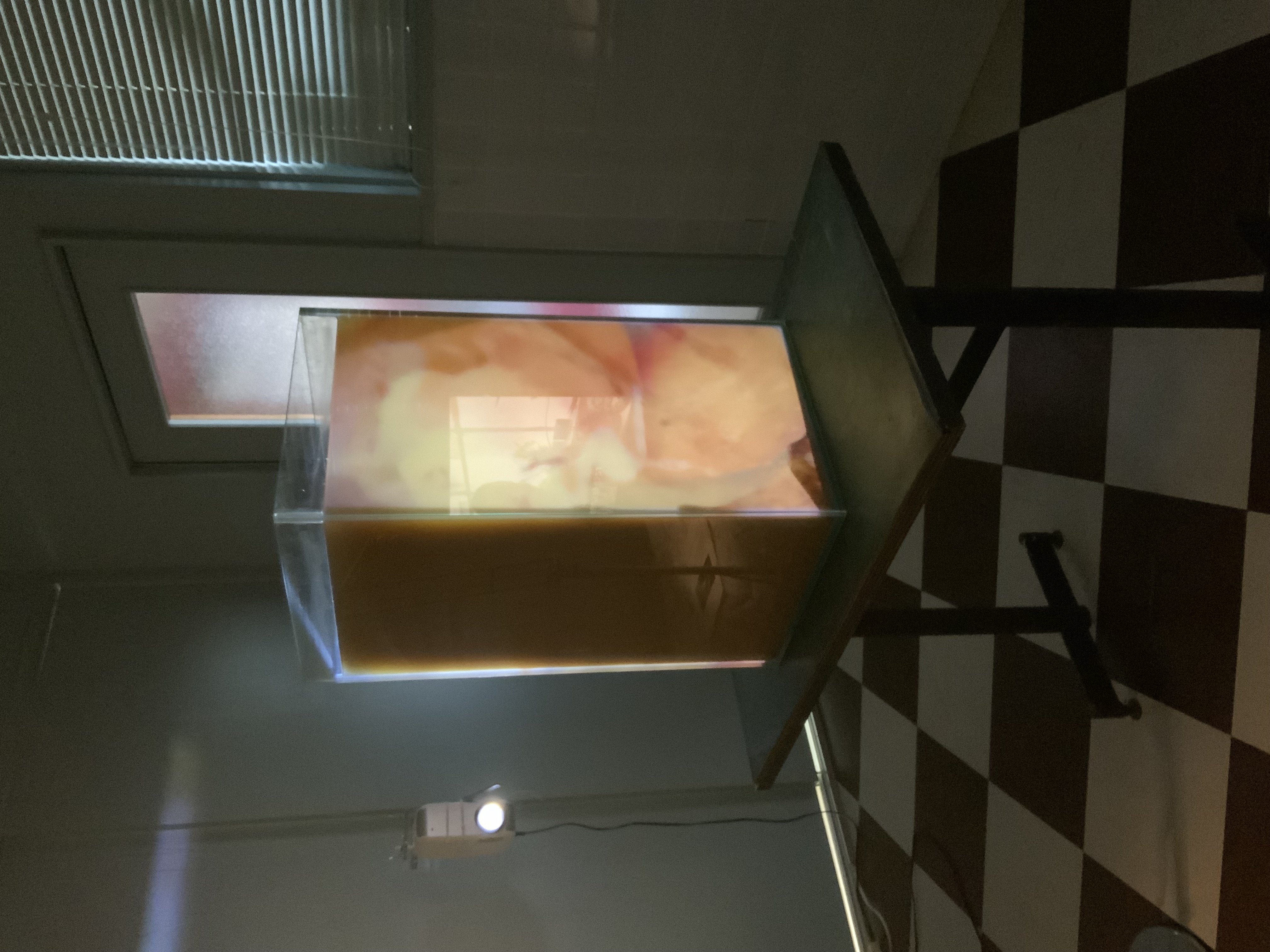 最後の1点は山本聖子による映像インスタレーションで、レジデンスとしても使われる奥の部屋をまるまる使っていた。中央に透明の容器を置き、側面に2方向から映像が投影される。容器に入っている液体をかき混ぜると水が濁り、画像が鮮明に浮かび上がった。