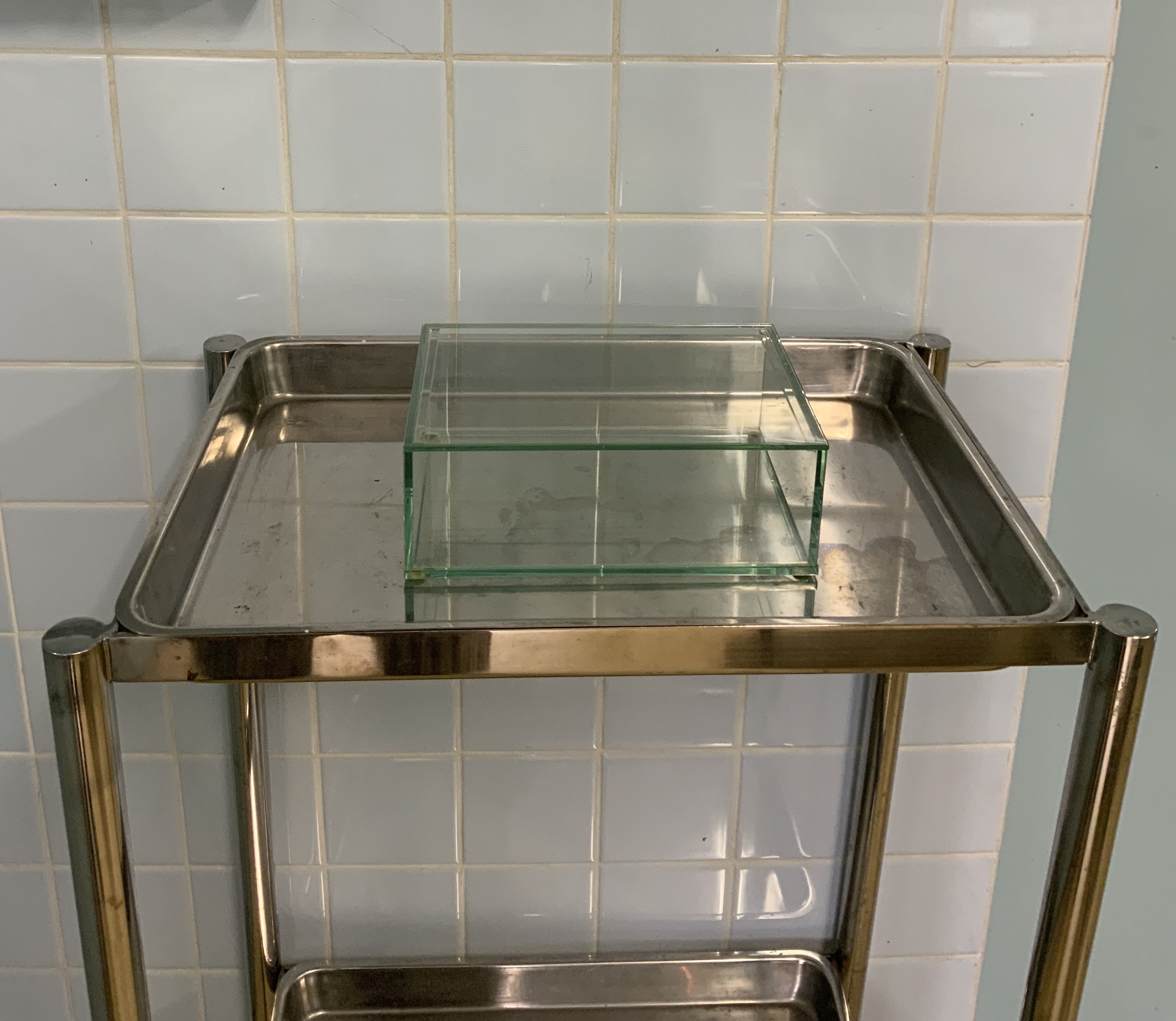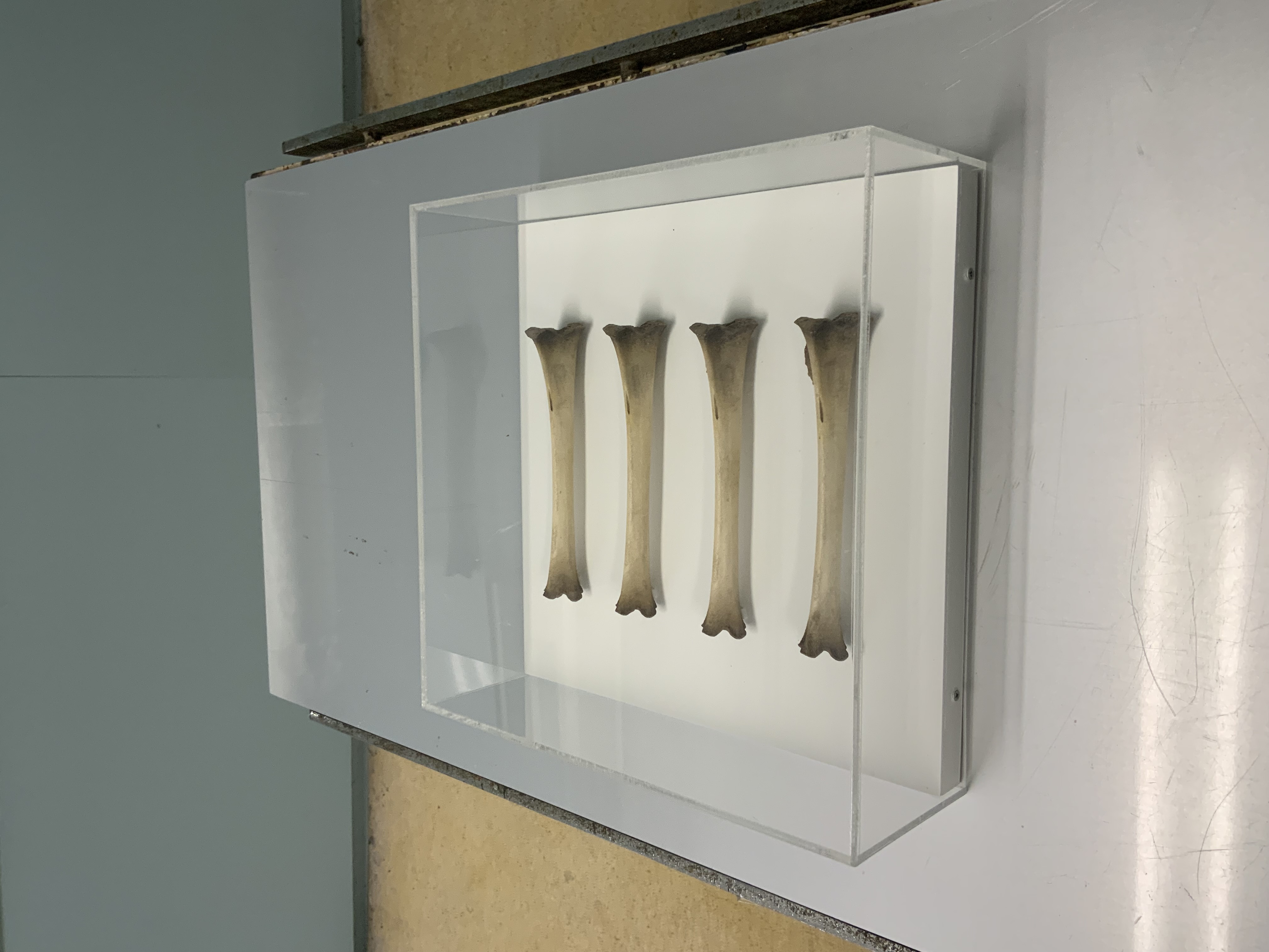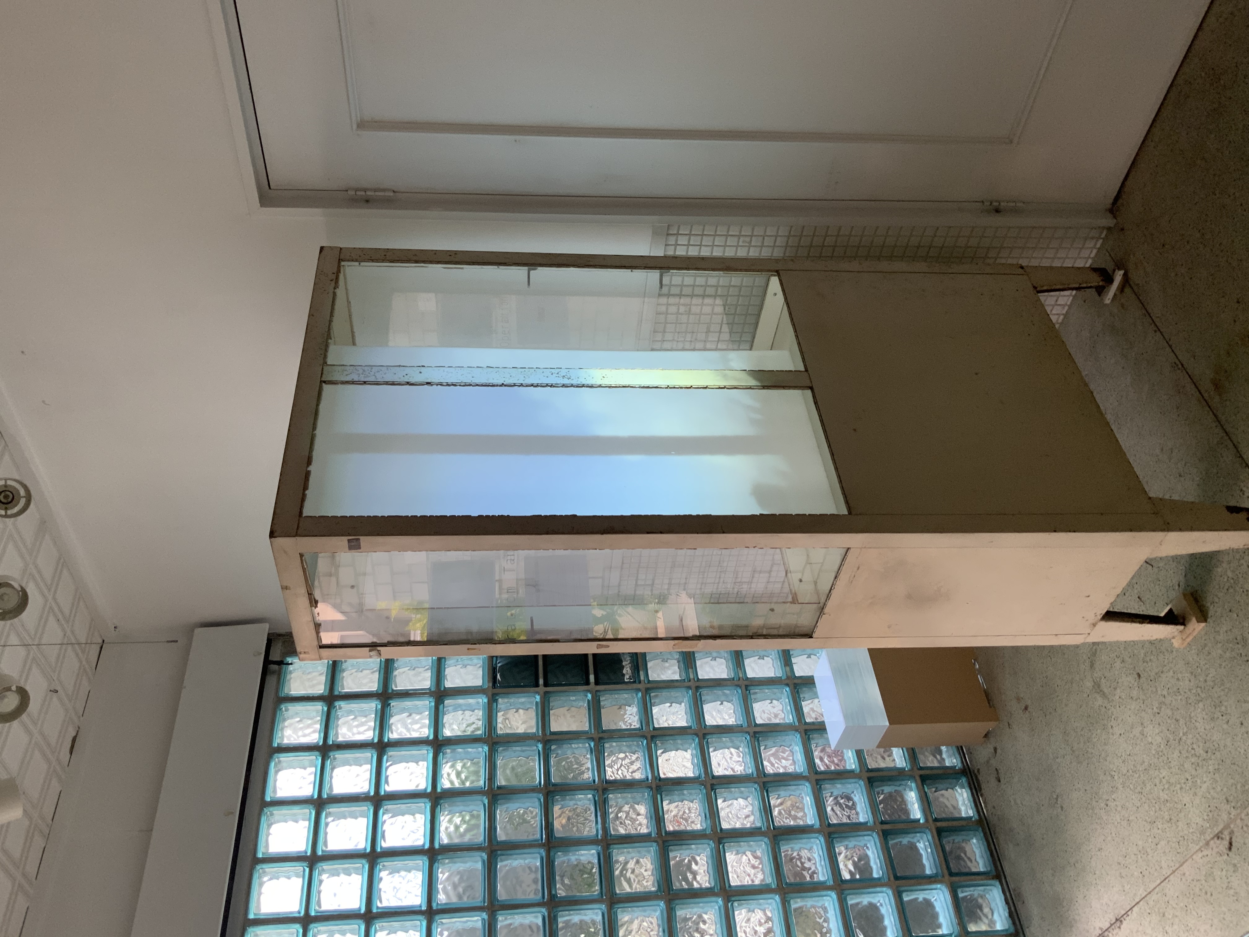 まず玄関を入ってすぐのスペースに、古賀義浩による映像作品があった。四方にガラスが嵌まった棚(Operation Tableの備品で動物病院で使われていた棚)の中に白いアクリル板を立て、外側から映像を投影してある。内容は確か空を大きく捉えた風景であったと記憶しているが、明るい場所なのではっきりとは見えない。棚の枠板がアクリル板の中央に影を落として、茫漠としたイメージにざらりとした触感を添えていた。
