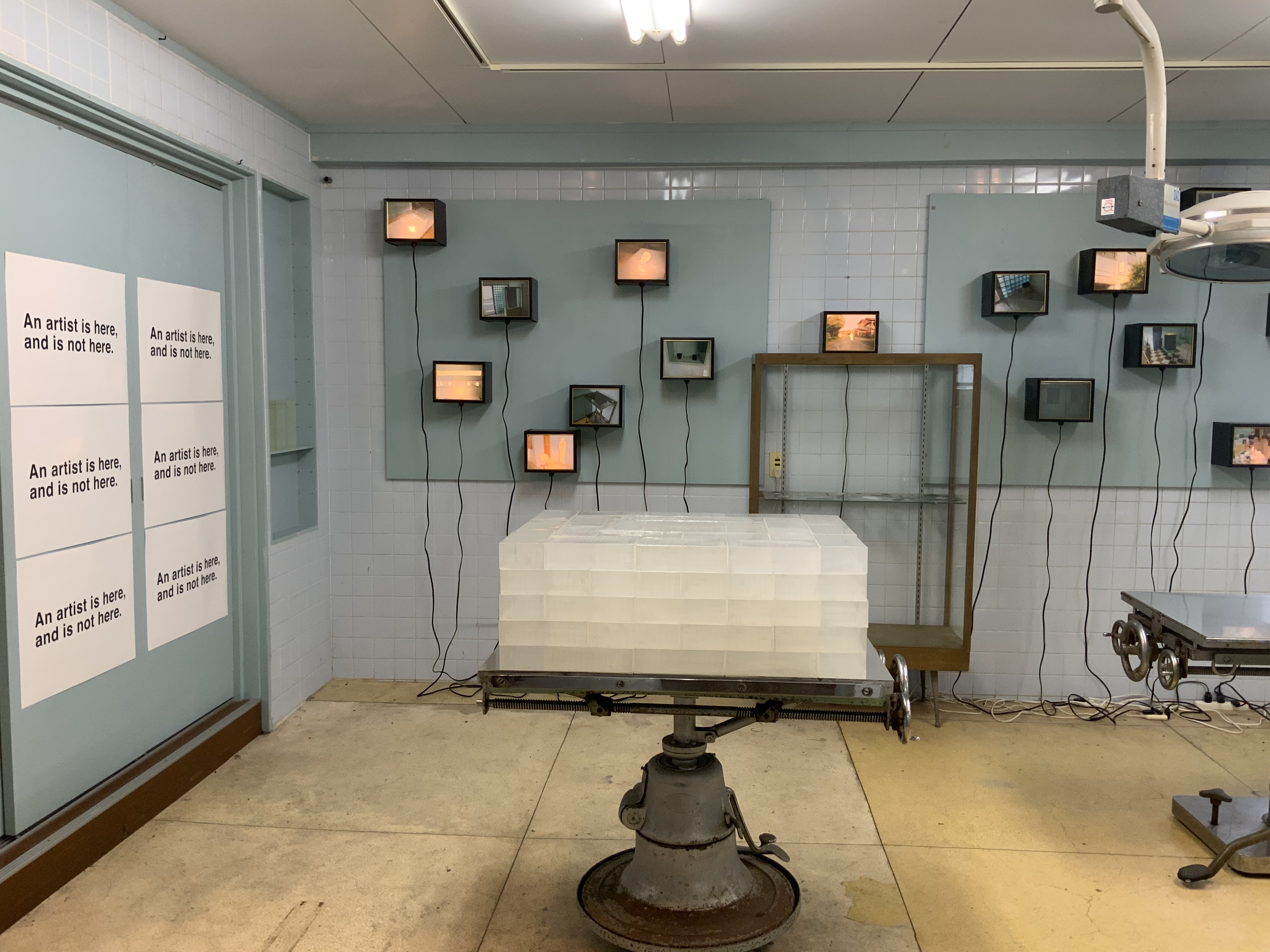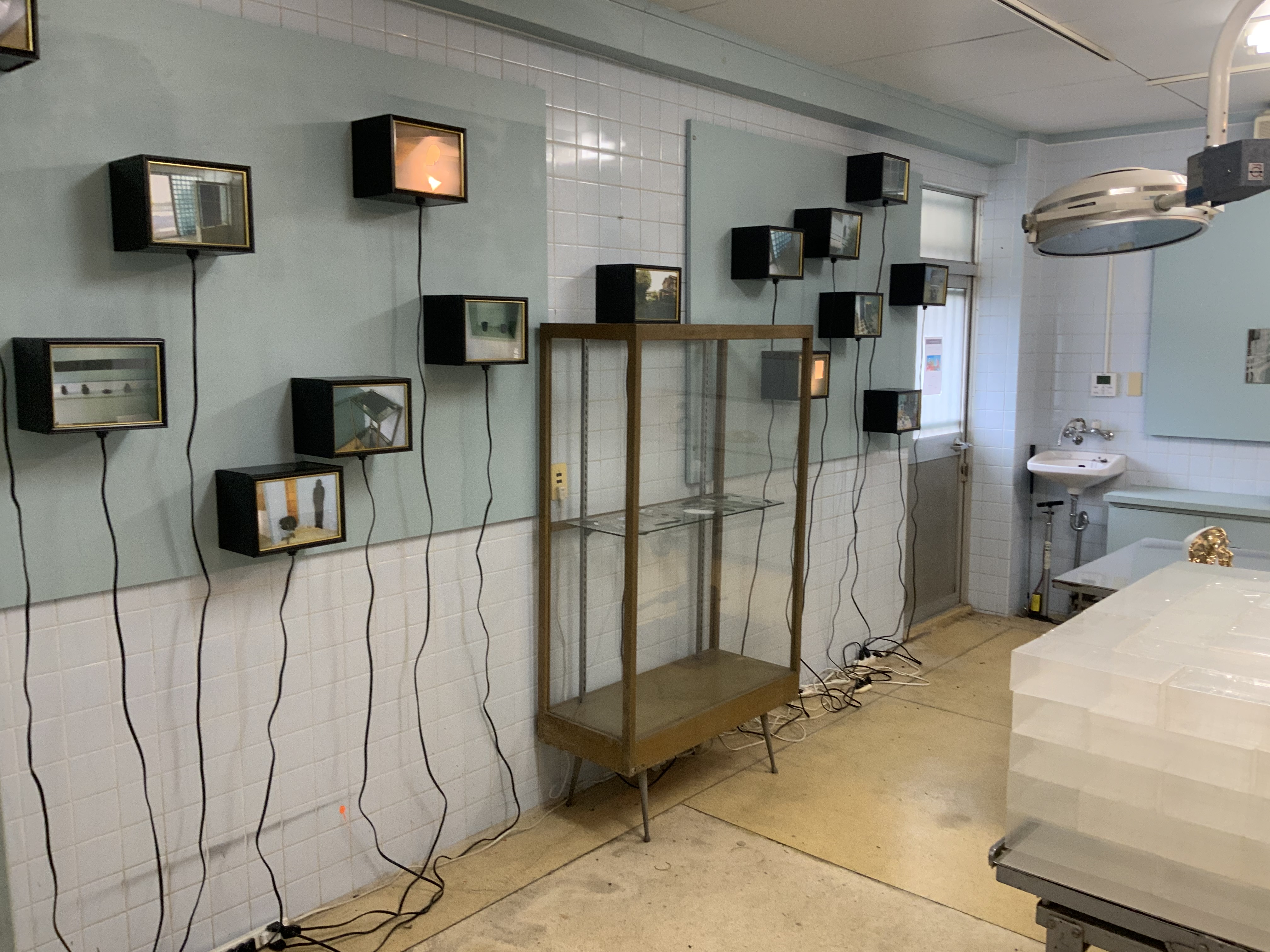 (手前手術台上)横溝美由紀 "aero_box" (左パネル) 森秀信 "An artist is here, and is not here" (正面ライトボックス) 鈴木淳「空色の森」2021年 |