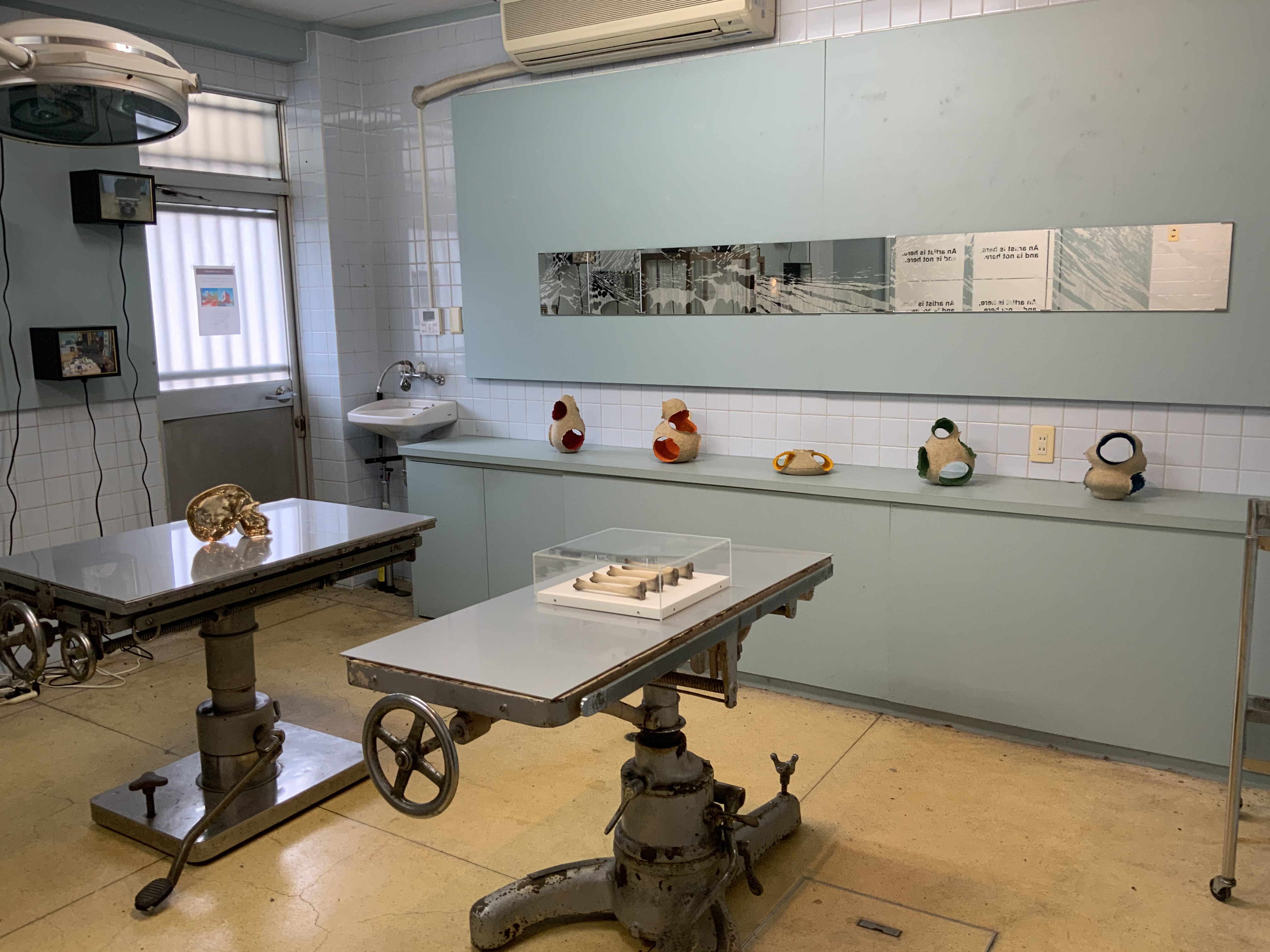 (手前手術台上) 大西伸明 "BONE" "VACUUM SKULL" (正面パネル) 中西信洋"Stripe drawing on mirror-Sayagatani 1-6" (正面台上)"Open cave-Red, Orange, Yellow, Blue, Green"