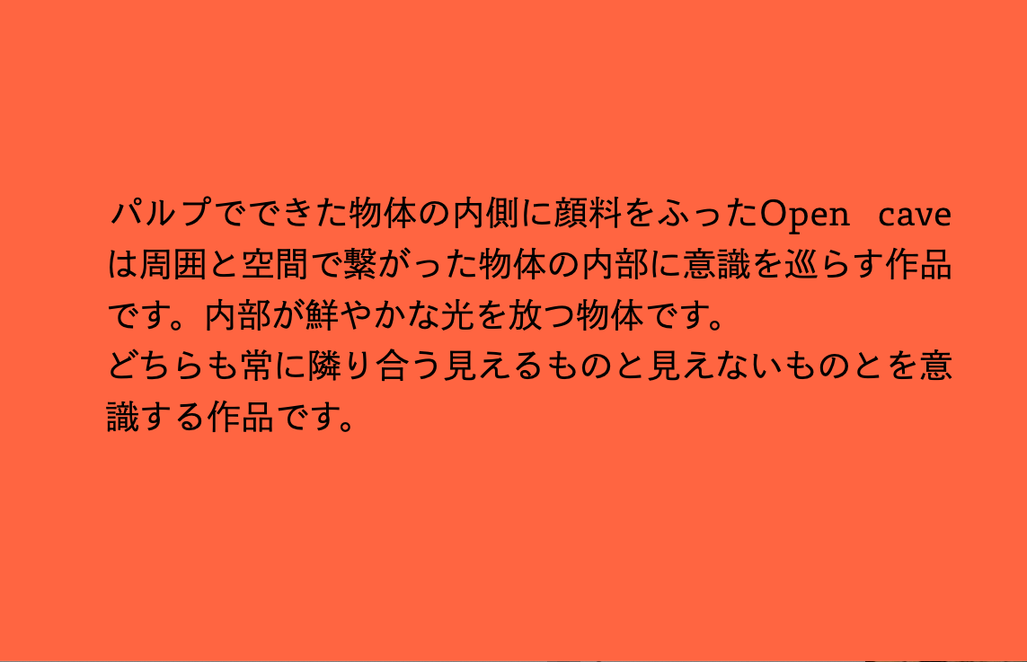 それから50年以上の時を隔てて北九州の小さなスペースで開かれた「VACUUM 空色(からいろ)の部屋」展。ここで「実在/不在」というテーマの現在性について記すべきなのかもしれないが、展示を見て、この普遍的テーマは今や作家各々の問題系のうちにあるように思え、それらを選び出しまとめた真武の嗅覚と手腕に改めて敬意を捧げたい。個人的には「実在/不在」への問いの、千差万別のあらわれ方に興味をひかれた。空っぽの容器や部屋、言葉に、実に豊かな想像力が呼び込まれた。大西と中西が見せる表面への執拗な執着は、実在物の表層を滑り落ちて不在へと着地させて、実在/不在の対立項でない関係性を考えさせられた。古賀と山本の映像の扱い方に、ないはずの重力と手触りを妙に意識させられ、若い世代の感性として印象に残った。