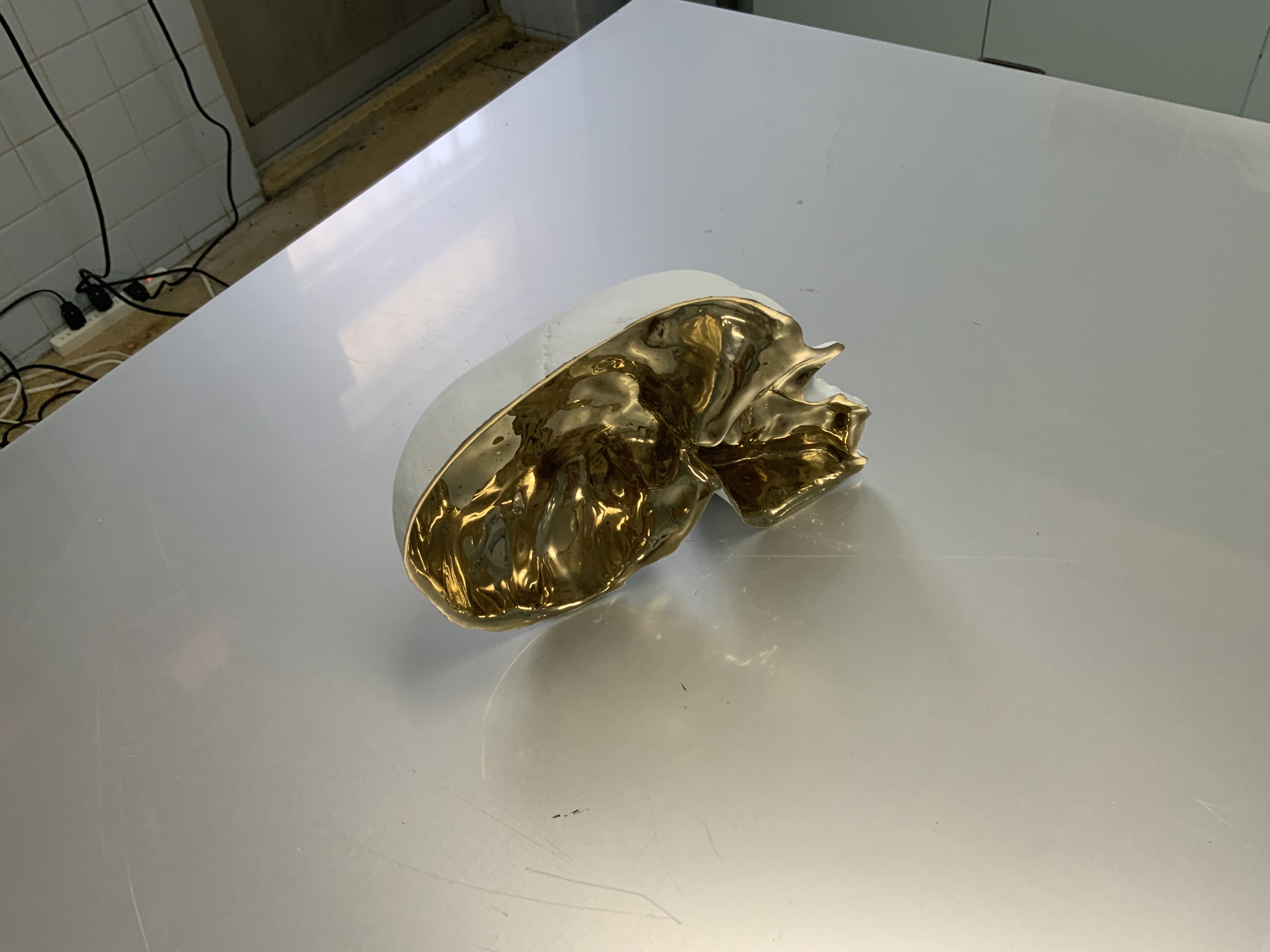 中西信洋は鏡面を削って描いた風景画と、紙製の穴だらけの小彫刻を出品。ひとりの作家のなかにある硬軟の対比が興味深い。手前のステンレス製の台には、大西伸明の精巧な骨の写し4体と、内側が鏡面となり周囲の光を反射する髑髏が置かれている。目に見える世界と実体の乖離、その途方もない距離感を演出する手並みに圧倒させられる。