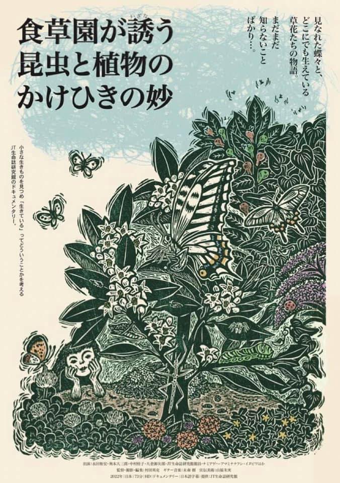 この展覧会はJT生命誌研究館作映画『食草園が誘う昆虫と植物のかけひきの妙』の北九州市での上映を記念して企画されたものです。監督・撮影・編集は村田英克、ギター音楽を末森樹が、そして宣伝美術を山福朱実が担当しました。