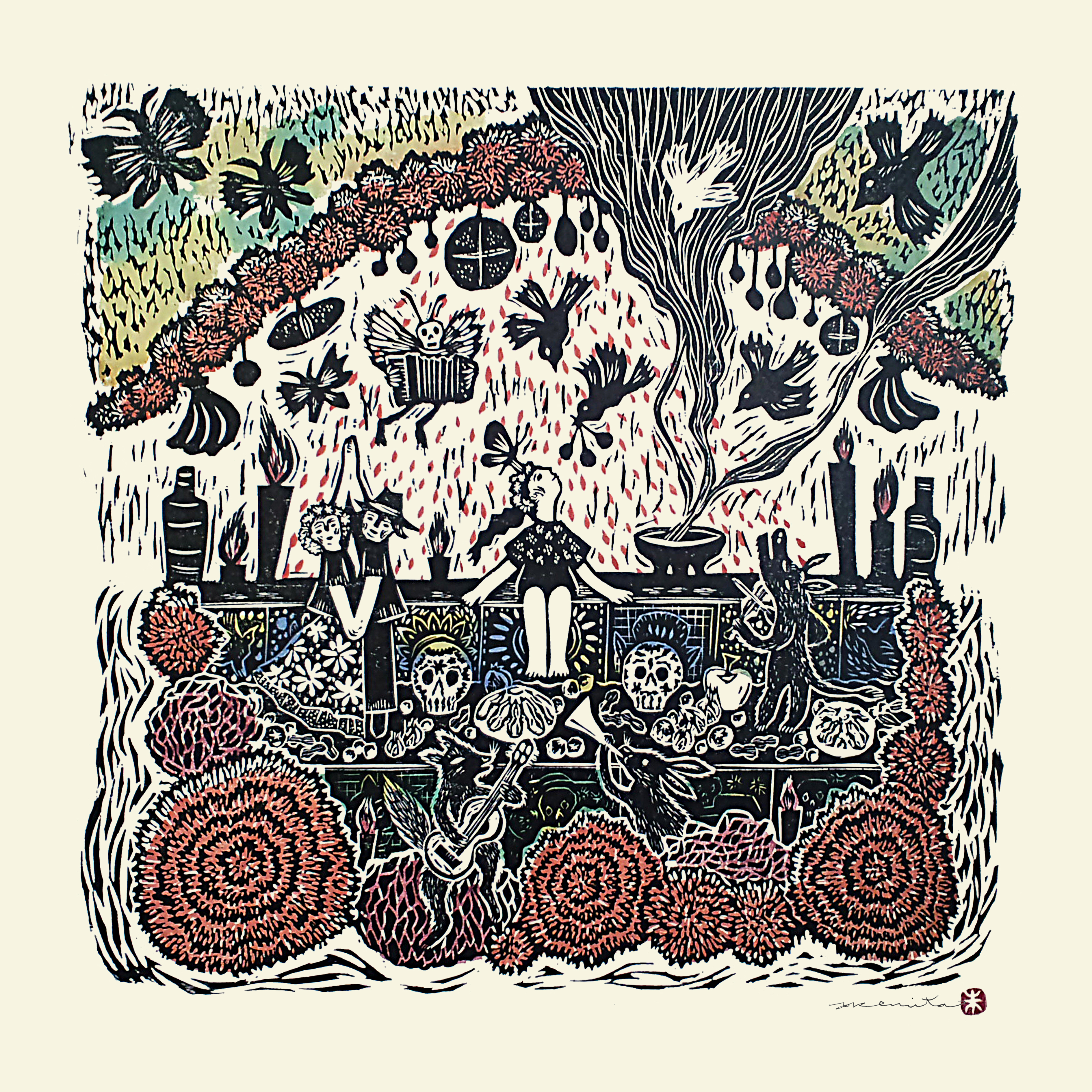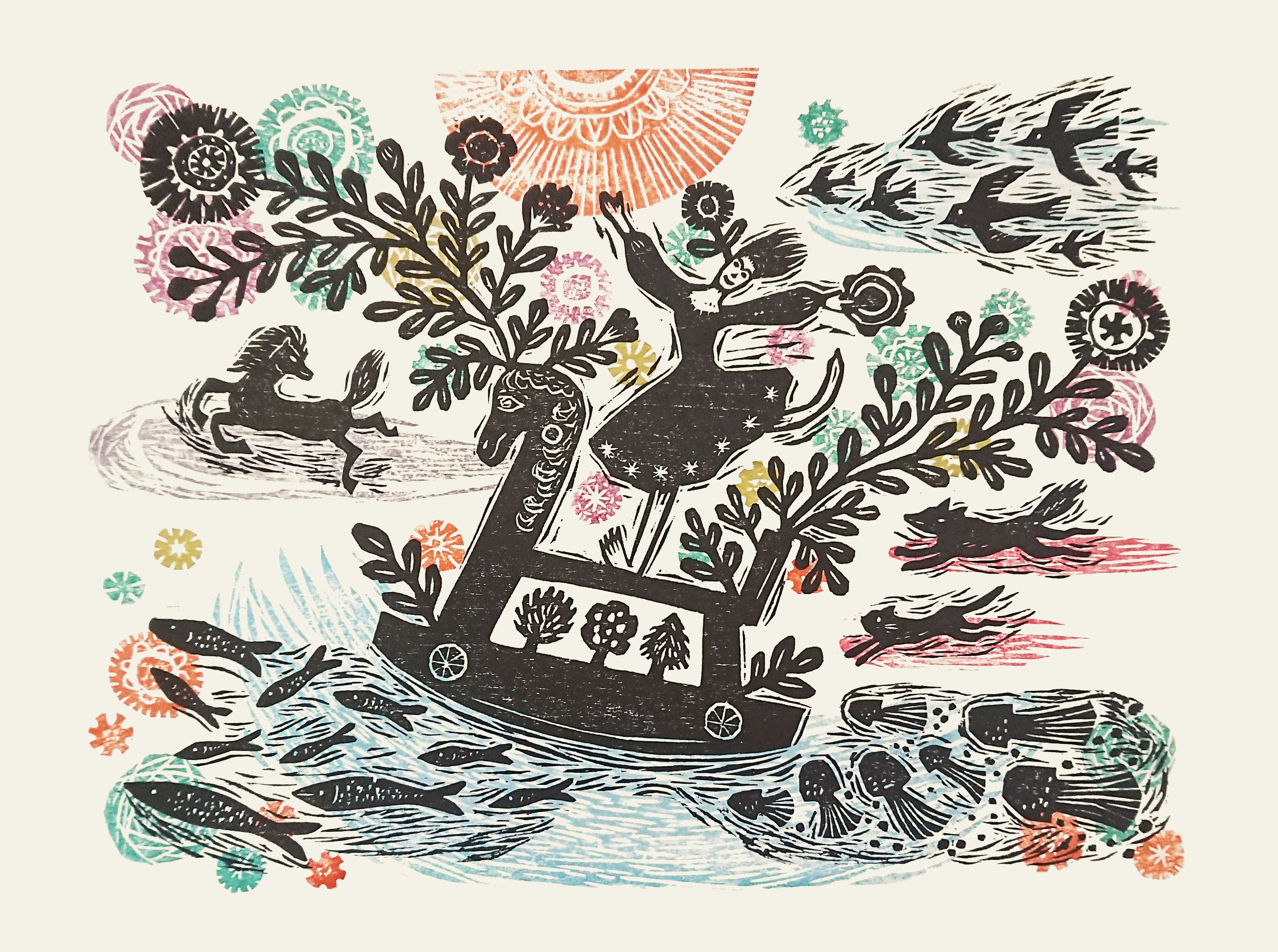北方シネマ、こうじゃくシネマ、東田シネマの市内3ヶ所で開かれる上映会に合わせて、山福朱実の版画作品展も市内3ヶ所で同時開催となります。しかも各会場によって展示内容も異なるという豪華なプログラムです。もちろん会場ごとにもれなく末森樹とのギターと歌のライブも行われることになっています。