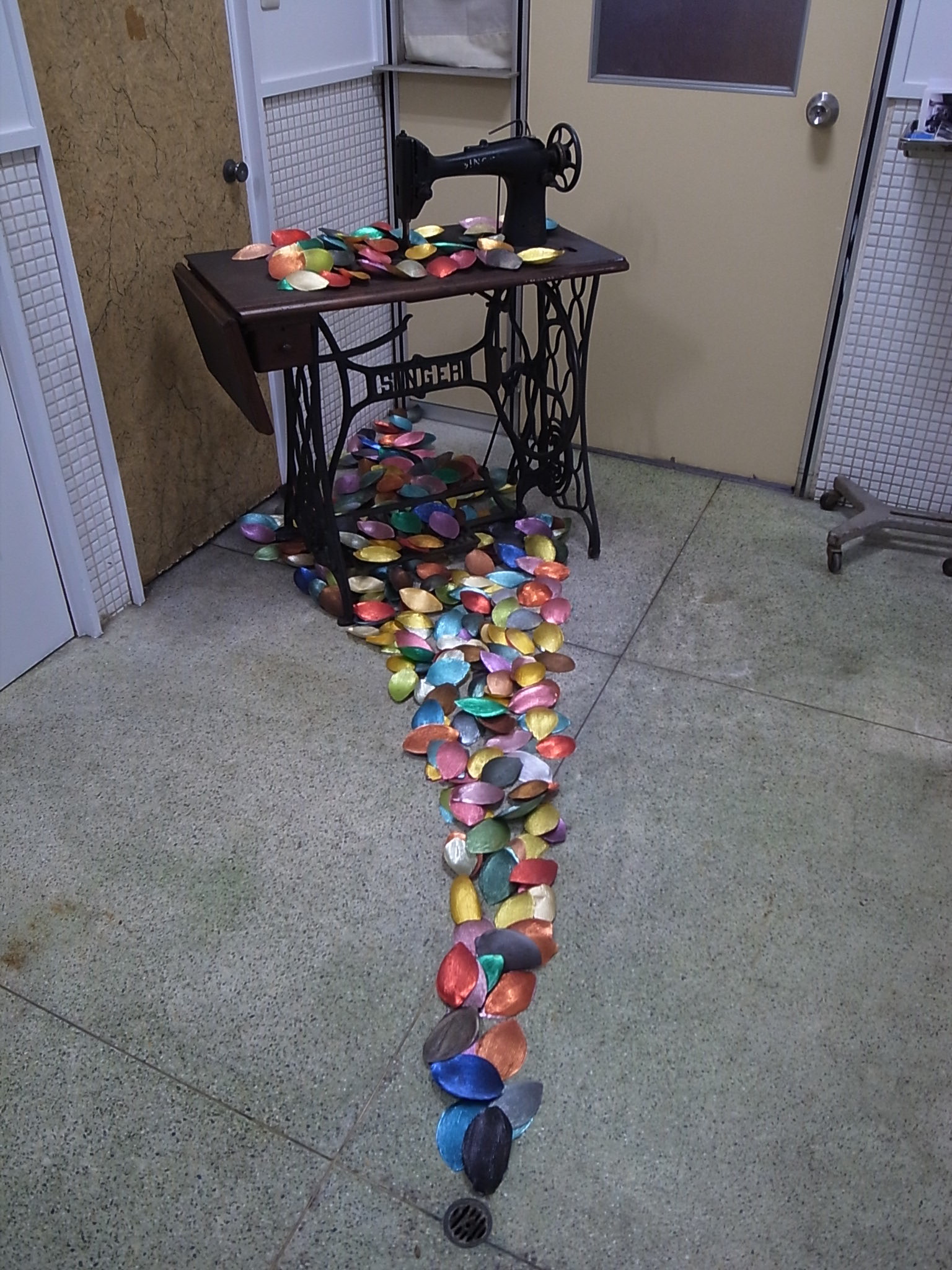 手術台のある診察室から短い通路を抜けて受付のある待合室に出る。受付のボックス内には、あちらこちらに絵の具のチューブ様の物体をねじった銀色の作品が置かれている。“重さ”を感じる点で、他の作品と異質だ。とっさに、やや無骨な指先で作者がこれらのチューブをキュイっ、キュイっと苦もなくひねりあげる様子が頭に浮かぶ。もちろん本当に手でひねっているかどうかは分からないが、なにかしら“身体”を感じさせる作品である。