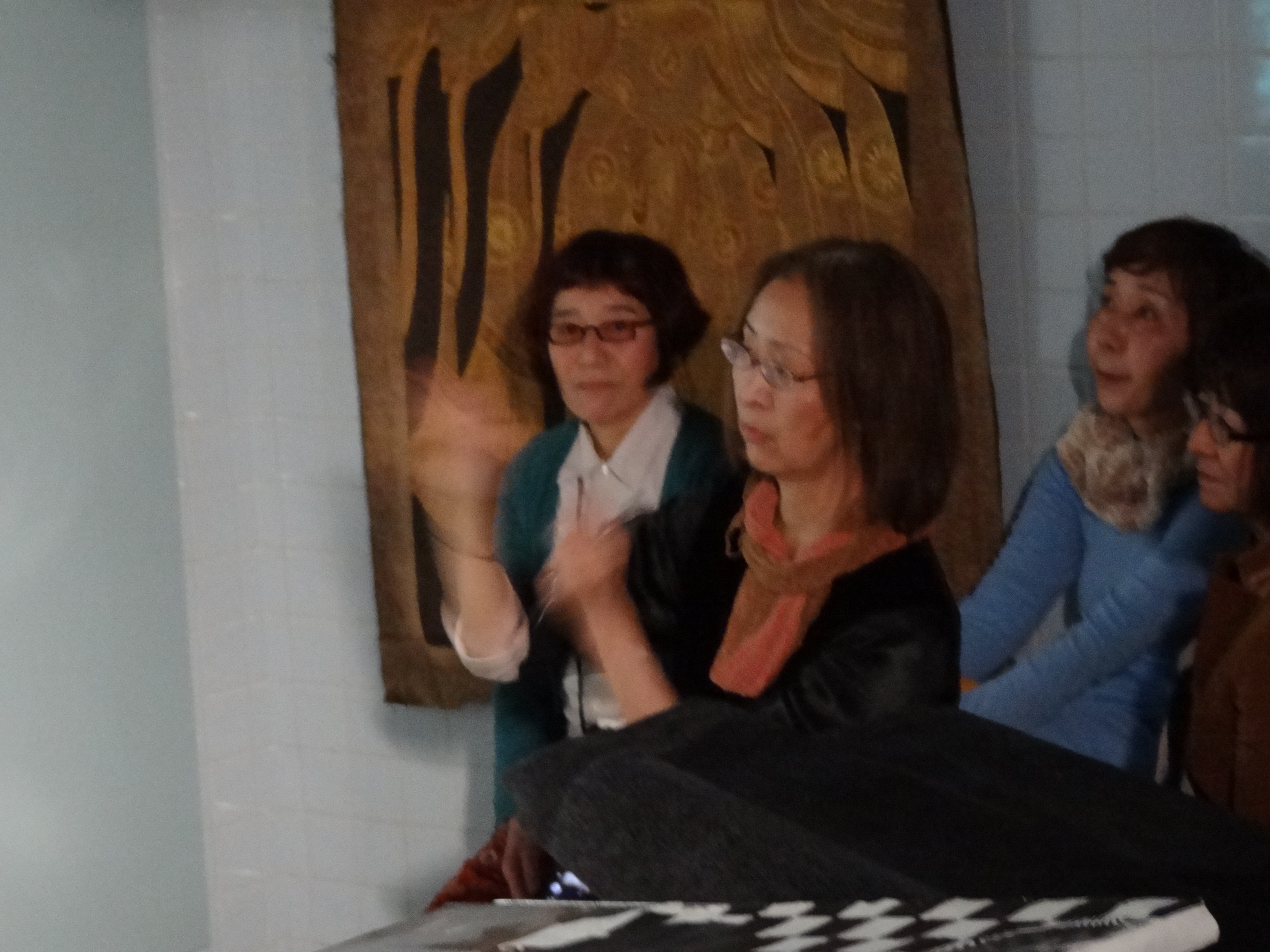 久留米絣の藍染リサーチから始まって、藍の様々な在りように魅せられ藍の世界に浸かっていく草野の報告、インドネシアでバティックの工房を訪ね、手のひらの上で布に蝋描きするチャンティンの技法を学びながら自身の絵画制作にも影響を受けていった田中の体験が語られ、両者から今後の制作の方向までをお聞きしました。