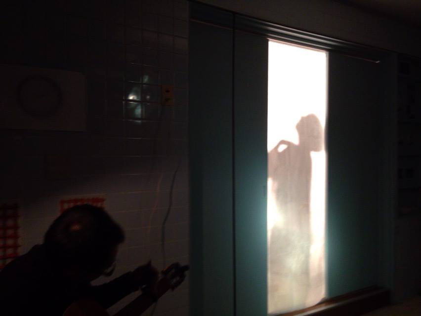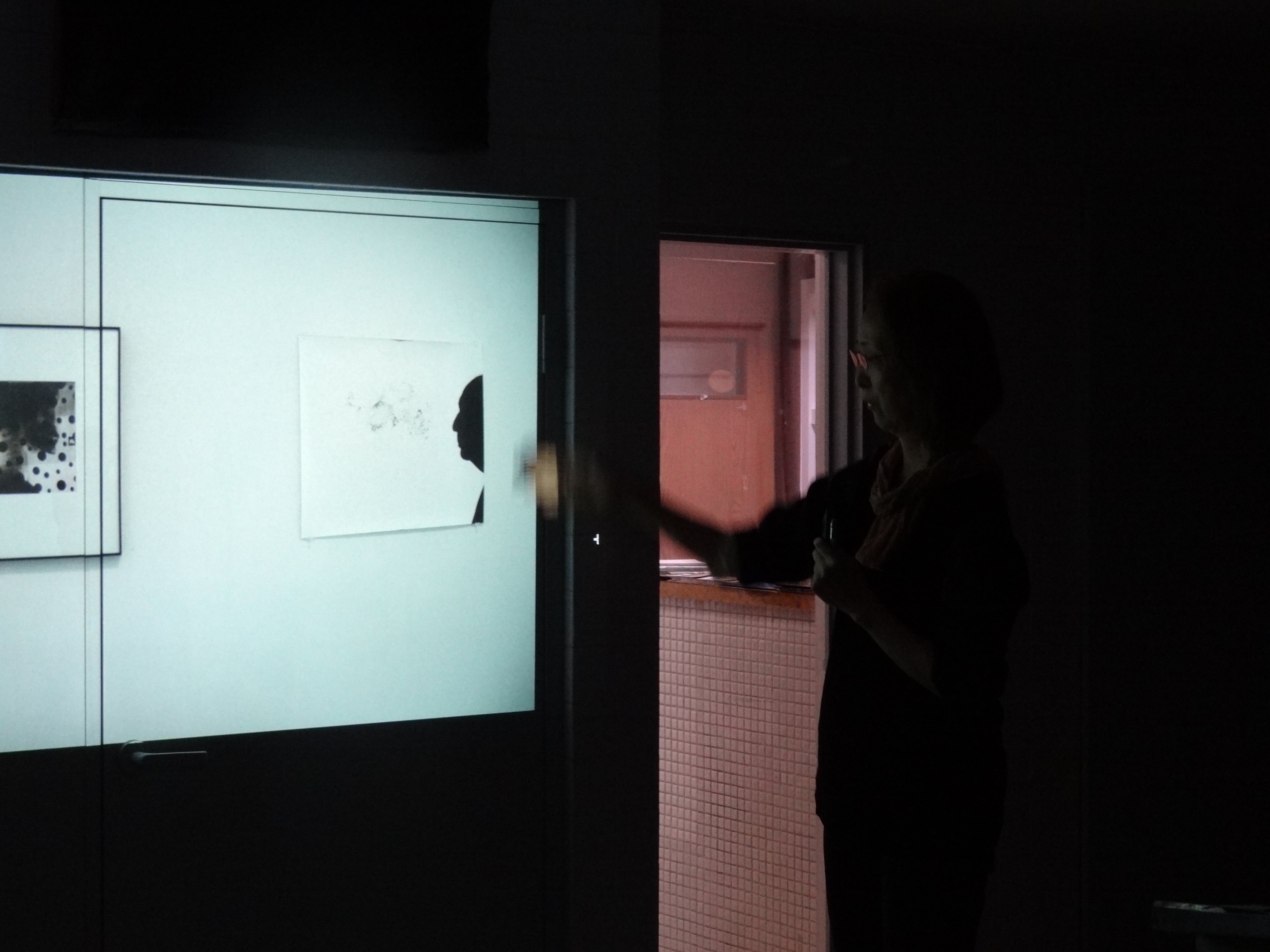 村田はO-Haraの展示が、元動物病院であったOperation Tableに動物の動きを写したLive Transmissionを集めたものであったこと、先行するオープニング・イベントが暗闇の中で行われたことを受けて、暗闇の中のふたつの空間を仕切る板扉をボールペンによるドローイングの力一杯の筆触でこじ開け、扉の反対側にいた観客の方へ光を開示するというパフォーマンスをおこないました。ドローイング・アクションを行う村田の側からは、競馬場のレース展開の映像がプロジェクターから投影され、闇の側にいた観客は村田がこじ開けた小さな穴から洩れる揺れ動く光を眼で追いながら、最後に穿たれた大きな穴から村田の姿と走る馬の全体像が現れるまでを、息をのみつつ見とどけ圧倒されたのでした。